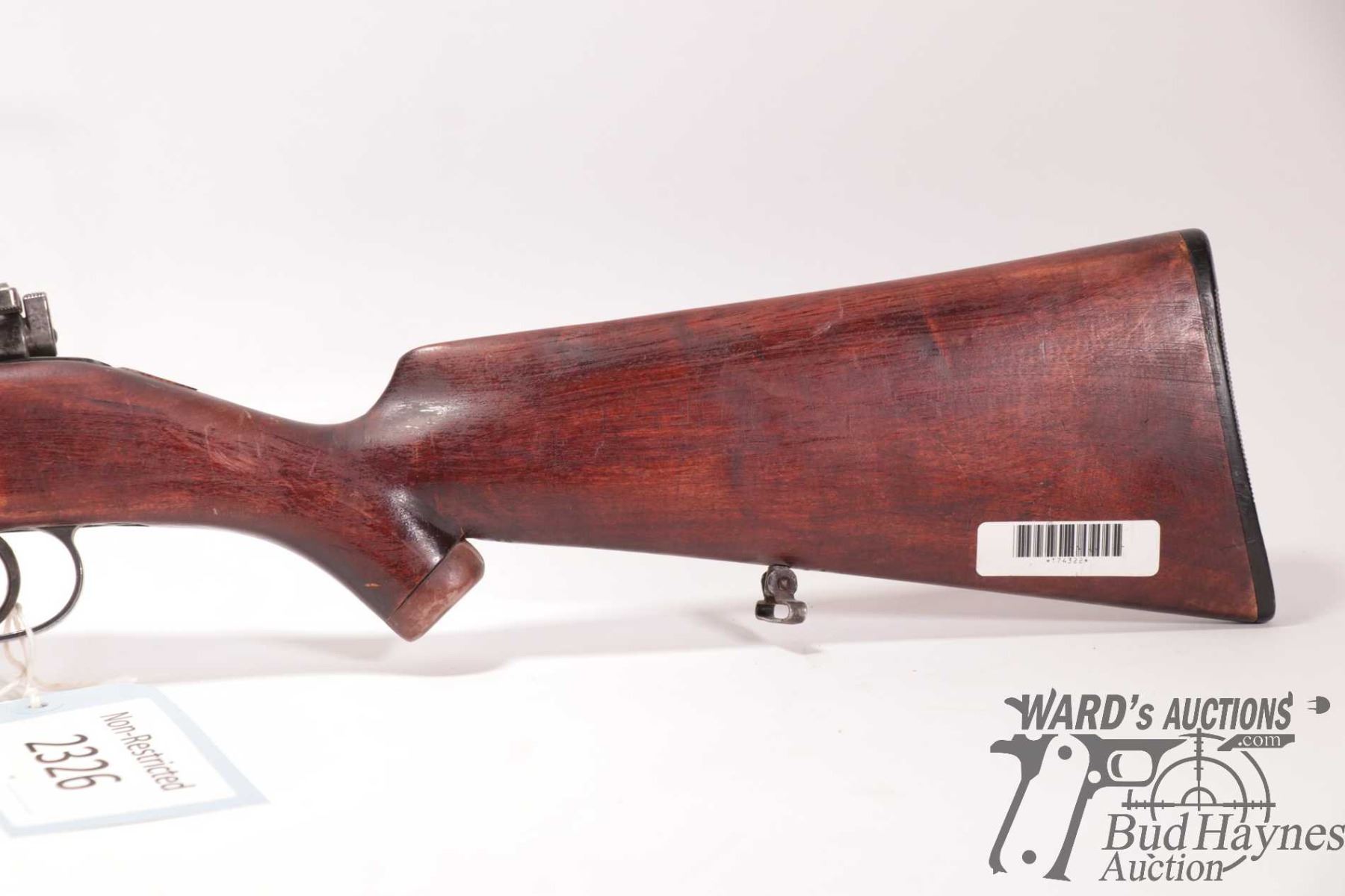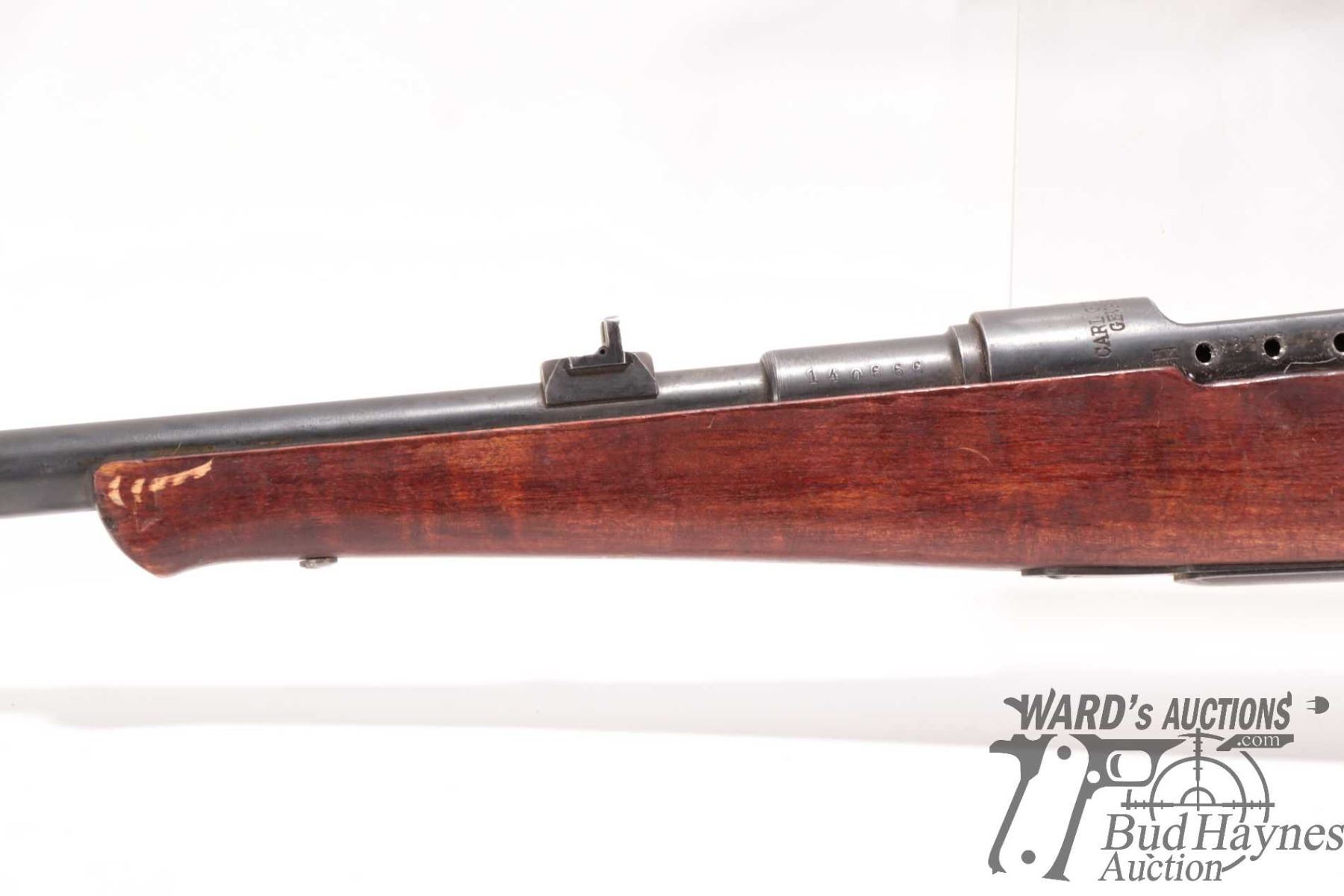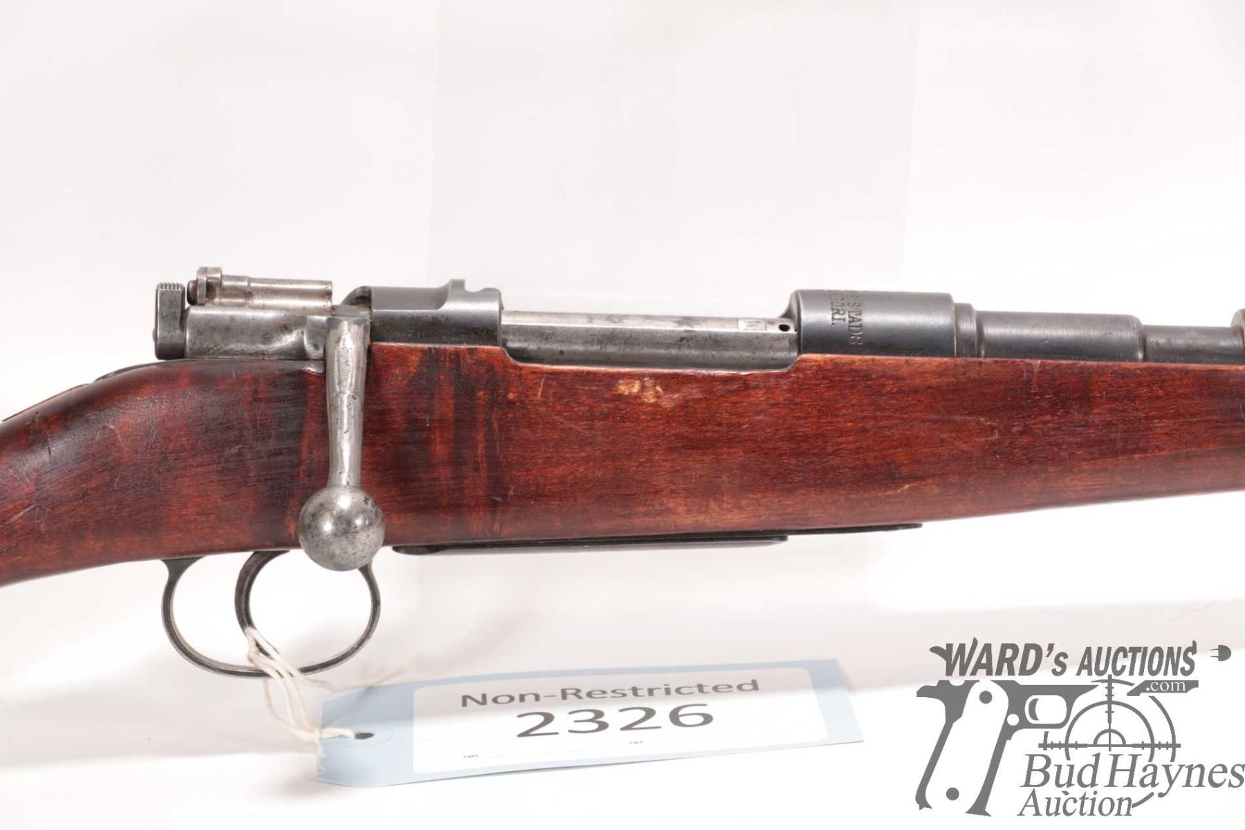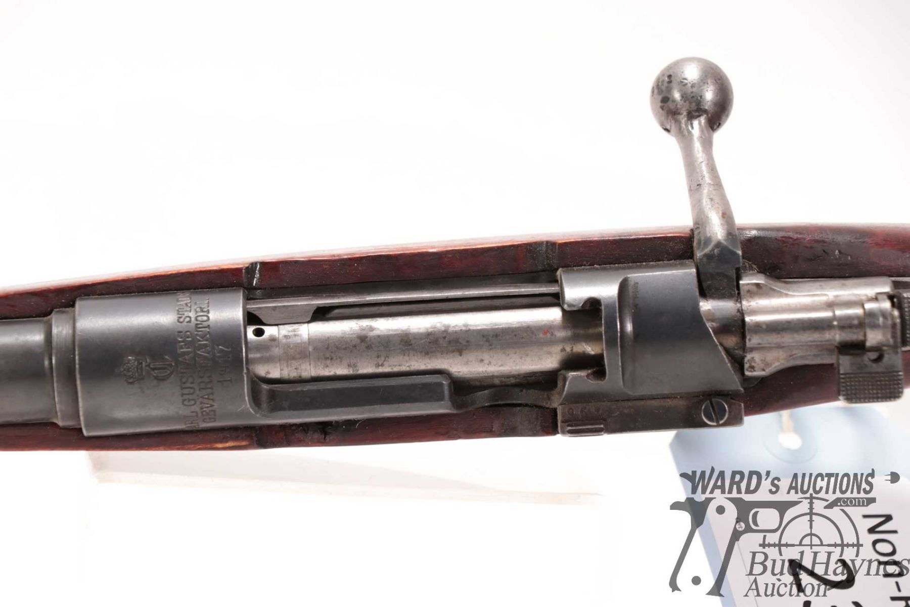 Non-Restricted rifle Carl Gustaf model Mauser, 8MM Mauser bolt action, w/ bbl length 26" [Blued barrel and receiver. Fixed front with flip-up wafer rear sight, note: wafer is missing and only fixed sight remains. Internal box magazine. Hardwood stock with plastic butt plate. Non-matching serial numbers on barrel, receiver and bolt. Left side of receiver drilled and tapped for scope mount. Mechanically appears to function. Bluing worn in use and handling areas. Stock appears stripped and refinished and possibly slightly reshaped around grip area and fitted with non-original button. Cracked at top behind action and other use, handling and storage marks.] serial # 140666, PAL required