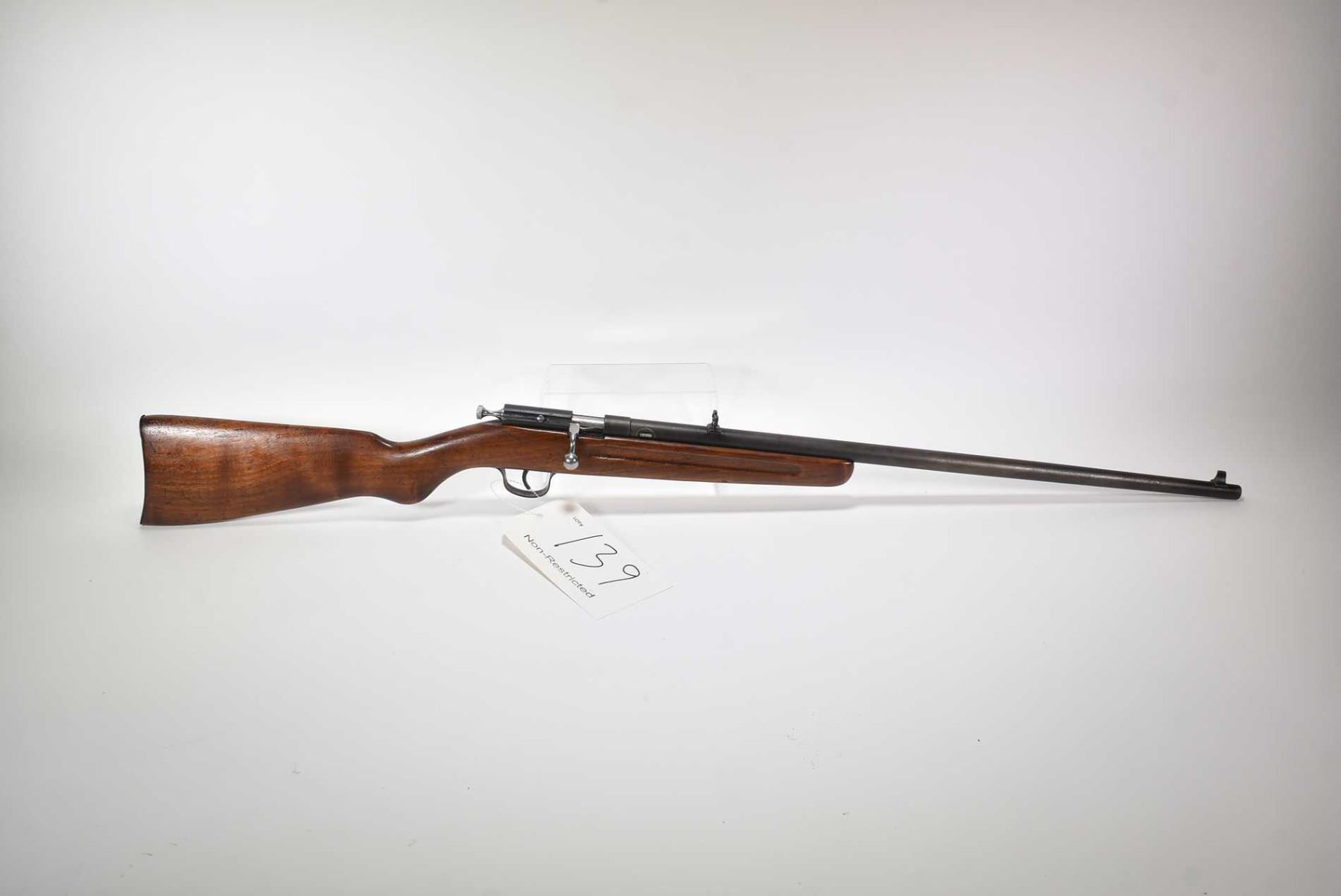 Non-Restricted rifle Cooey .22 LR single shot bolt action, w/ bbl length 24" [Blued barrel with fixed front sights and adjustable rear. Metal has signs of old pitting and refinishing. Smooth one piece stock, also refinished.] serial # NIL, PAL required