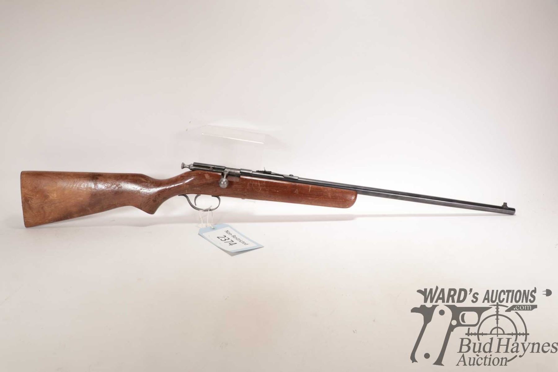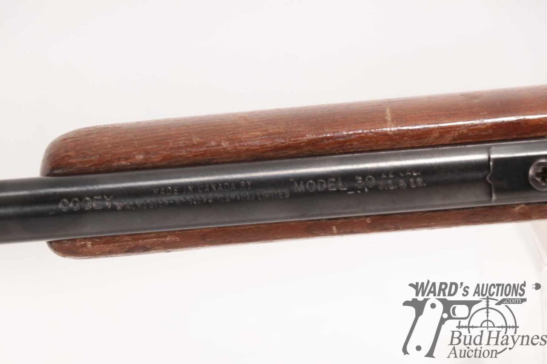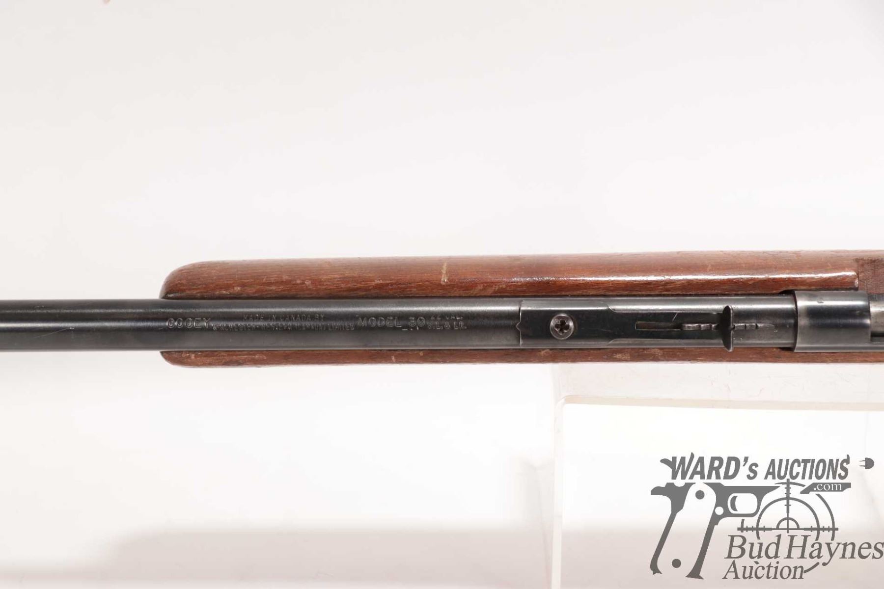 Non-Restricted rifle Cooey model 39, 22 S, L & LR Single shot bolt action, w/ bbl length 22" [Blued finish. Fixed front and adjustable rear sights. Smooth wooden stock with metal butt plate. Mechanically appears to function reasonably well. Bluing worn in use and handling areas, nicks and dings and other use, handling and storage marks.] serial # NIL, PAL required