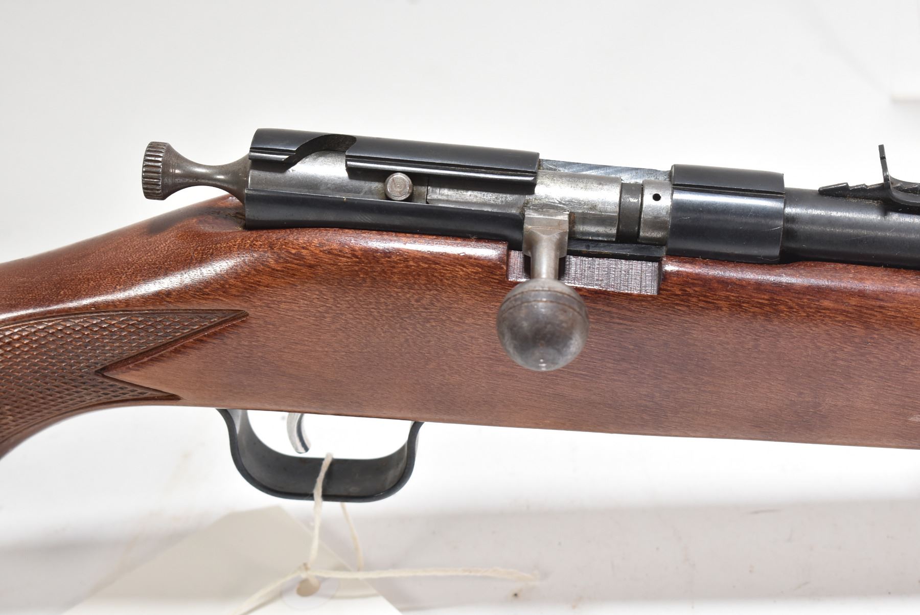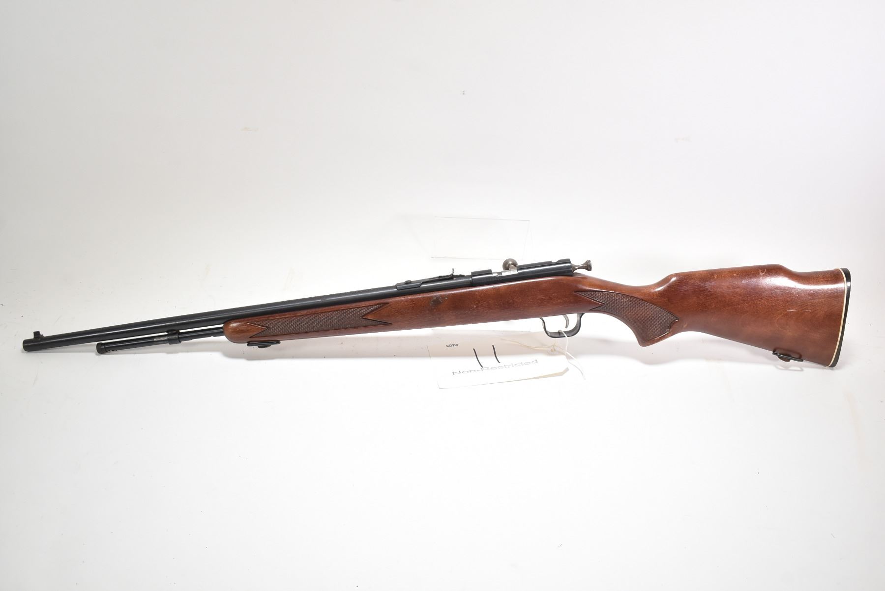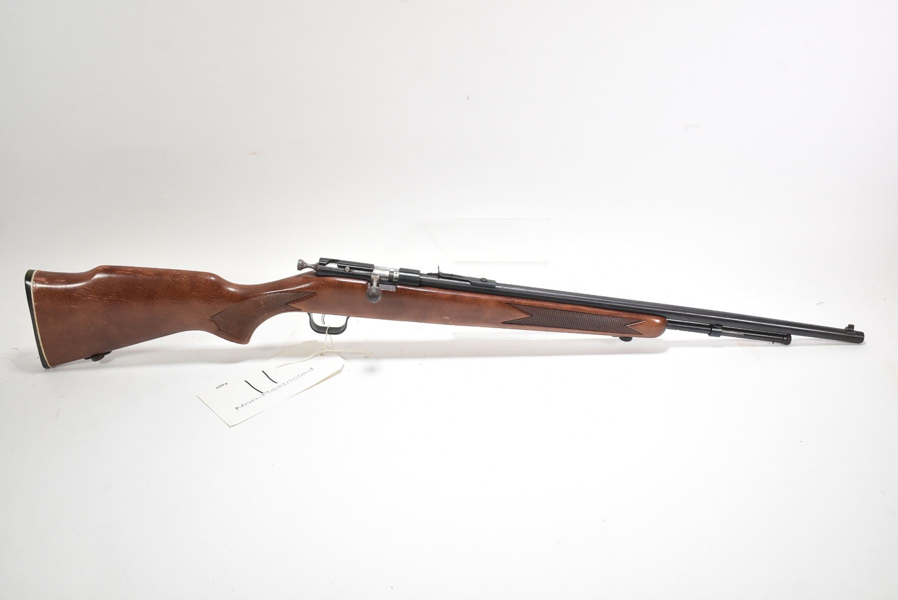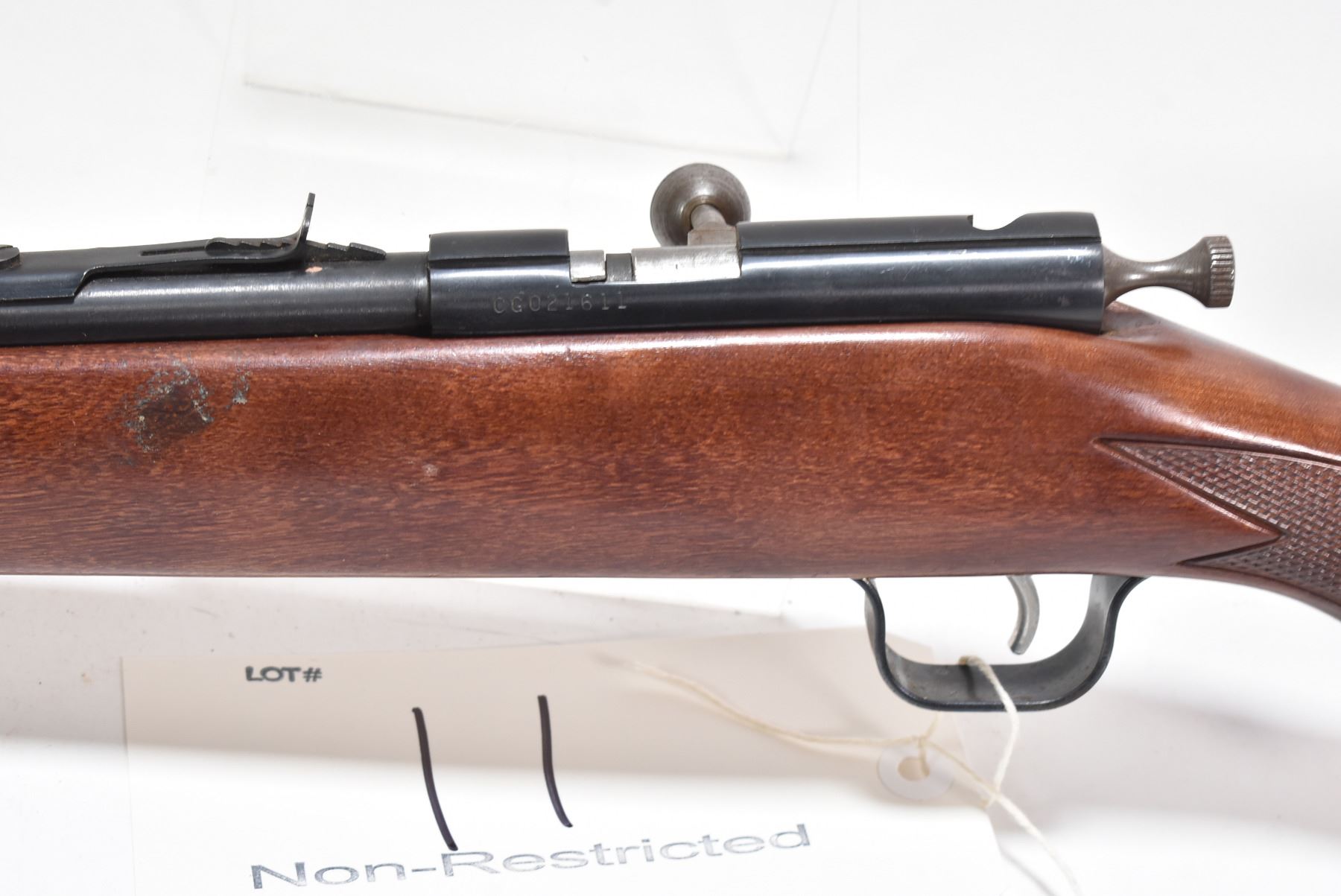 Non-Restricted rifle Cooey model 600, .22 S, L & LR tube fed bolt action, w/ bbl length 22" [Blued barrel and receiver. Fixed front and elevation adjustable rear sights. One piece wooden stock with checkered pistol and foregrip. Branded checkered butt plate. Fitted with sling rings. Worn in handling and use areas with nicks, marks and scratches on wood and metal.] serial # CG021611, PAL required