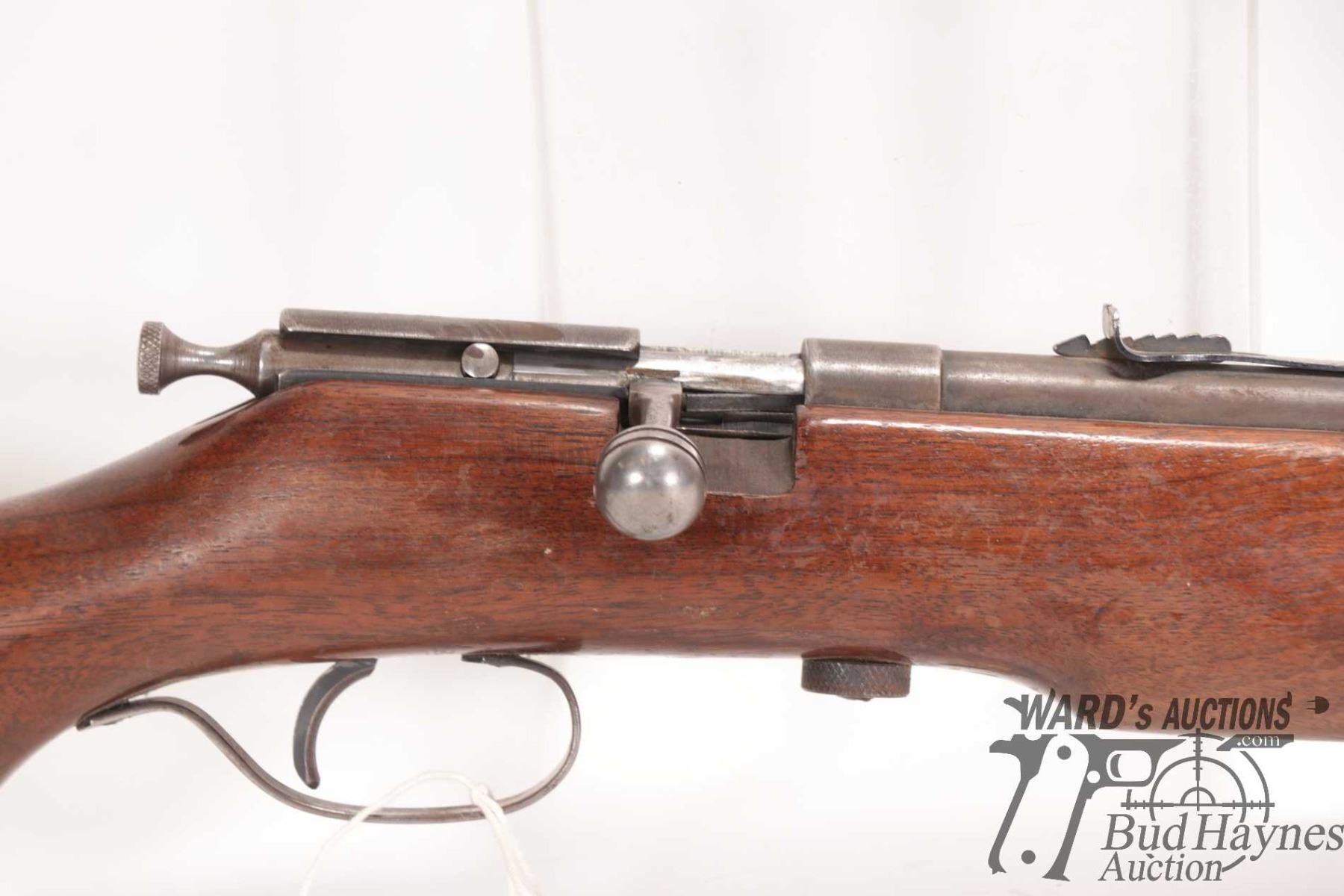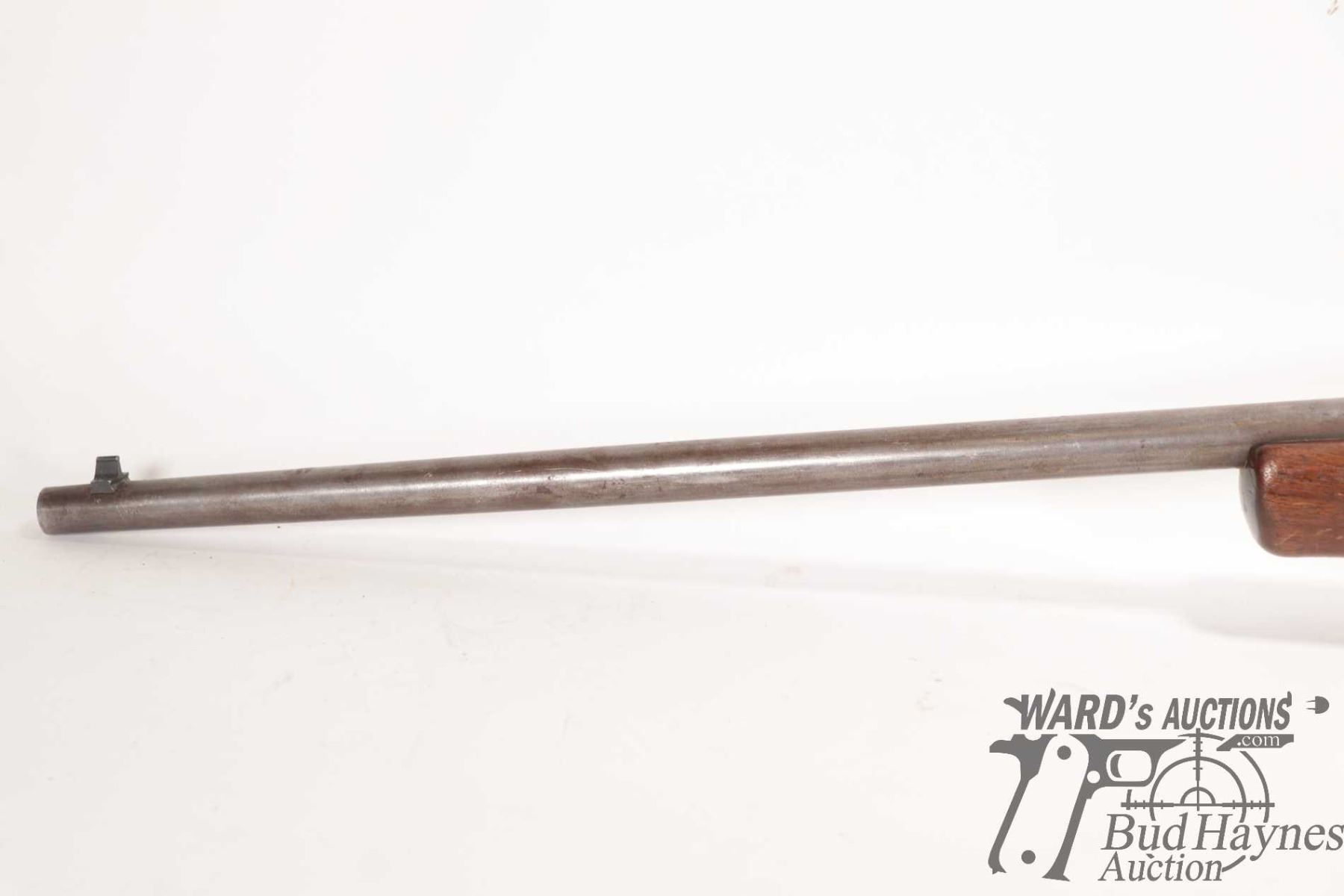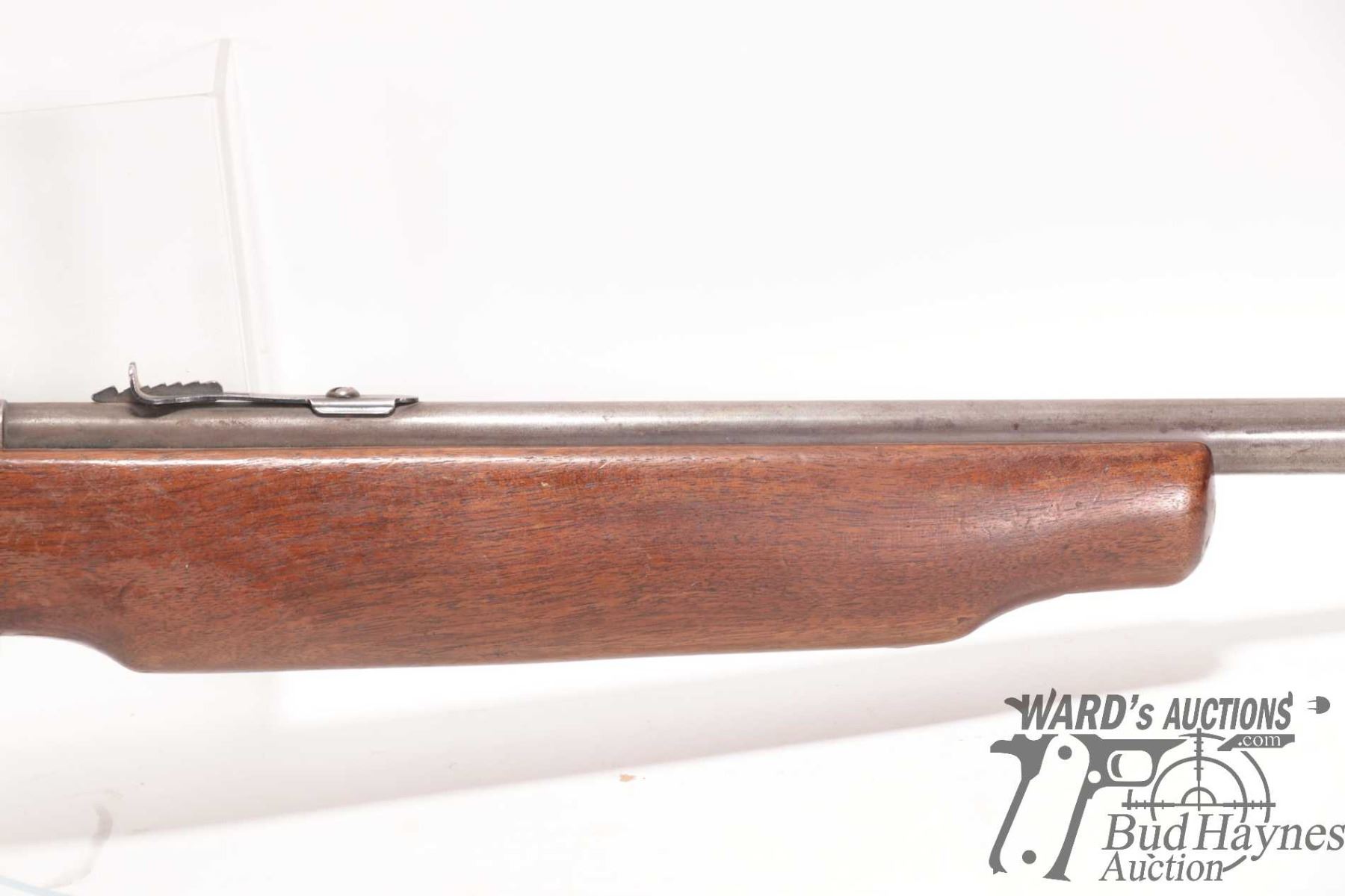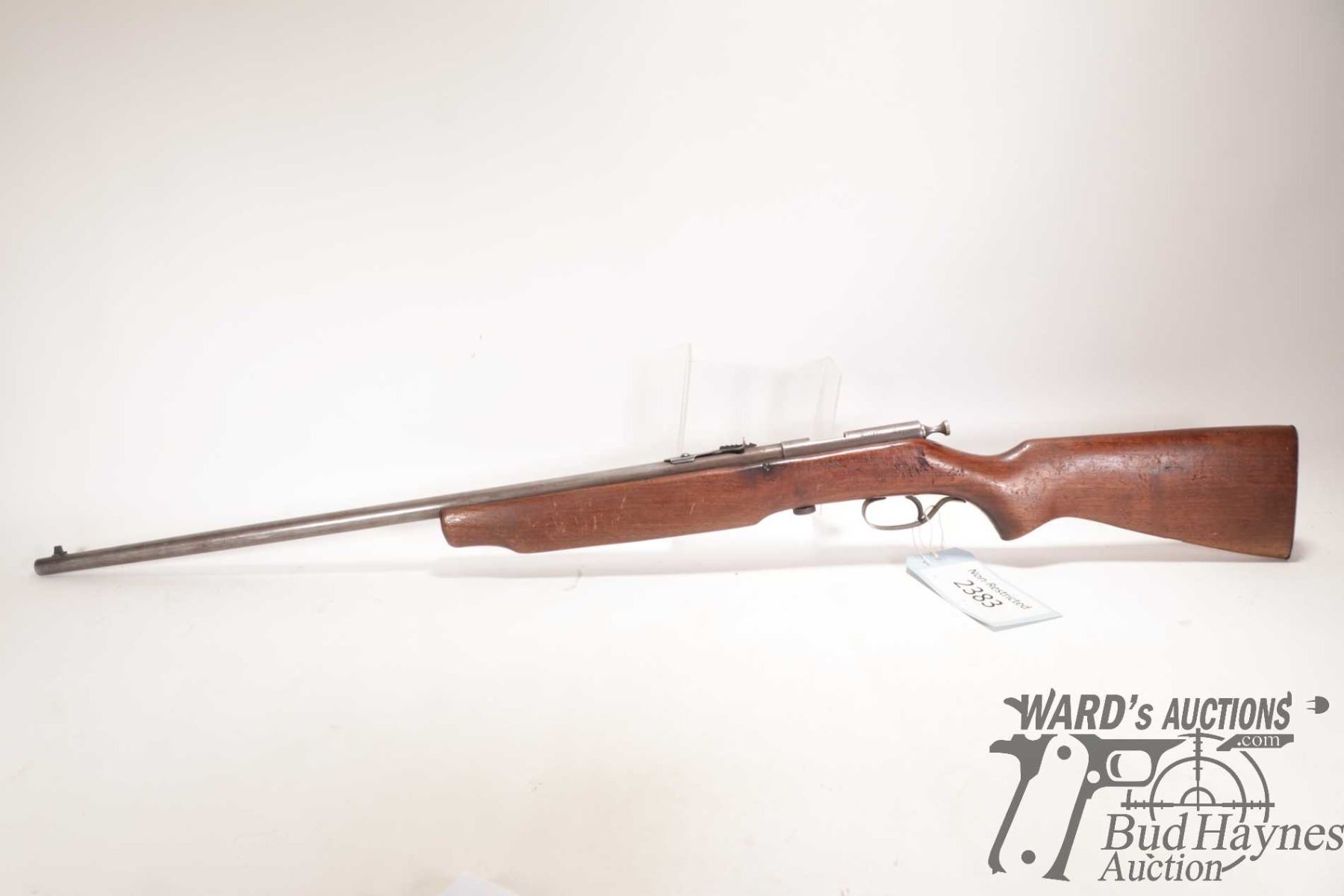 Non-Restricted rifle Cooey model 75, 22 Single shot bolt action, w/ bbl length 26 1/2" [Blued barrel and receiver. Fixed front sight and elevation adjustable rear sight. Smooth wooden stock with metal butt plate. Mechanically appears to function well. Virtually all bluing worn and turning brown. Stock has large nicks and gouges plus other use, handling and storage marks on wood and metal.] serial # NIL, PAL required