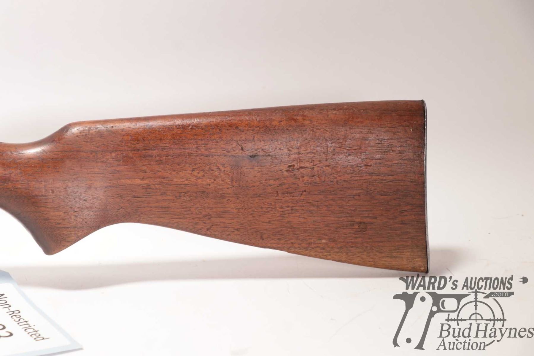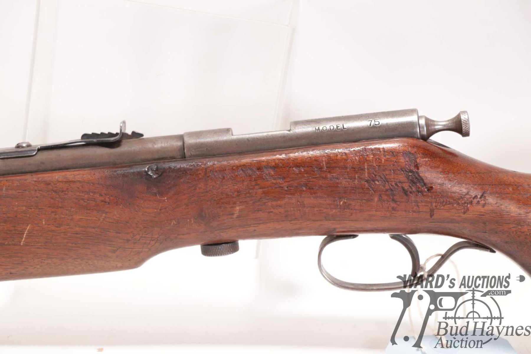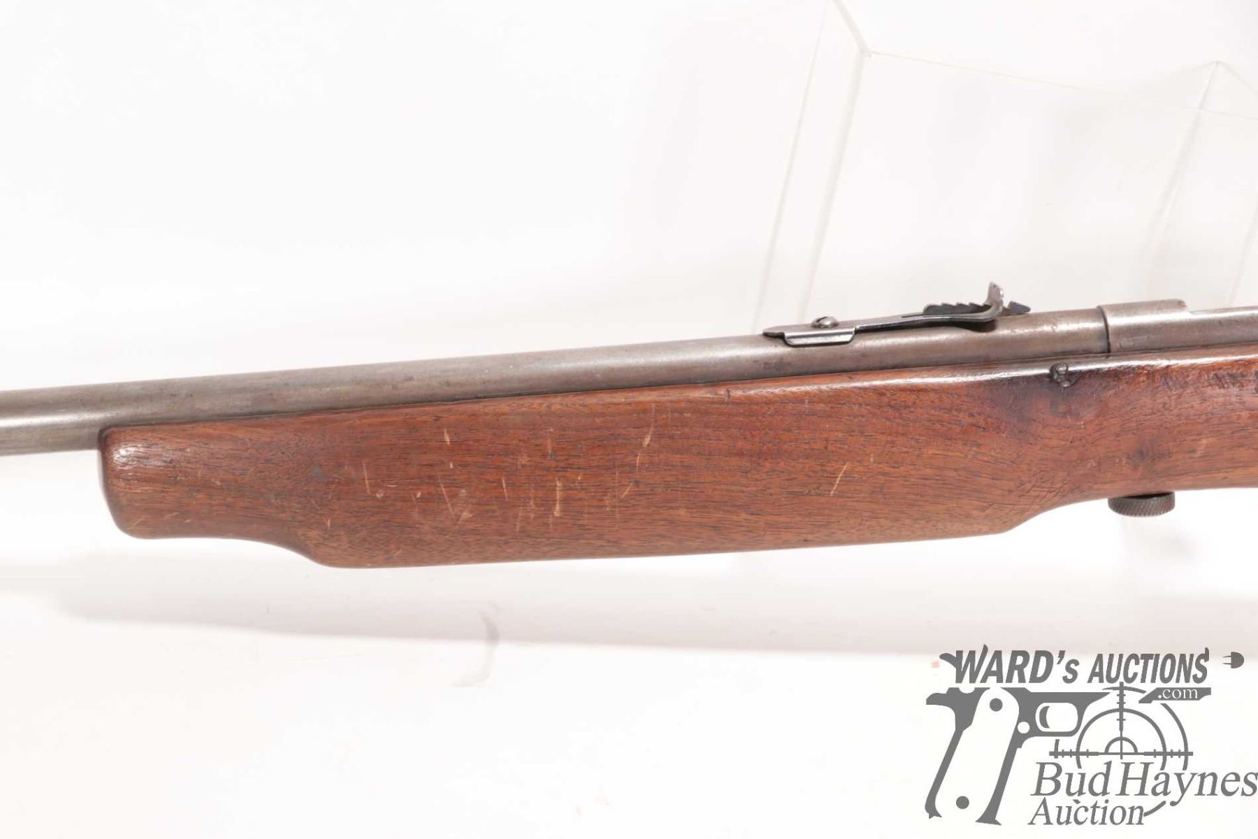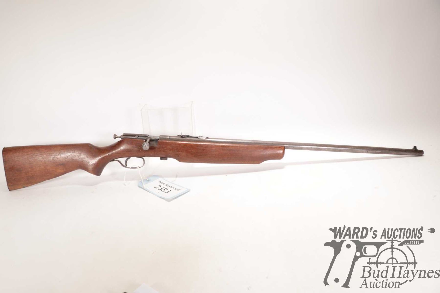 Non-Restricted rifle Cooey model 75, 22 Single shot bolt action, w/ bbl length 26 1/2" [Blued barrel and receiver. Fixed front sight and elevation adjustable rear sight. Smooth wooden stock with metal butt plate. Mechanically appears to function well. Virtually all bluing worn and turning brown. Stock has large nicks and gouges plus other use, handling and storage marks on wood and metal.] serial # NIL, PAL required
