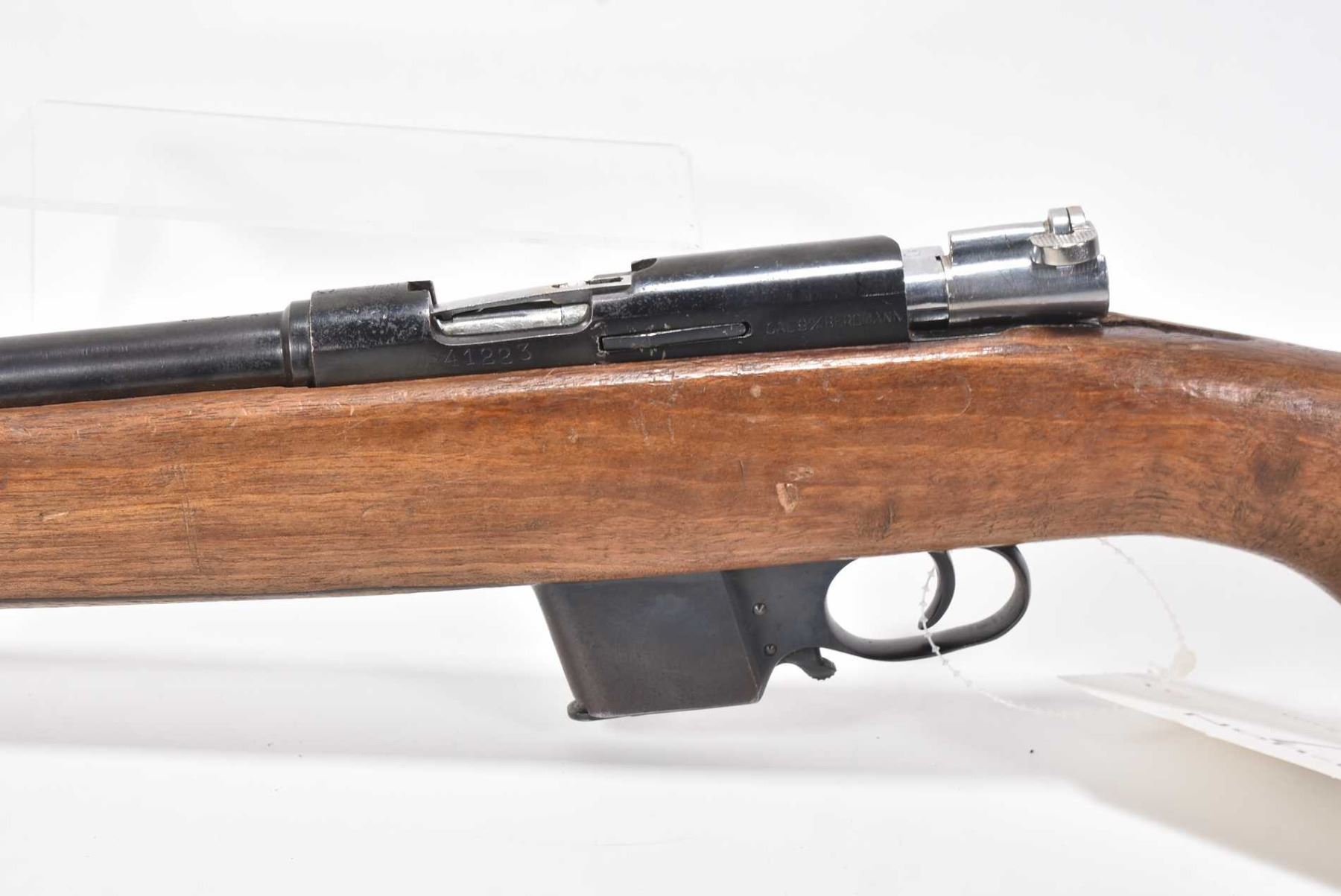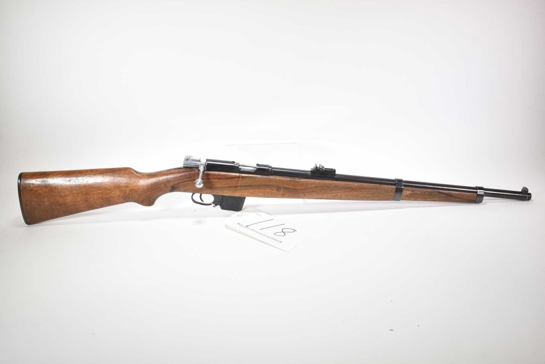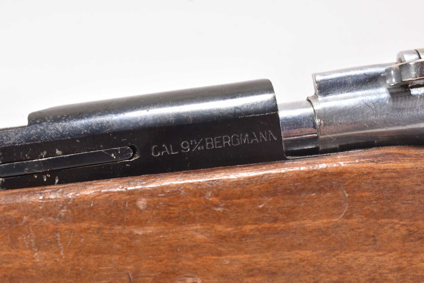 Non-Restricted rifle Destroyer 9x23 mm (Largo)(Bergmann) bolt action, w/ bbl length 21 1/2 [Blued barrel and receiver turning brown/gray, fixed front and adjustable rear sight, smooth wooden stock with metal butt plate and sling mount. Stock and some gouges and scratches including where barrel band was taken off and on, no cracks noted. Includes one removable box magazine. Use, storage and handling marks on wood and metal.] serial # 41223, PAL required