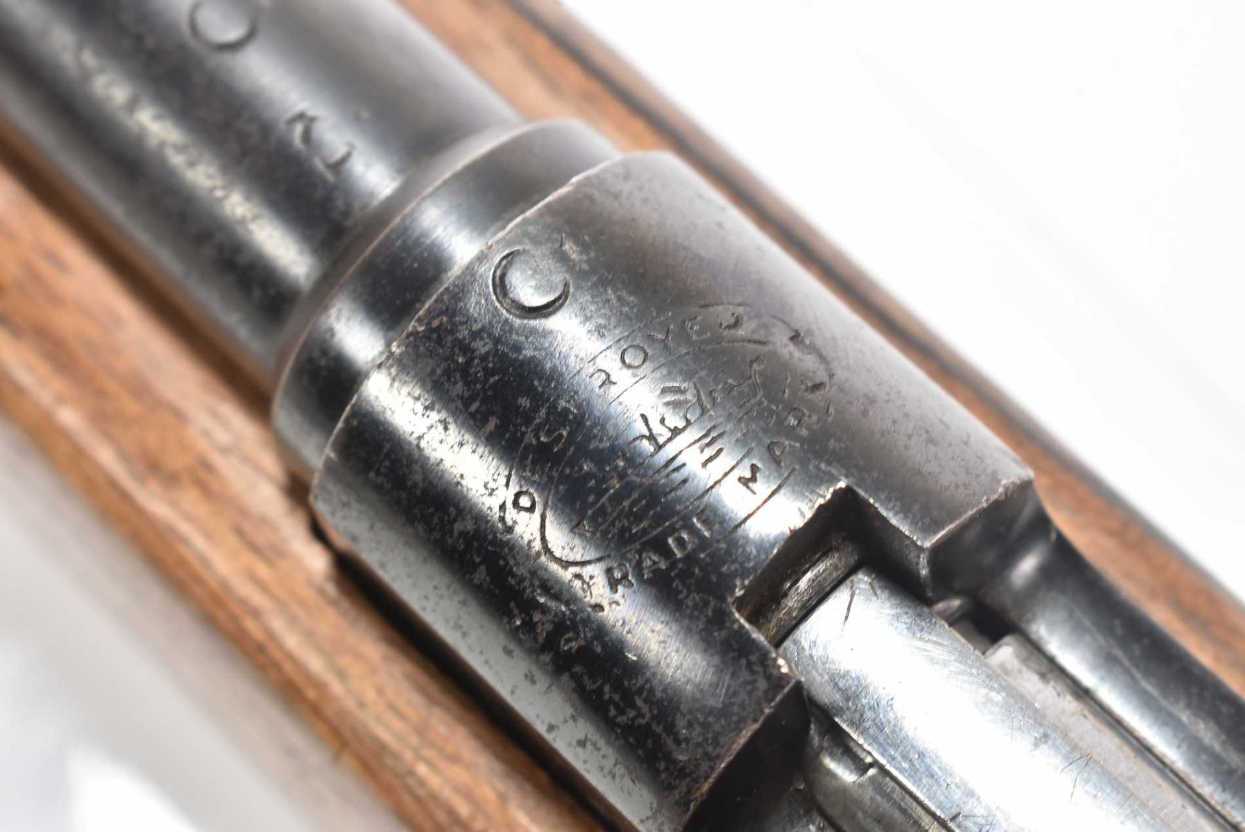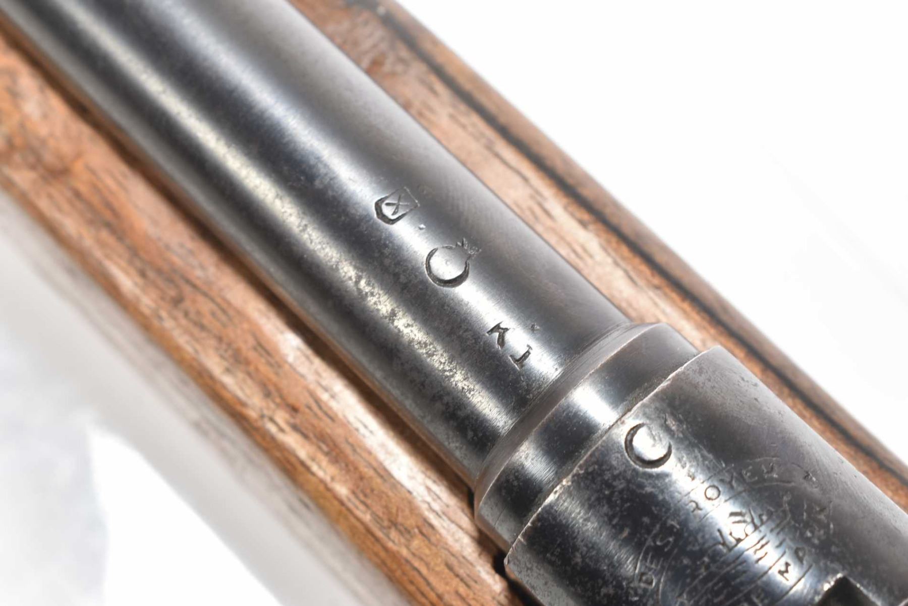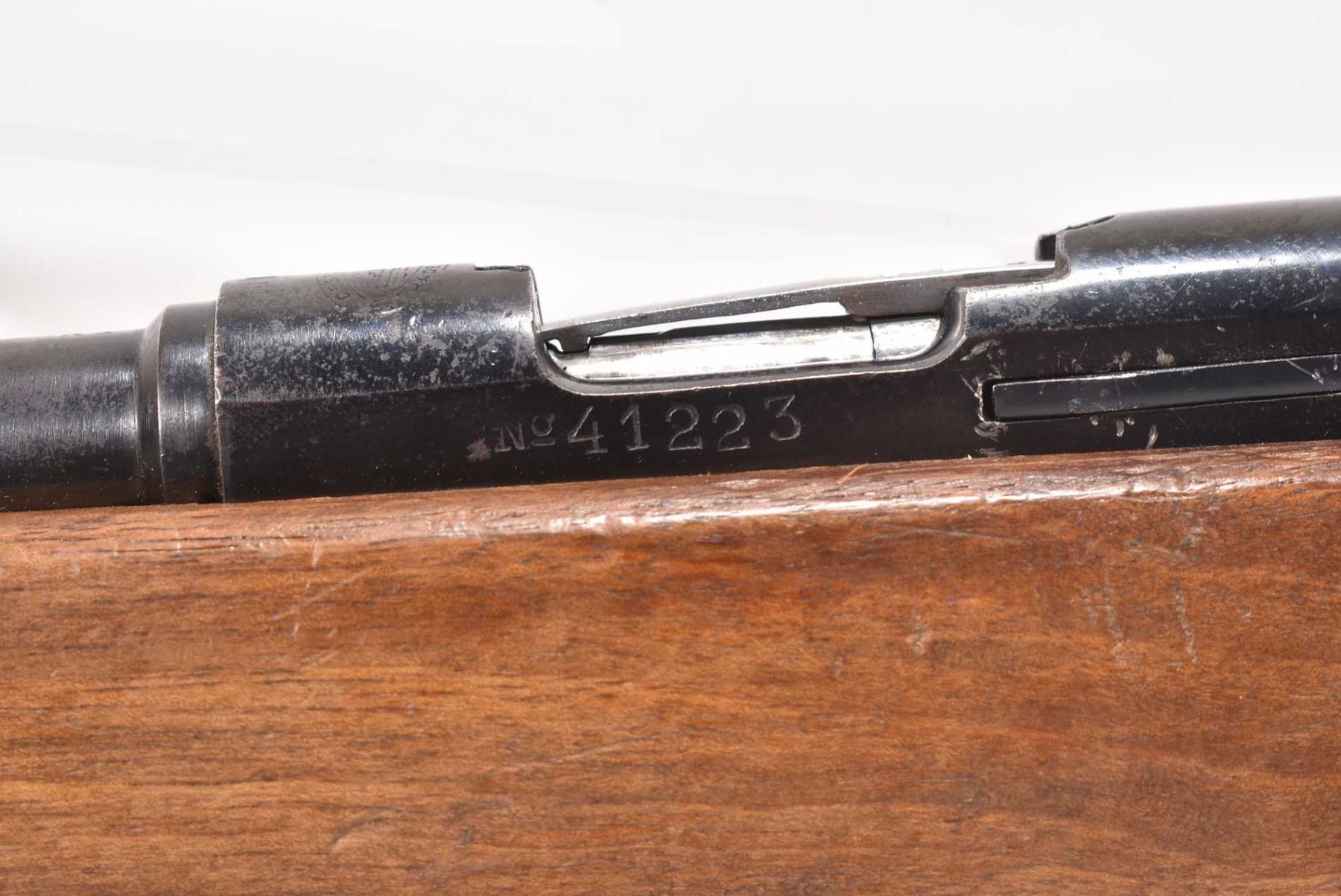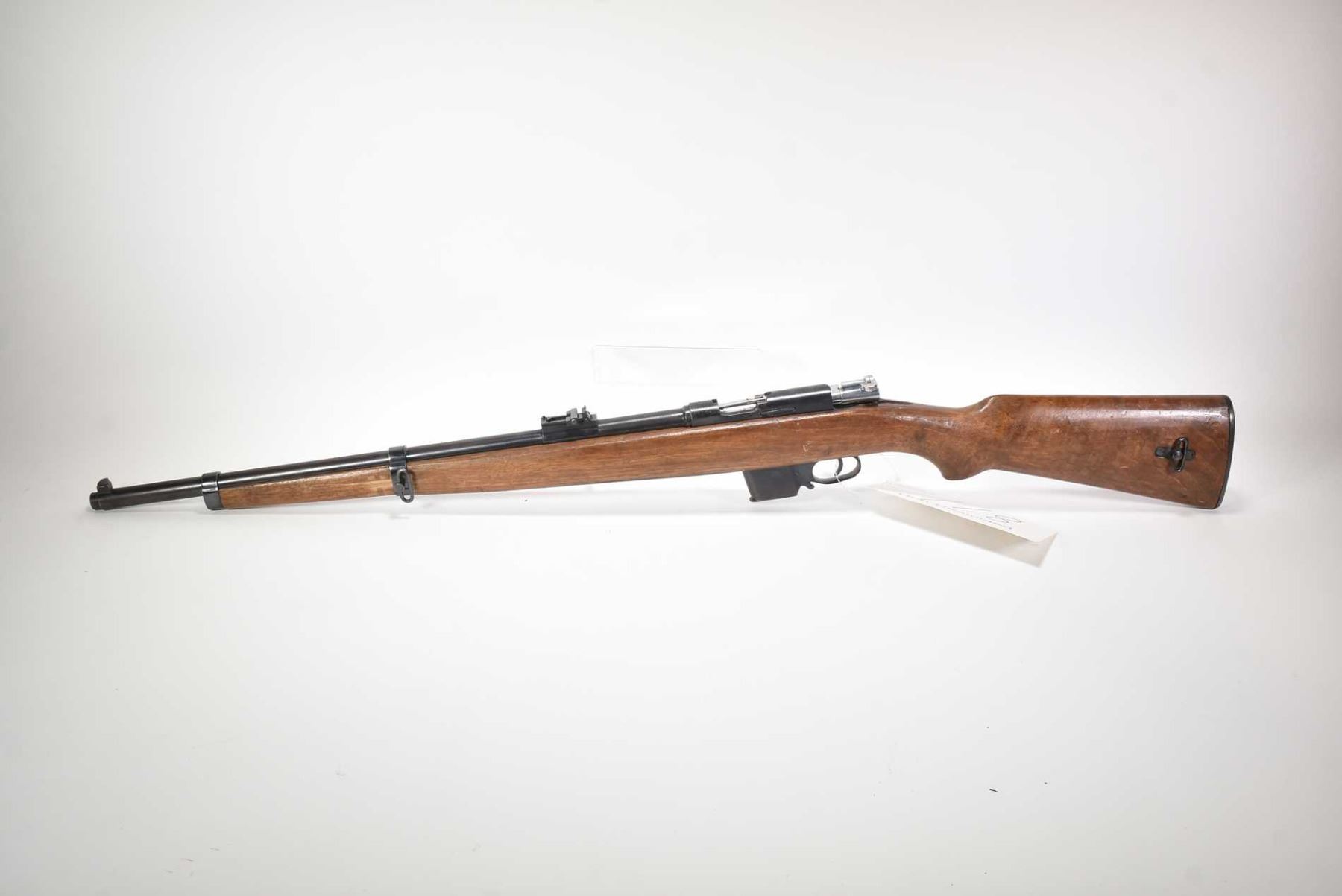 Non-Restricted rifle Destroyer 9x23 mm (Largo)(Bergmann) bolt action, w/ bbl length 21 1/2 [Blued barrel and receiver turning brown/gray, fixed front and adjustable rear sight, smooth wooden stock with metal butt plate and sling mount. Stock and some gouges and scratches including where barrel band was taken off and on, no cracks noted. Includes one removable box magazine. Use, storage and handling marks on wood and metal.] serial # 41223, PAL required