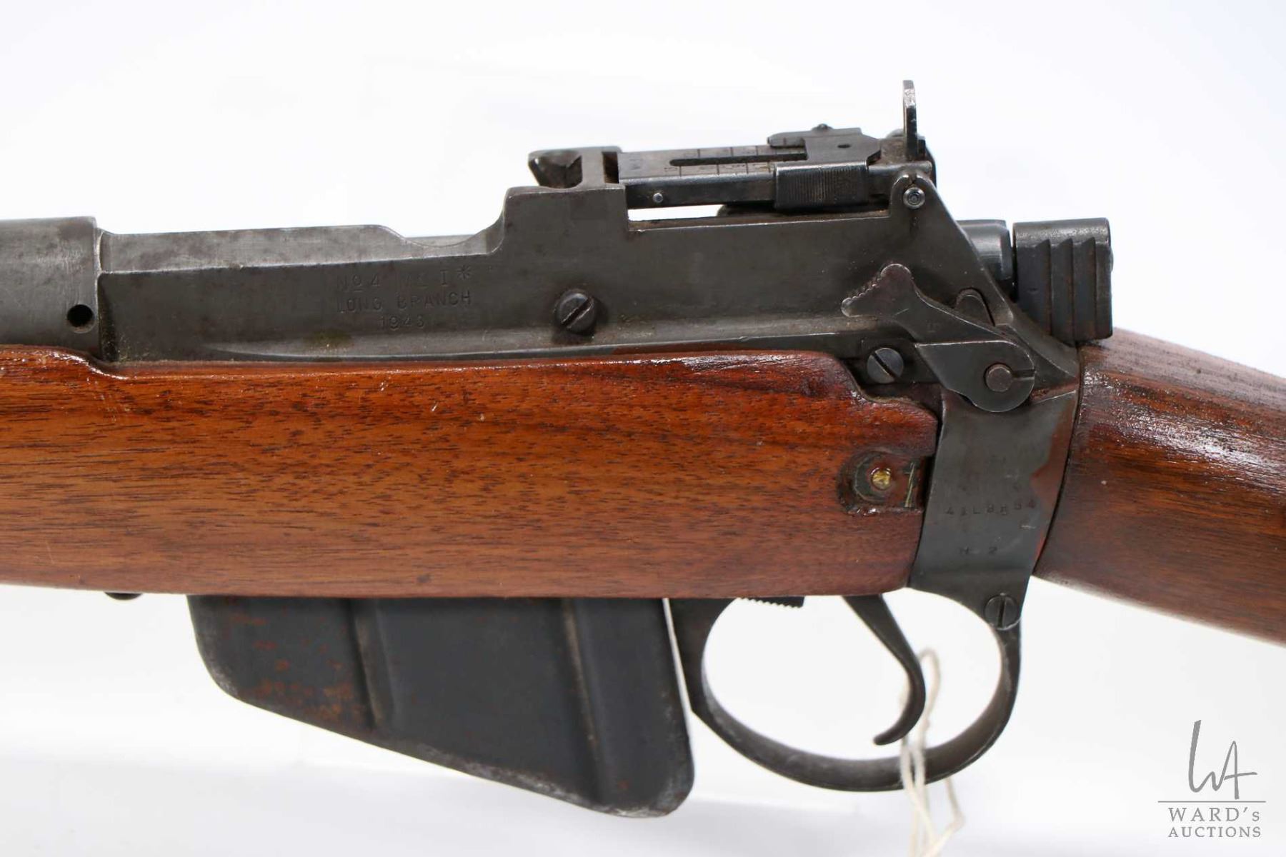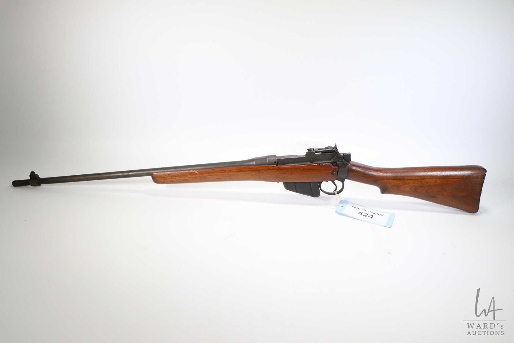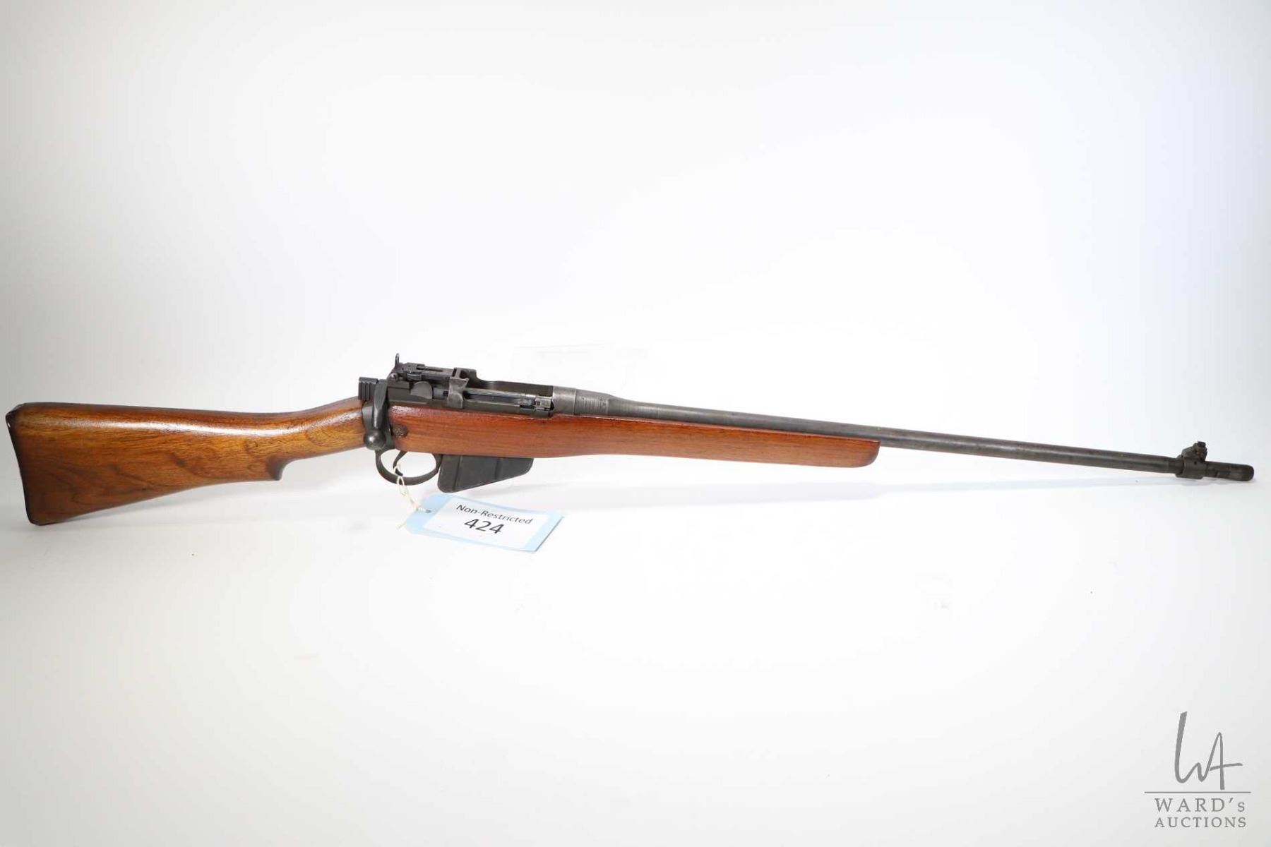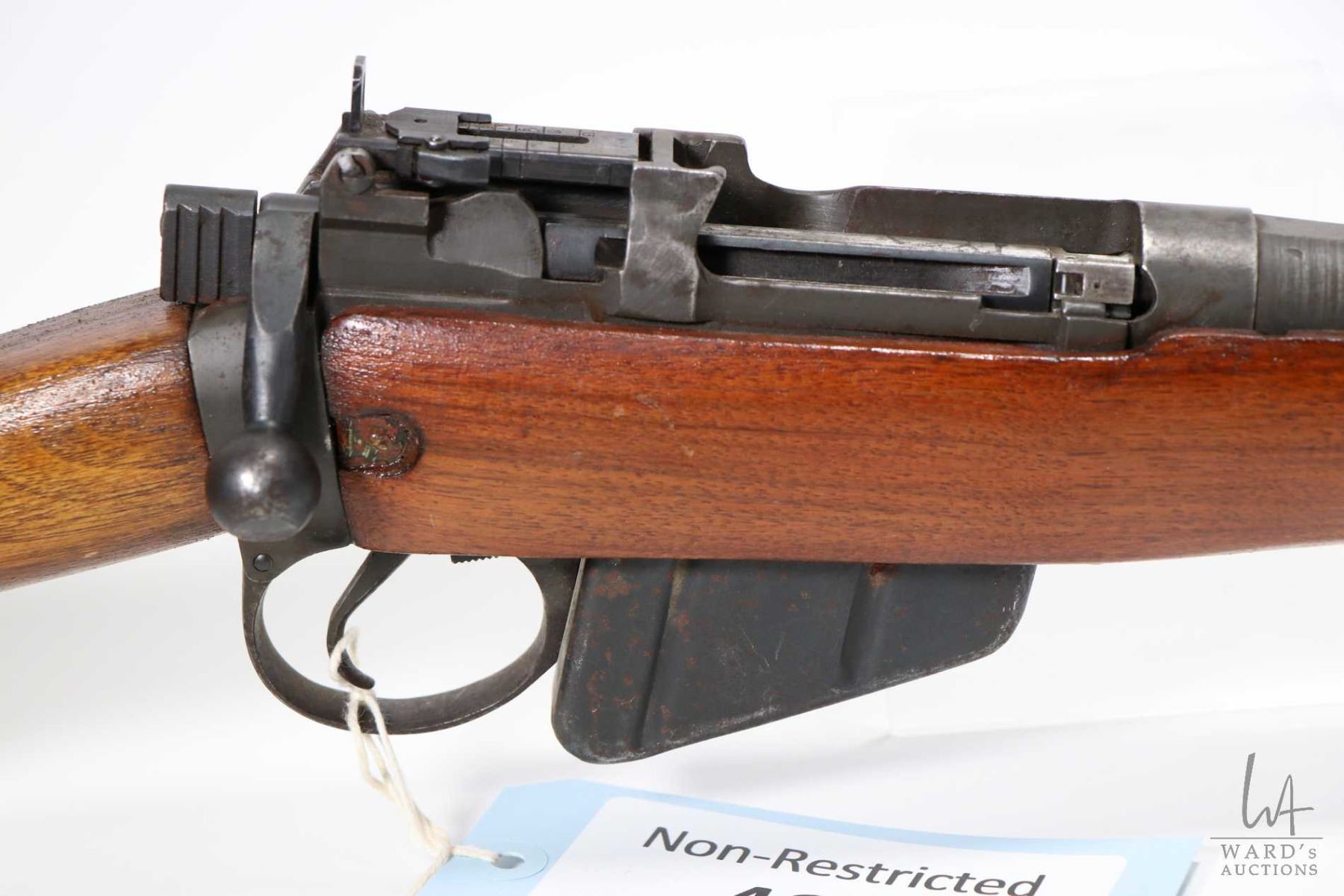 Non-Restricted rifle Enfield model No. 4 MK I * Long Branch, .303 Brit bolt action, w/ bbl length 25" [Blued barrel and receiver. Fixed front and adjustable rear sights. Sporterized stock. Includes one detachable magazine. Stock has been refinished. Non-matching serial no. on bolt handle. In well used condition with use, handling and storage marks on wood and metal.] serial # 41L8554, PAL required