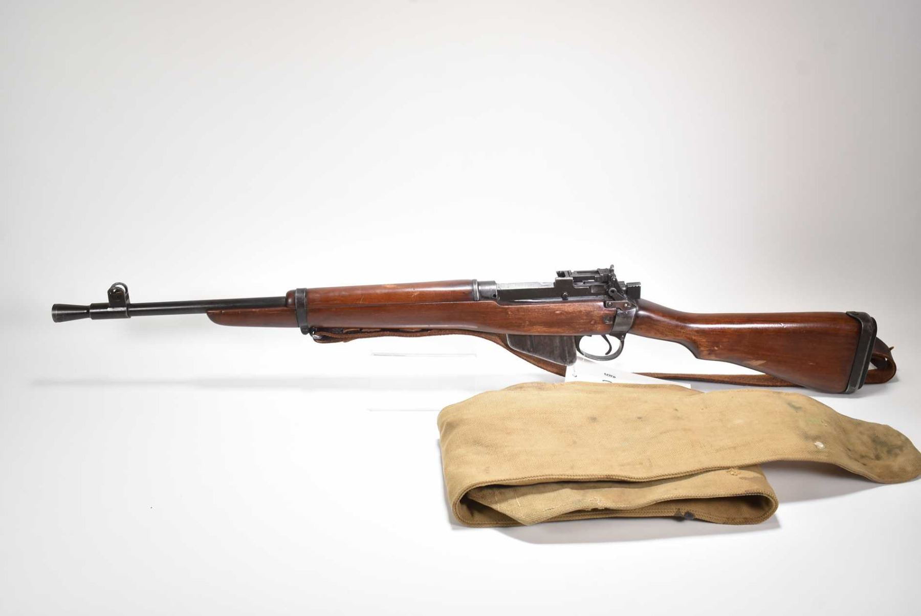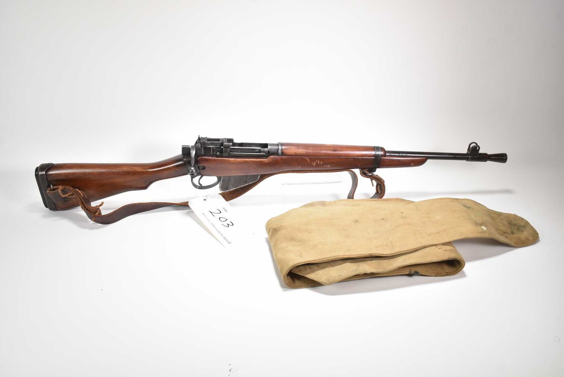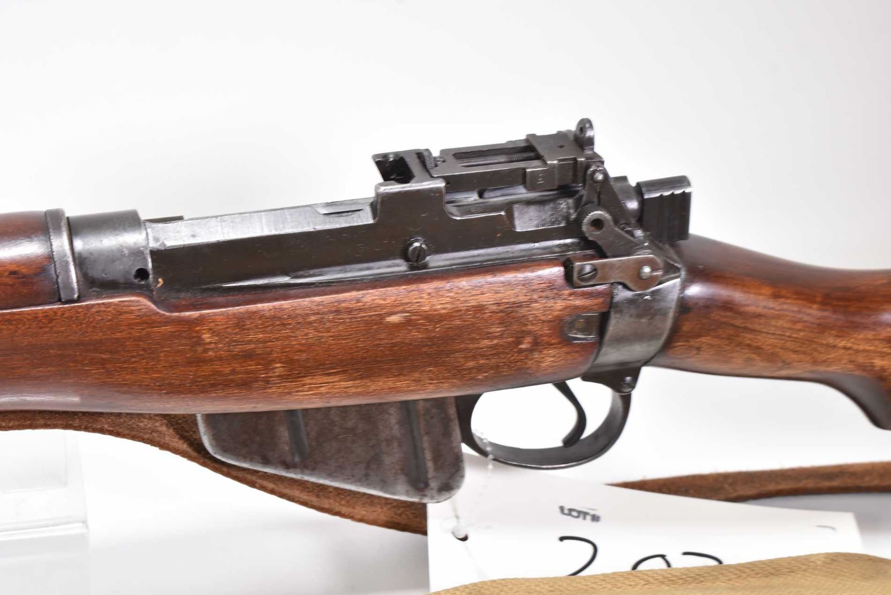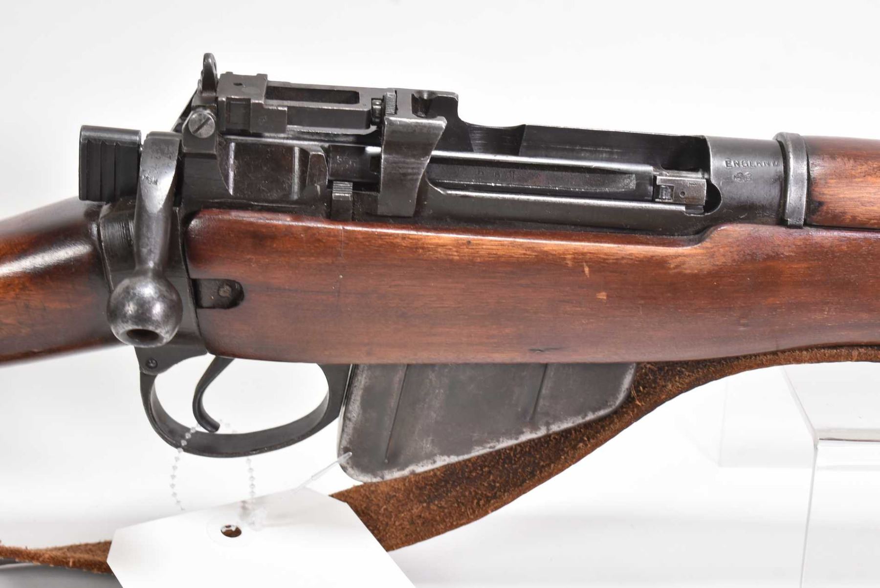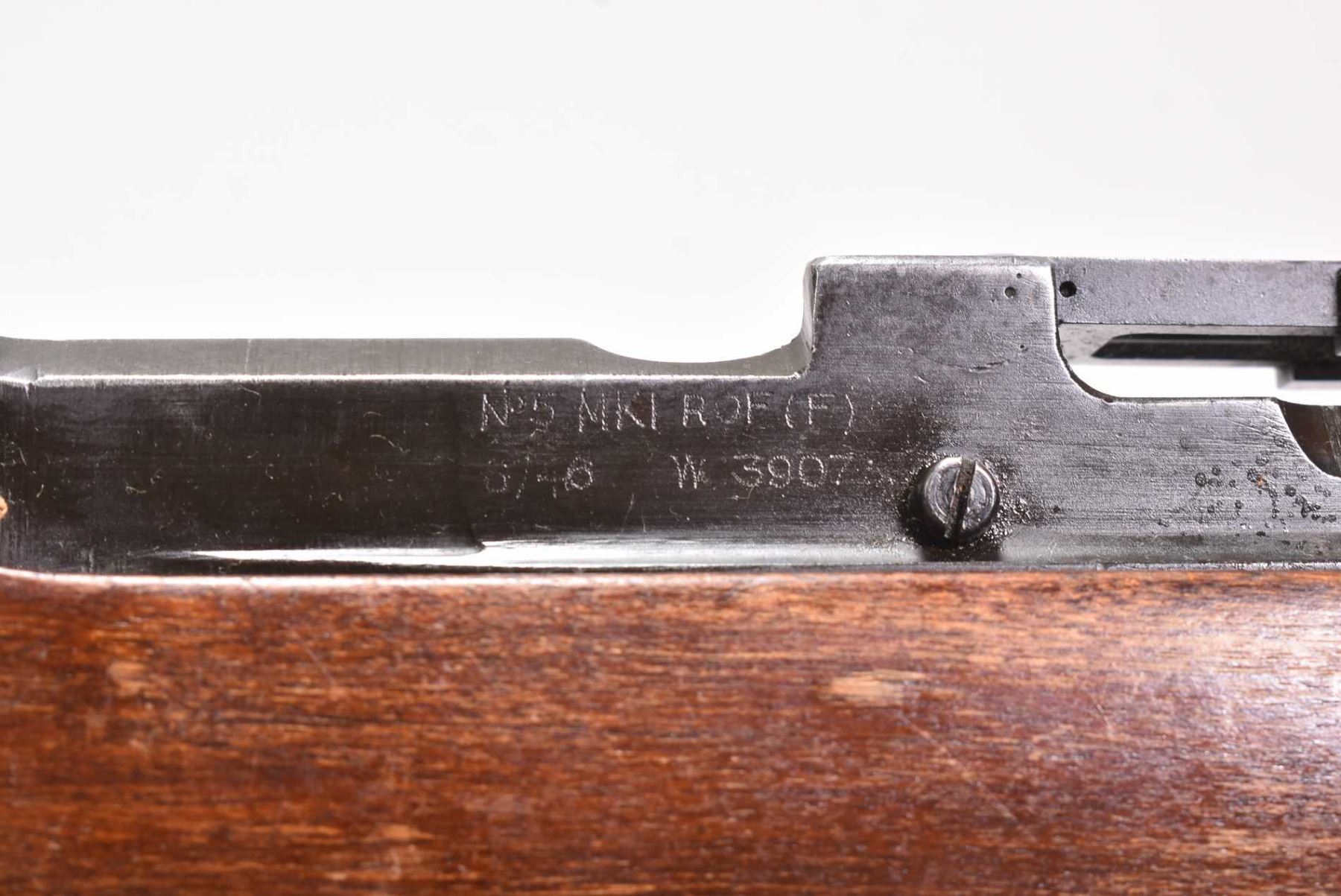 Non-Restricted rifle Enfield model No. 5 MK I R0F (F), .303 Brit ten shot bolt action, w/ bbl length 20 1/2" [Blued finish, fixed front and adjustable rear sights, smooth wooden stock, metal and rubber butt plate, matching numbered magazine and leather strap. Action feels smooth. Includes tan web rifle case. Handling marks on wood and metal] serial # W3907, PAL required
