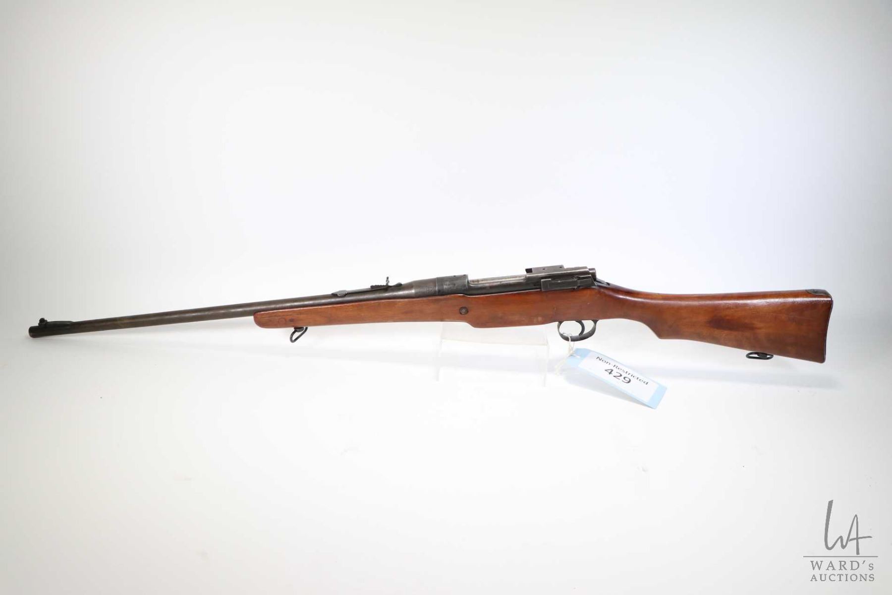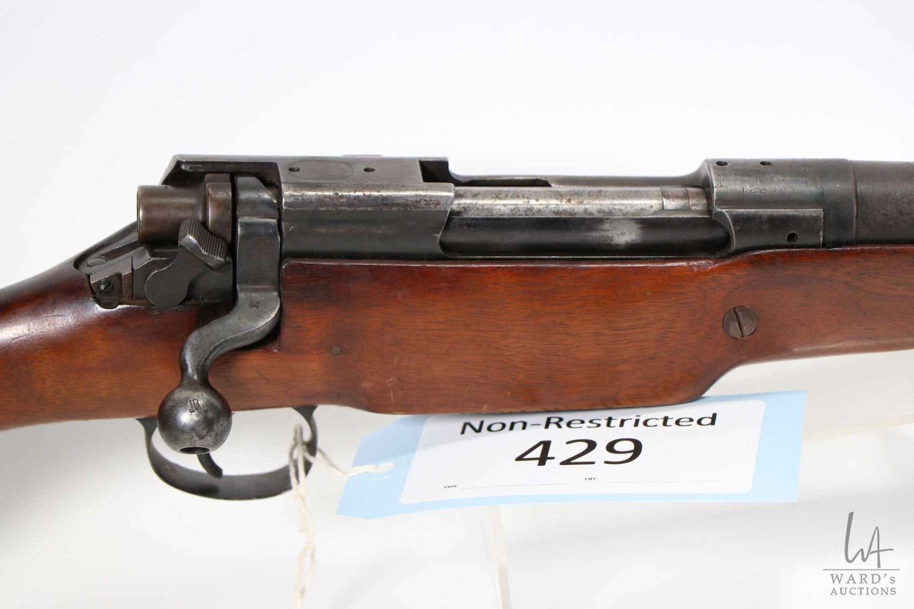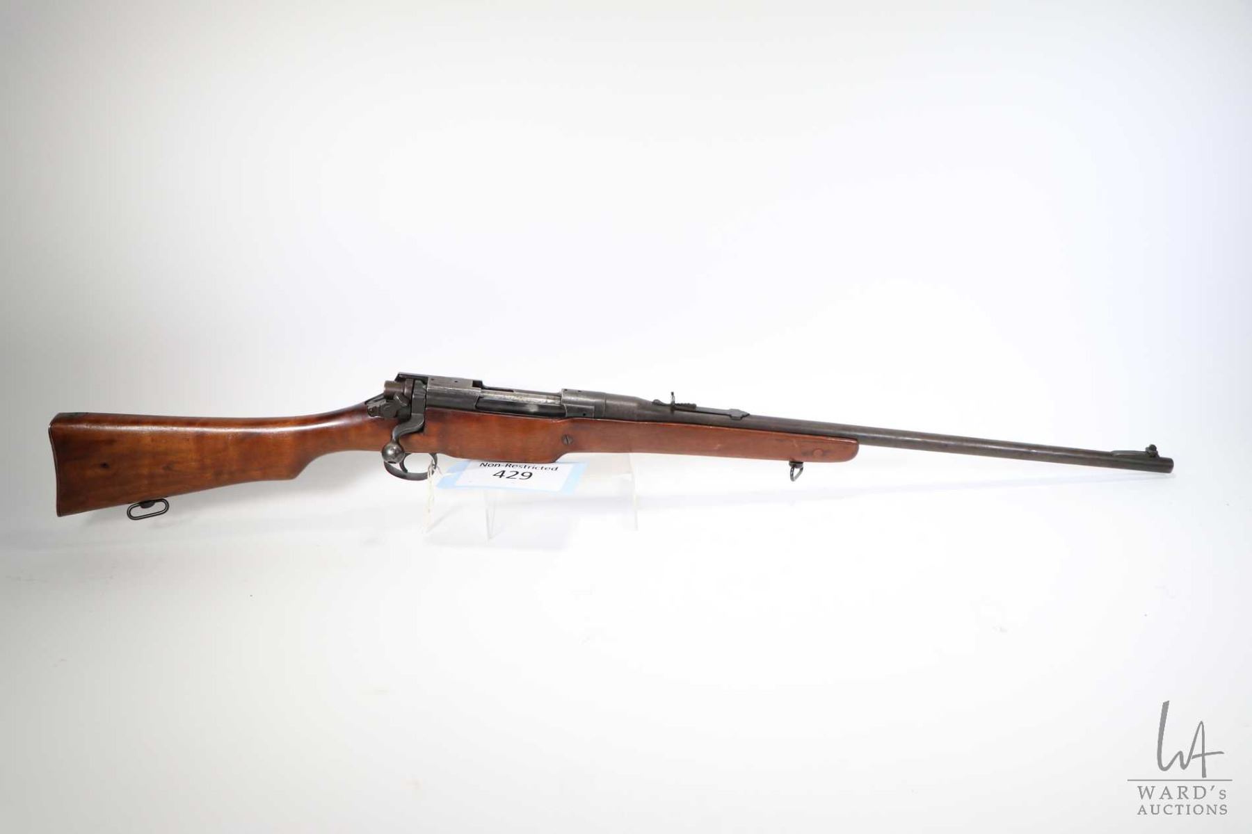 Non-Restricted rifle Enfield model P-14, .303 Brit bolt action, w/ bbl length 23" [Blued barrel and receiver turning brown gray. Fixed front and adjustable rear sights. Rear of receiver machined flat and threaded for optic. Smooth straight sporterized stock with metal butt plate. Fitted with sling rings. Matching serial no. on bolt handle. Crack on both sides of front of stock. Proof marks include a crown over BM on barrel and receiver, plus others and top of receiver has Remington contract mark RE. In used condition with use, handling and storage marks on wood and metal.] serial # 122581, PAL required
