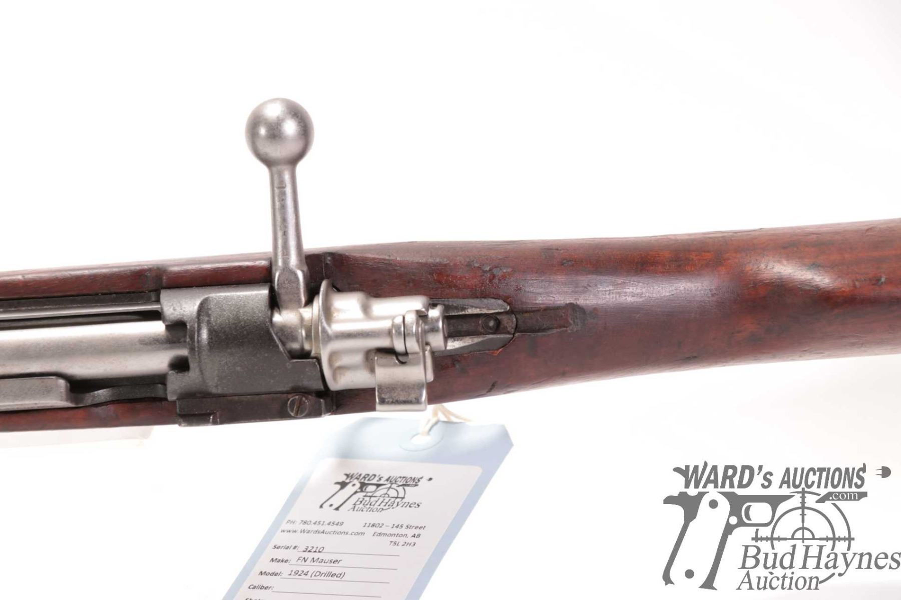 Non-Restricted rifle FN Mauser bolt action, w/ bbl length 23" [Note: no firing firearm. Hole drilled through top of chamber, although otherwise it appears it would fire a cartridge but doing so would be UNSAFE. Buy for parts or display only.] serial # 3210, PAL required
