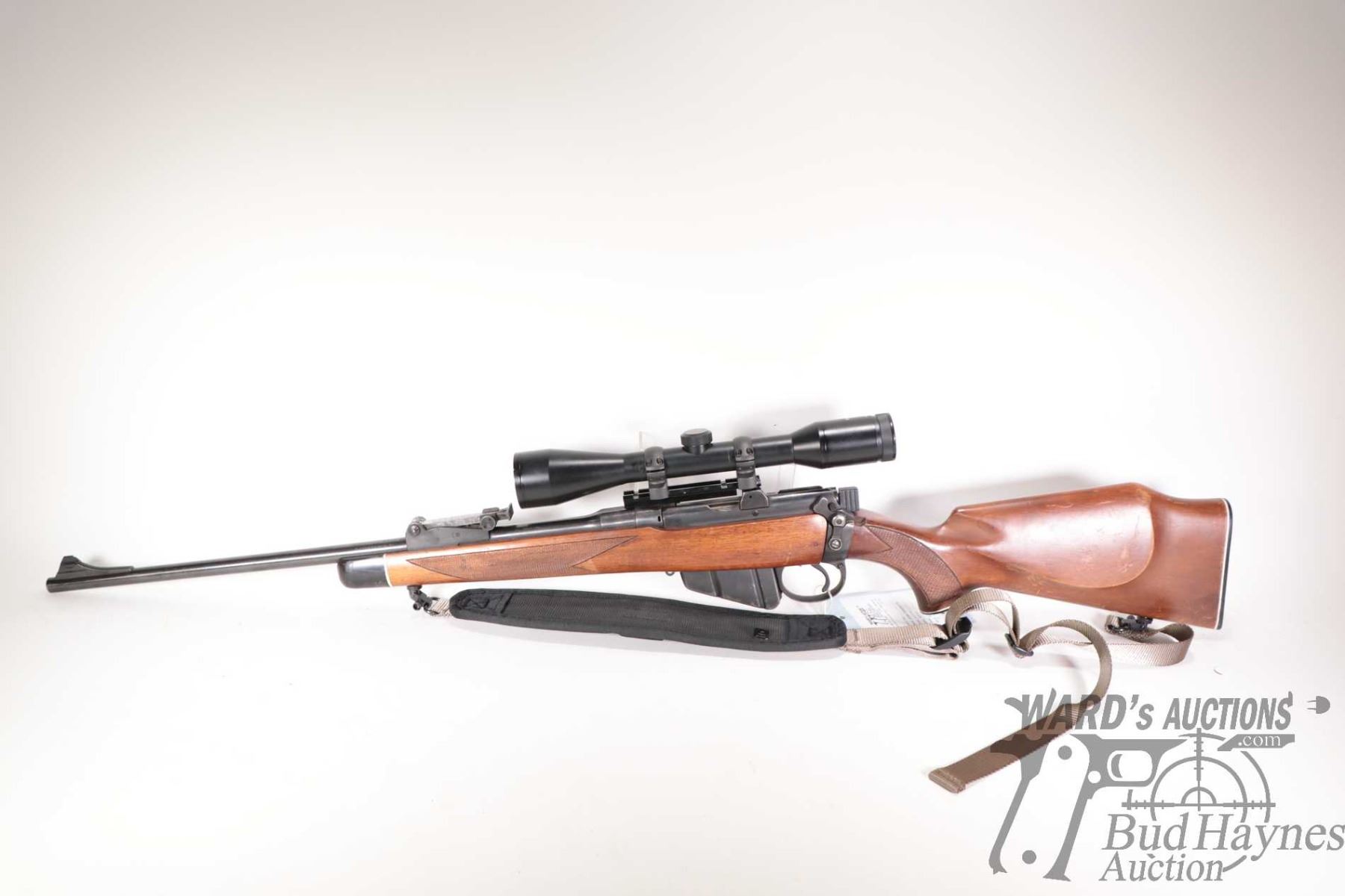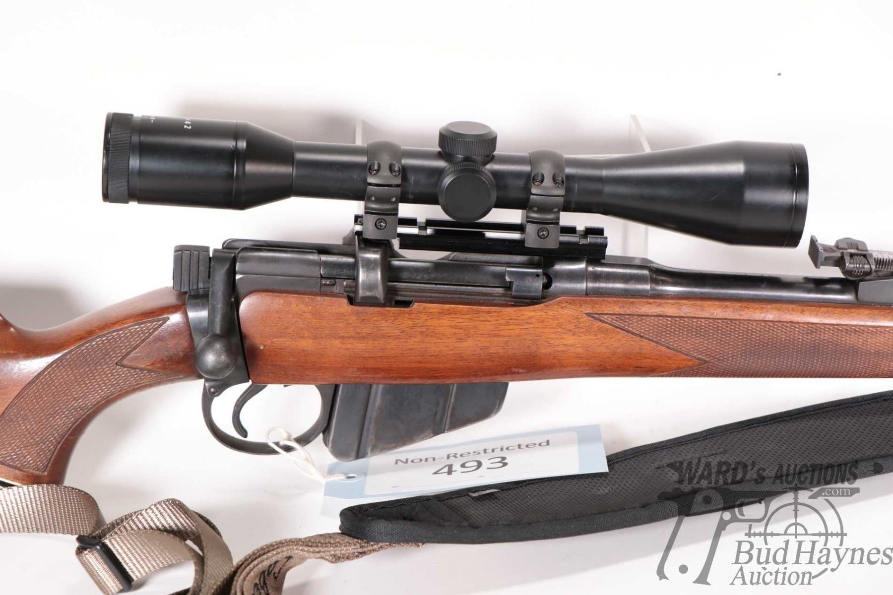 Non-Restricted rifle Globe Firearms LTD. model Lee Enfield, .303 Brit ten shot bolt action, w/ bbl length 22" [Blued barrel and receiver. Fixed front and adjustable rear sights. Fitted with unmarked 6X42 scope. One piece hardwood stock with checkered plastic butt plate. Fixed riser. Checkered semi pistol and foregrip. Includes one detachable magazine. Markings include "Globe Firearms Ltd. Cal. .303 British" on left side of barrel. Partial possible serial number "FR82" on top of barrel etc. Mechanically appears to function well. Other use, handling and storage marks on wood and metal.] serial # NIL, PAL required