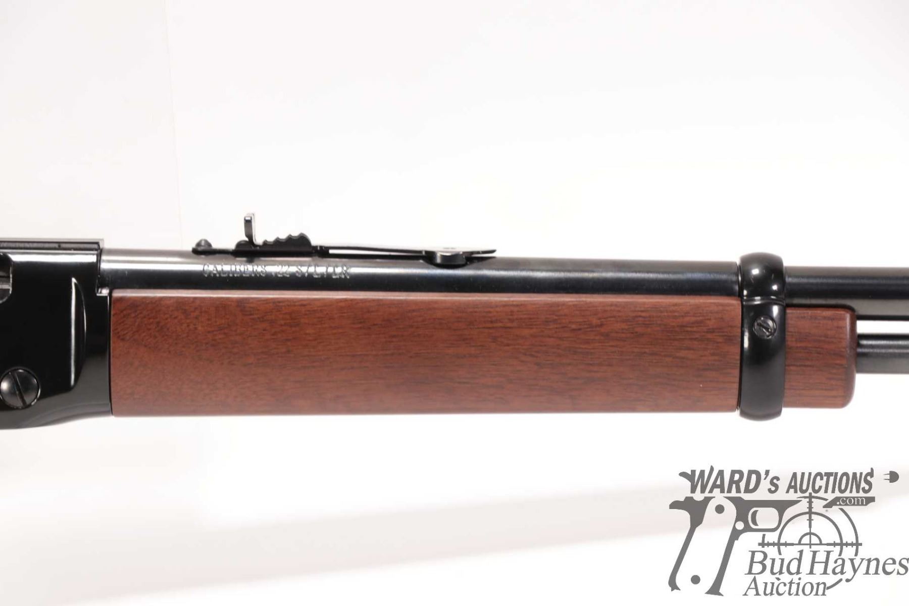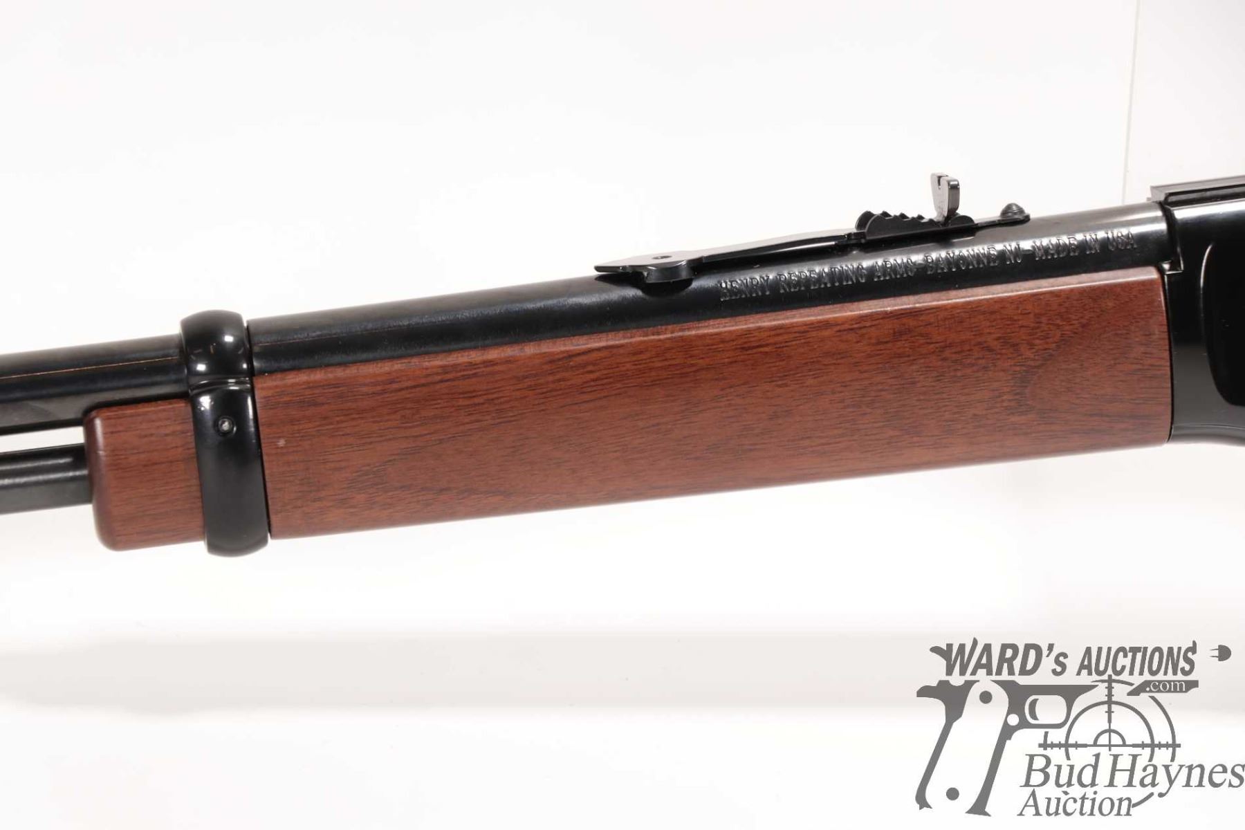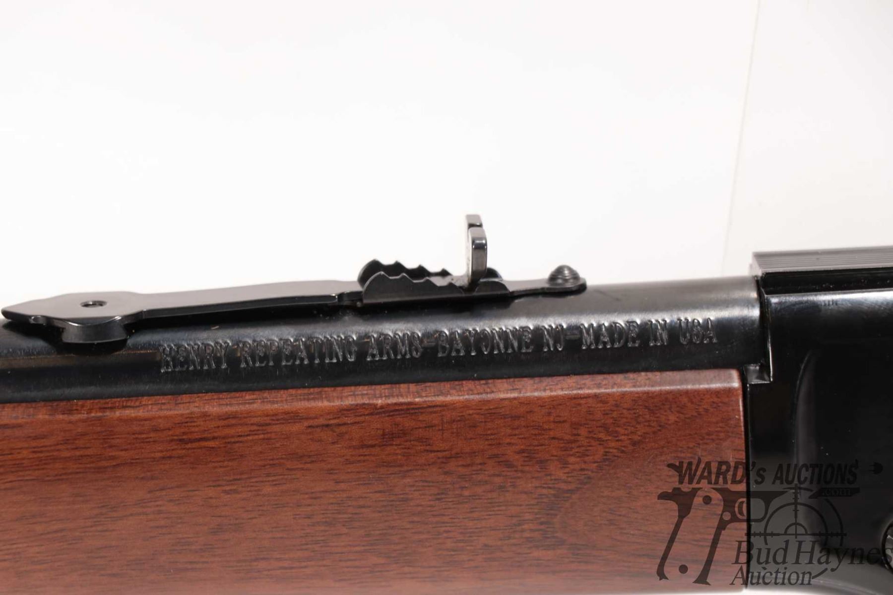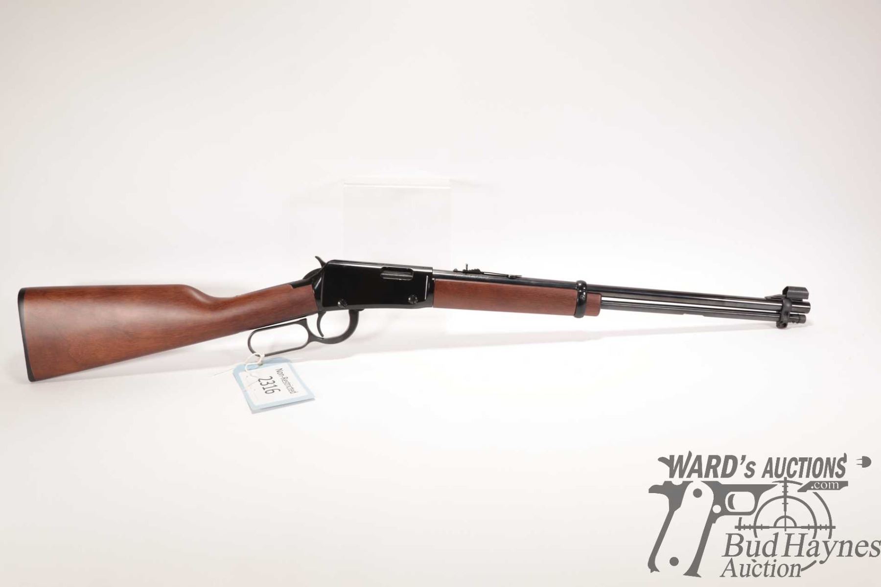 Non-Restricted rifle Henry model H001, 22 S, L & LR lever action, w/ bbl length 18" [Blued barrel and full length tube. Hooded fixed front sight and adjustable rear. Black finished alloy receiver. Smooth straight wooden stock with branded plastic butt plate. Mechanically appears near excellent. Most only minor use and handling marks plus a few extra paint scratches predominately on left and bottom of receiver.] serial # 749663H, PAL required