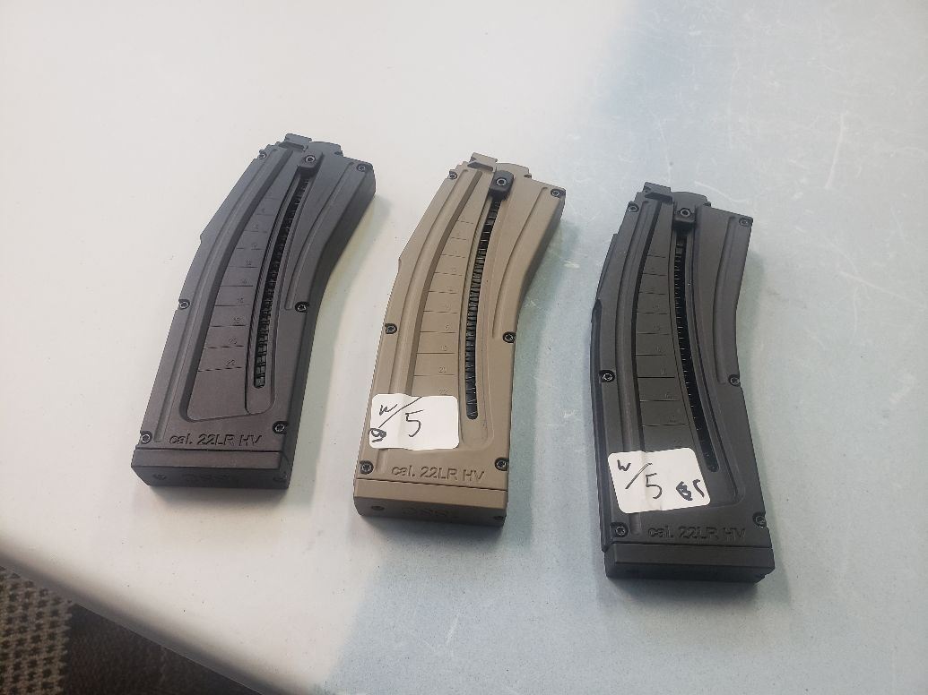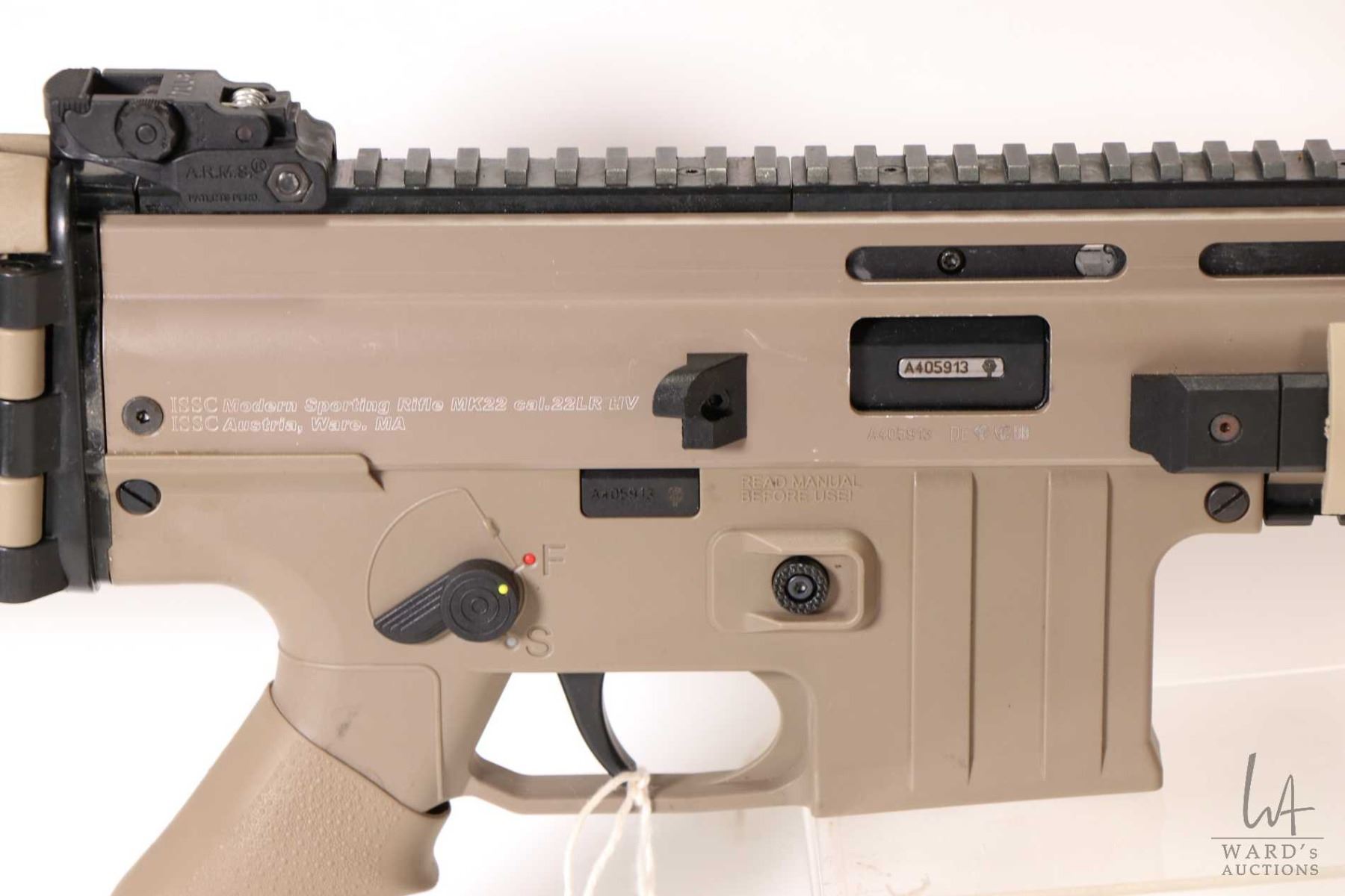 Non-Restricted rifle ISSC model MK 22, .22 LR semi automatic, w/ bbl length 16" [Black and tan two toned design. Folding adjustable front and rear sights. Full flat top rail and partial under rail. Extending and folding stock. Fitted with flash hider that appears to have had a leverage tool used for installation or removal that has deformed the cage. Otherwise only minor use, handling and storage marks. Includes three detachable magazines, one matching colour and two black.] serial # A405913, PAL required