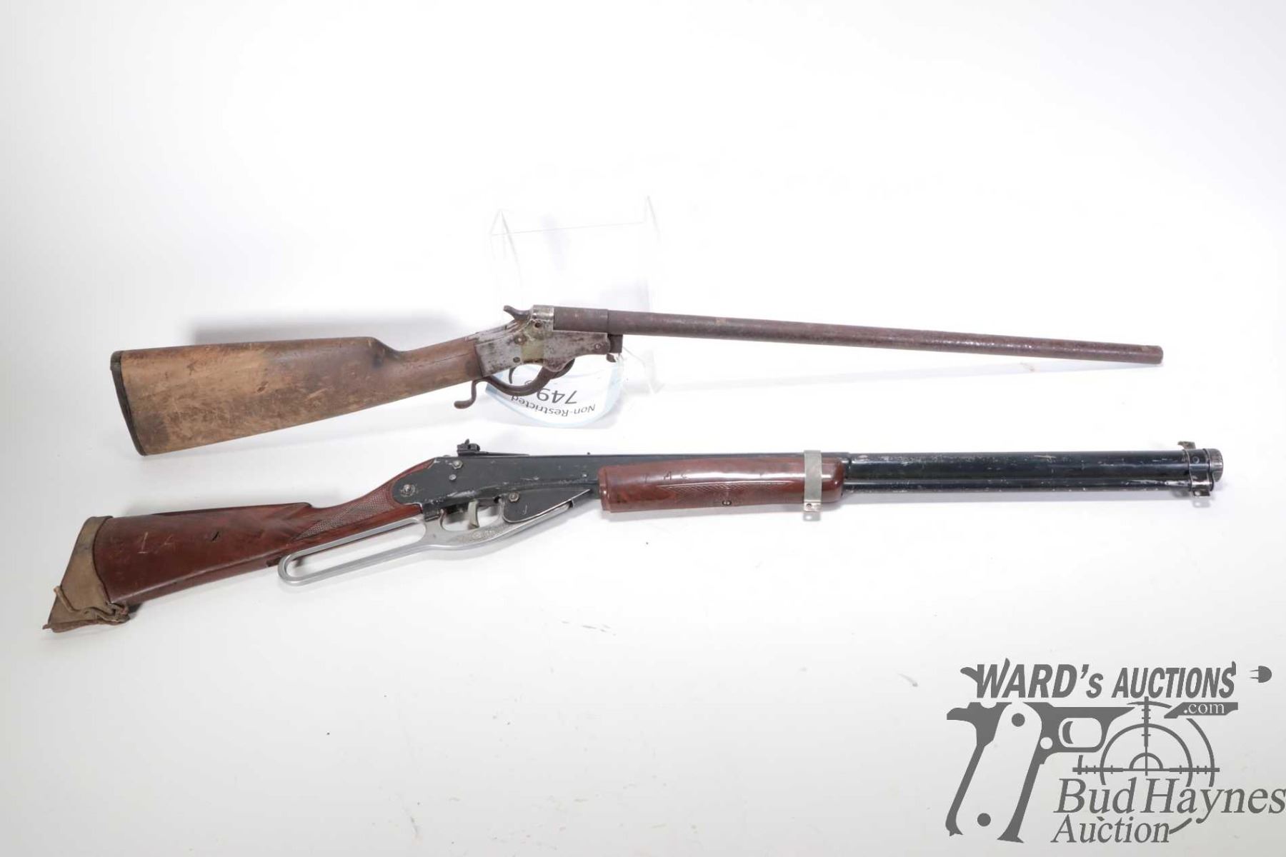 Non-Restricted rifle J. Stevens A & T Co. model Marksman 12, .22 LR single shot hinge break, w/ bbl length 20 [Overall in well worn condition. No sights. No forend. Broken or weak hammer spring. Cracks and gouges in stock. Lot includes Daisy model 94 BB gun, also in well worn condition] serial # 801, PAL required