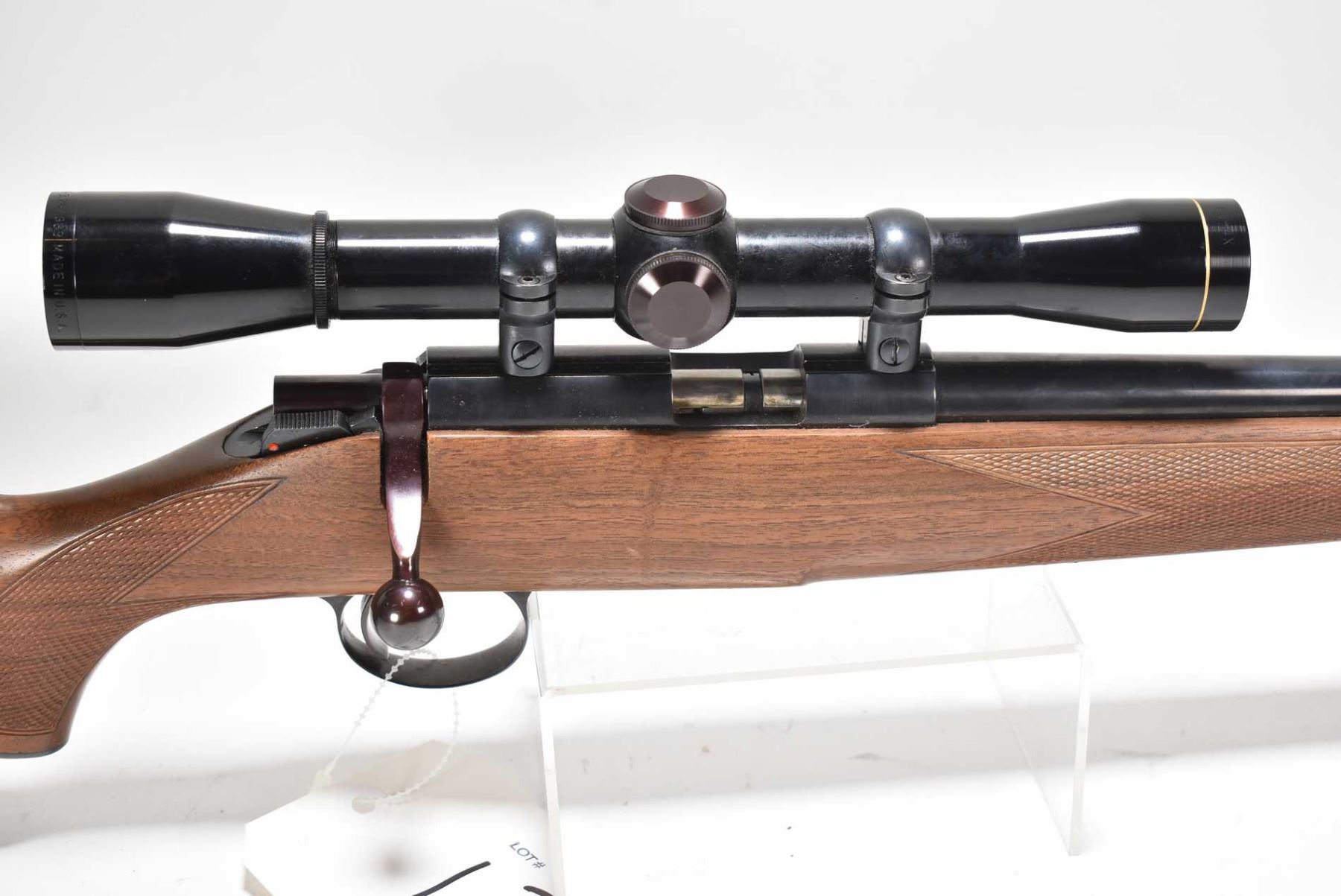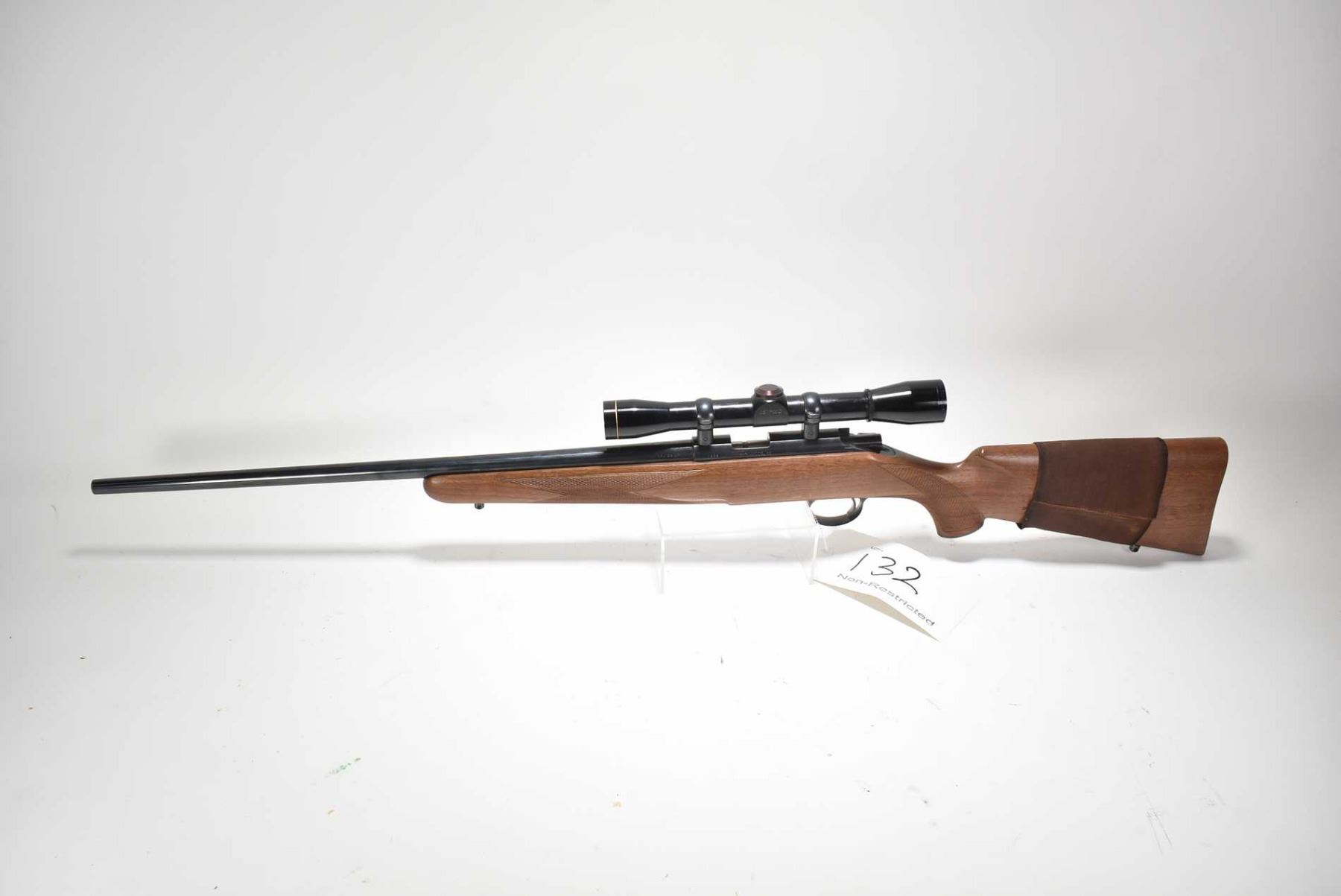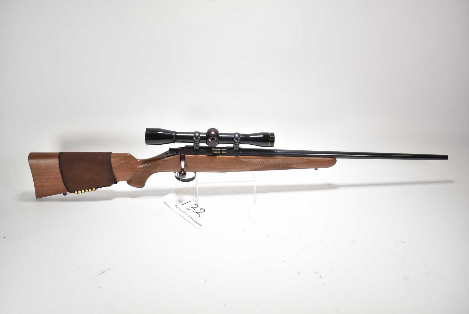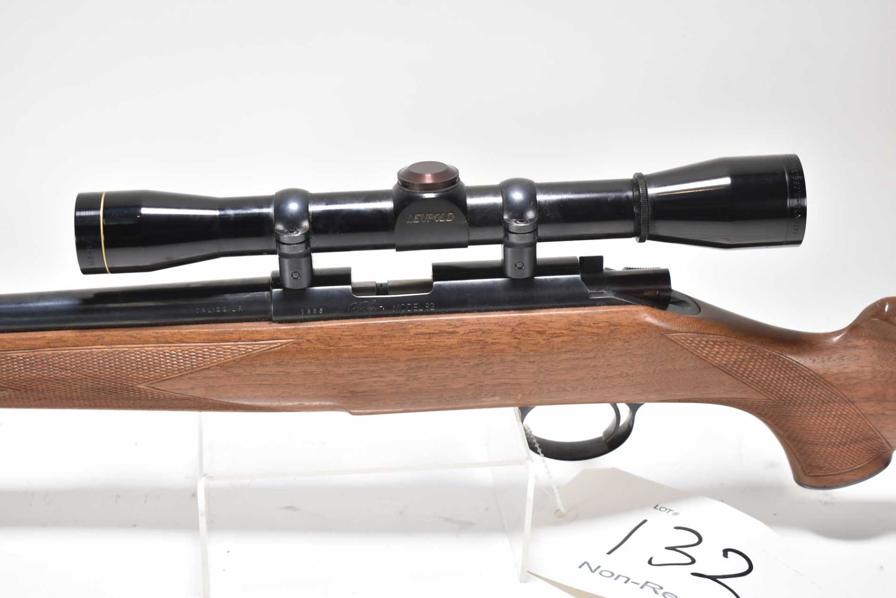 Non-Restricted rifle Kimber model 82, .22LR cal, mag fed 5 bolt action, w/ bbl length 22 1/2" [Blued barrel and receiver, no fixed sights, fitted with Leupold M8-4X scope SN L107855, walnut stock with checker semi pistol and foregrip, includes one 5 shot magazine, checkered metal butt plate. Small crack on right rear of stock, appears to have had light use with minor use and handling marks.] serial # 1886, PAL required