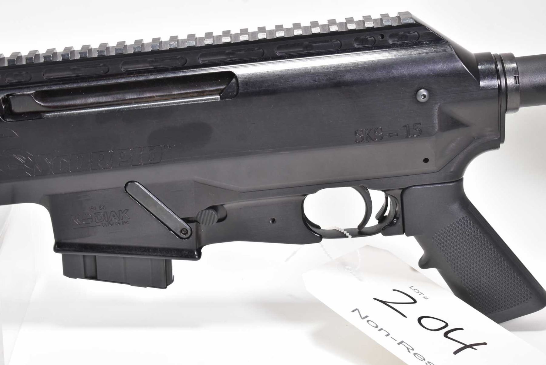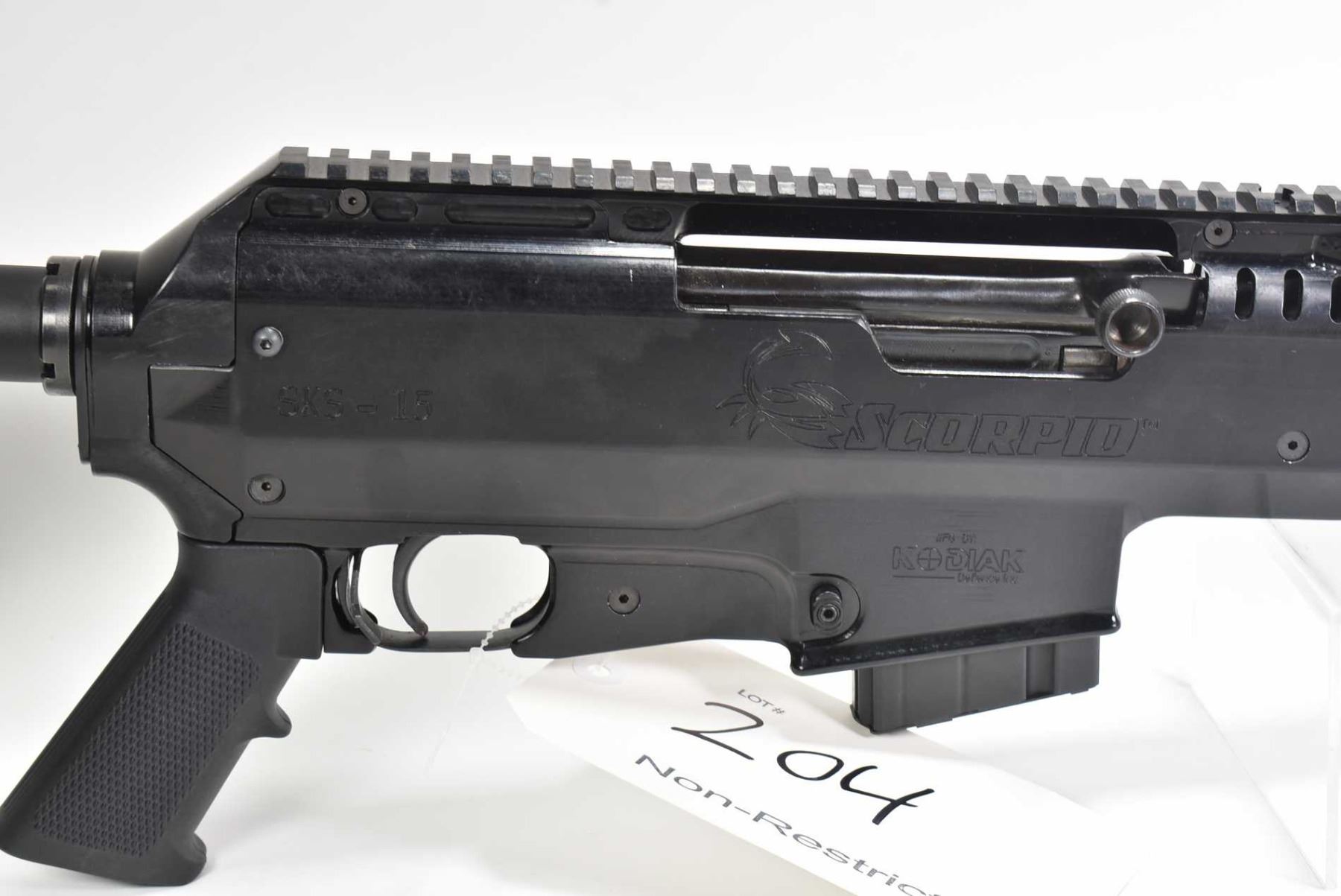 Non-Restricted rifle Kodak Defense Inc. model Scorpio, SKS-15, 7.62 X 39 five/ten shot semi automatic, w/ bbl length 18 1/2" [Blue and parkerized style finish, no fixed sights, full length flat top rail, adjustable stock, checkered pistol grip, flash hider. Includes one 10 shot XCR-L micro pistol magazine. Minor handling marks throughout] serial # (??) 845, PAL required