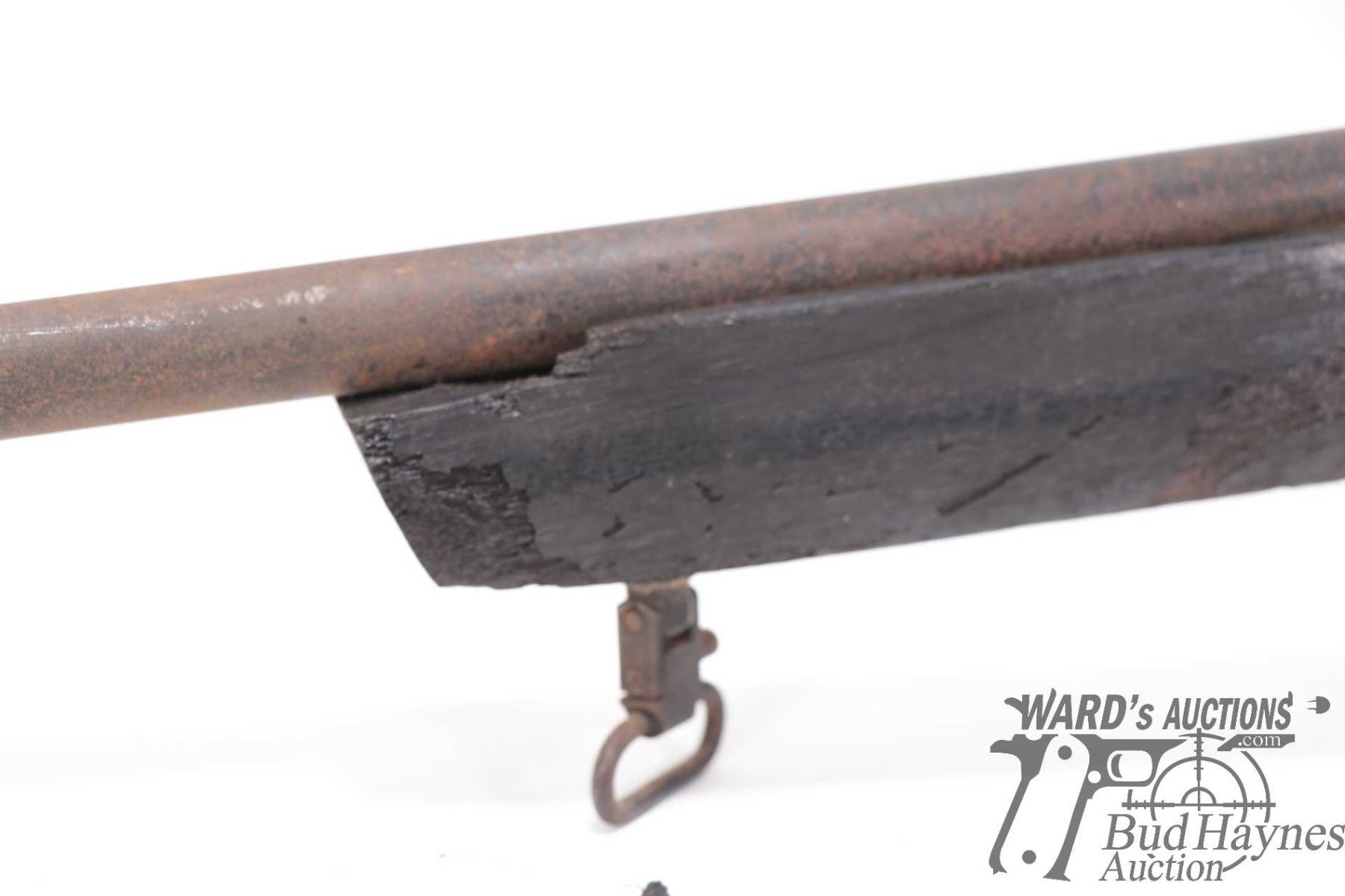 Non-Restricted rifle Lee Enfield model No. 4 MK I, .303 British bolt action, w/ bbl length 25" [Overall in heavily used condition. Dated 1943. Matching serial number on receiver and bolt. No sights. Rust on all metal surfaces. No magazine. Firearm has been in a fire. Cracks in stock etc.] serial # AD2235, PAL required