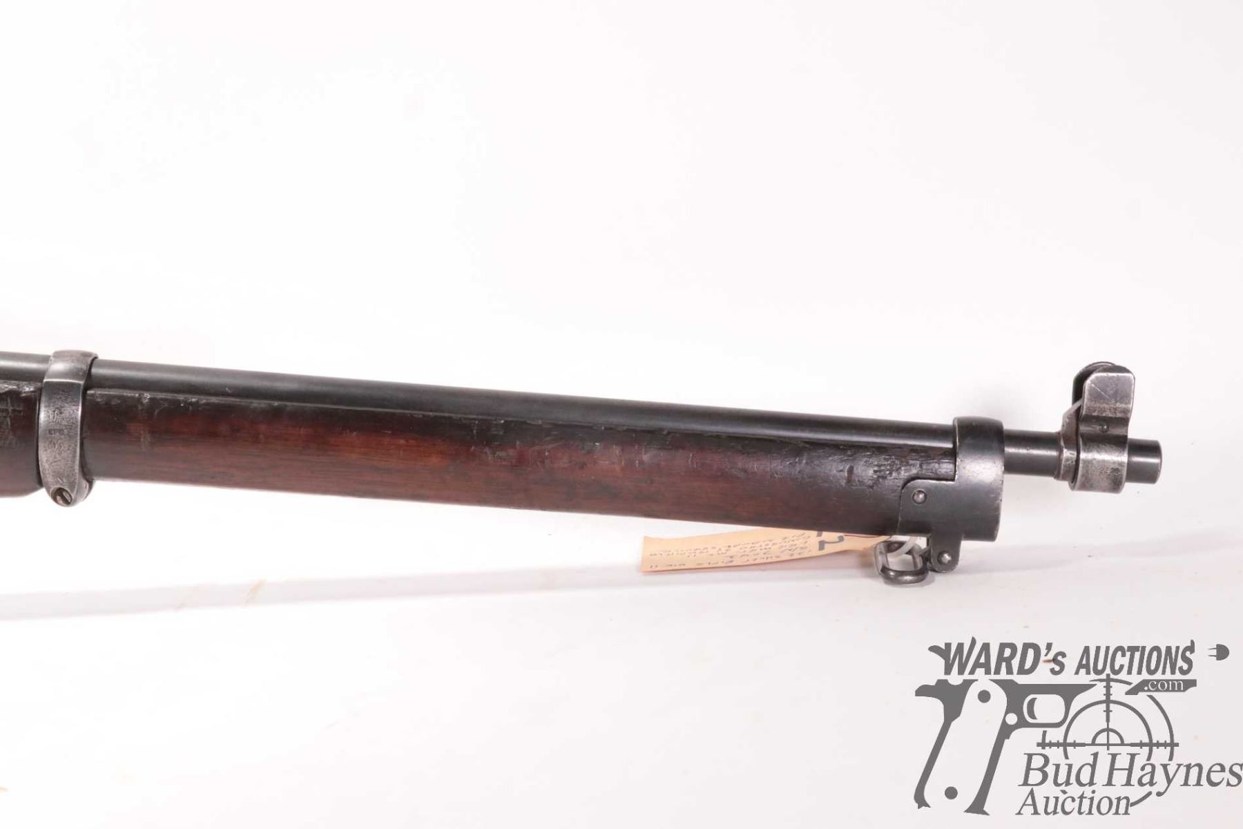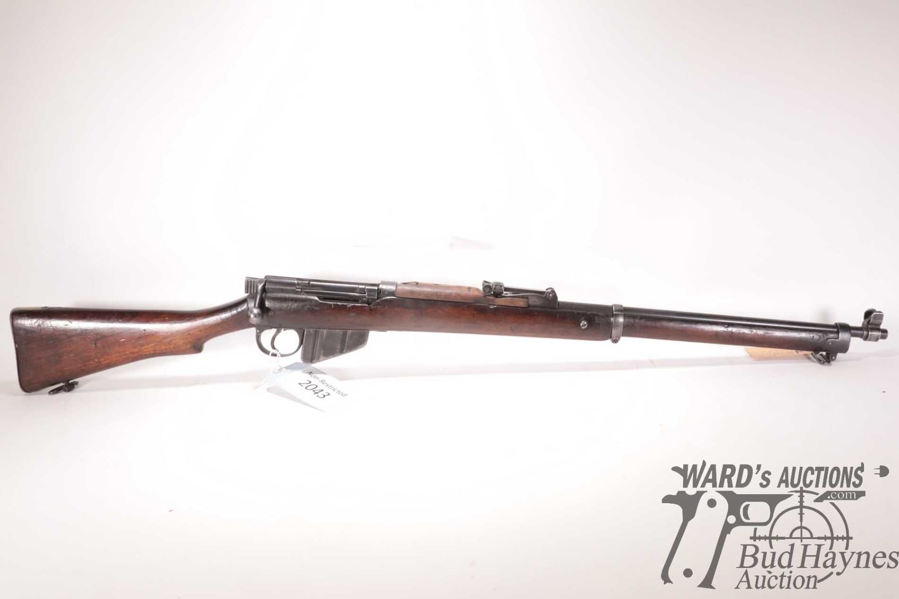 Non-Restricted rifle Lee Metford model SHT. 22 MK II, .22 LR Single shot bolt action, w/ bbl length 25" [Blued barrel and receiver. Fixed front and adjustable rear sights and fitted with Volley sight. Includes standard ten round magazine with no spring or follower. Full wood stock with brass butt plate. Matching serial number on renumbered receiver and bolt. Other markings include "ENFIELD 1894 II" on right side of socket., "N", "ENFIELD 1912 SHT 22 Mk II' indicating Enfield conversion for naval use on left side of socket etc. Appears to be non-matching hand guard with finish stripped. Mechanically appears to function reasonably well. Bluing worn in use and handling areas, nicks and dings and other use, handling and storage marks.] serial # 7043, PAL required