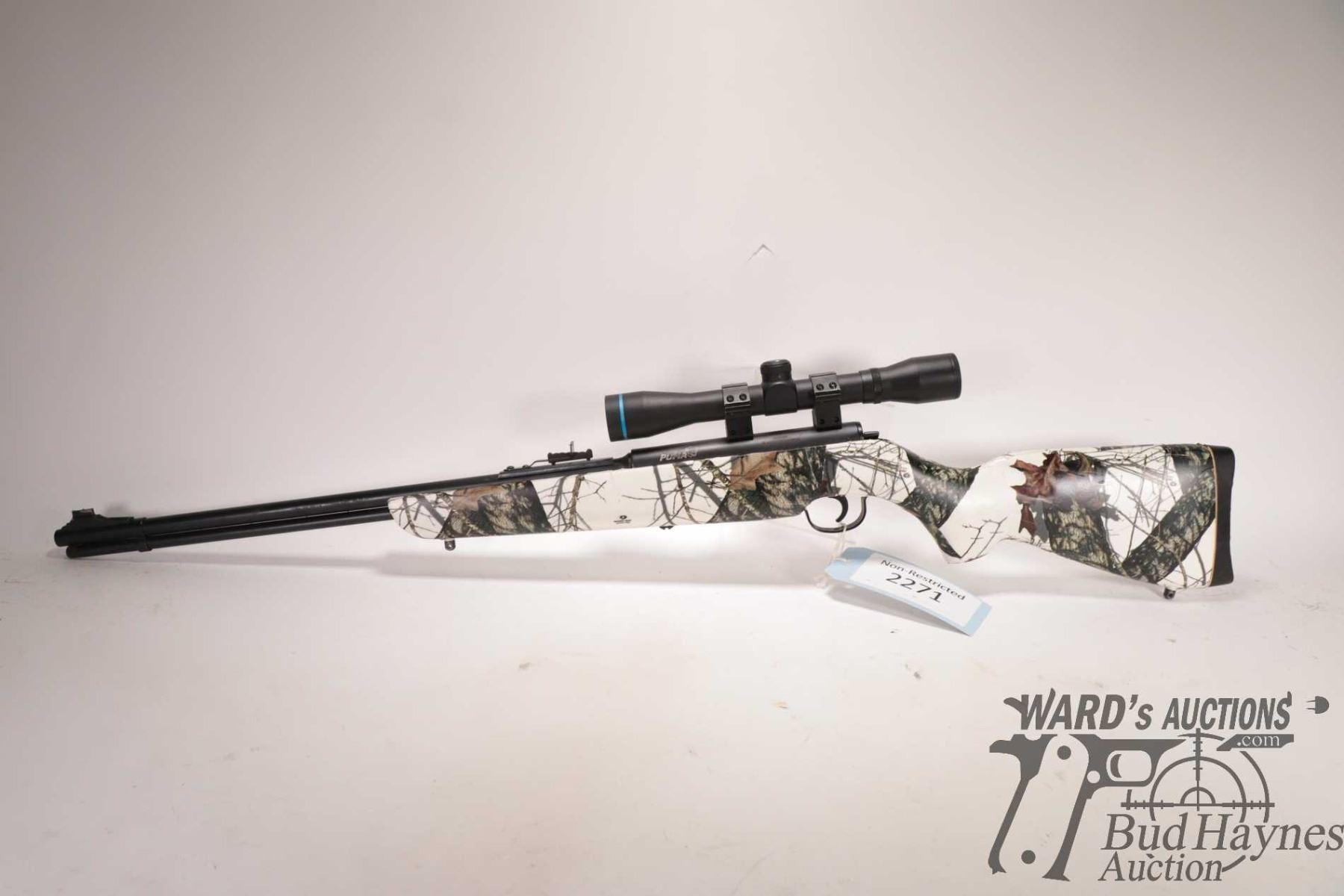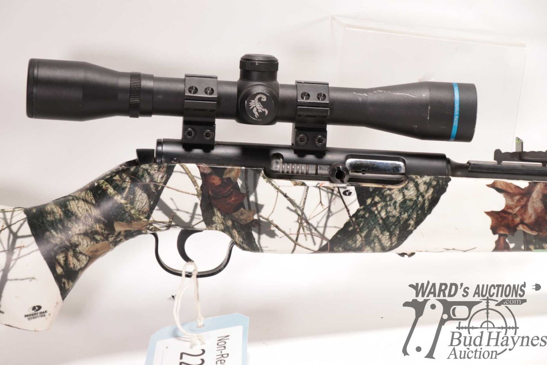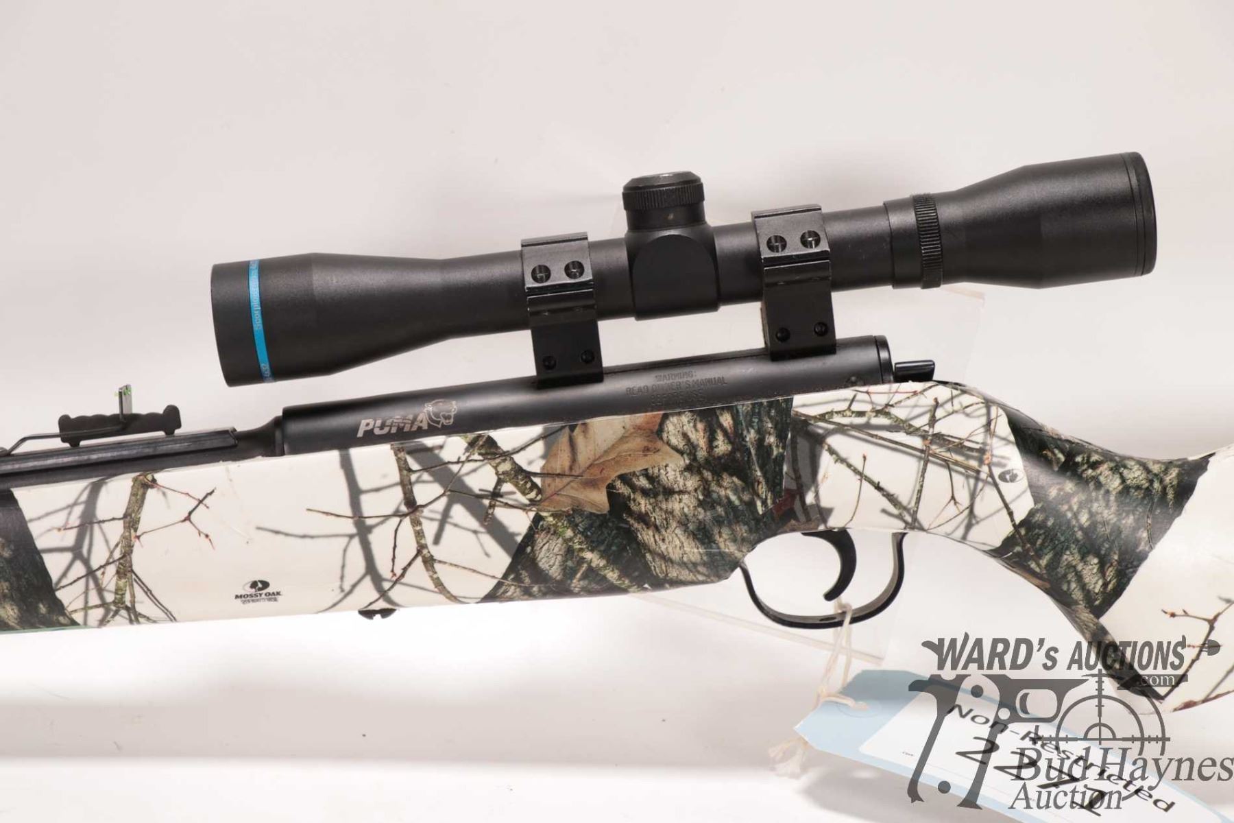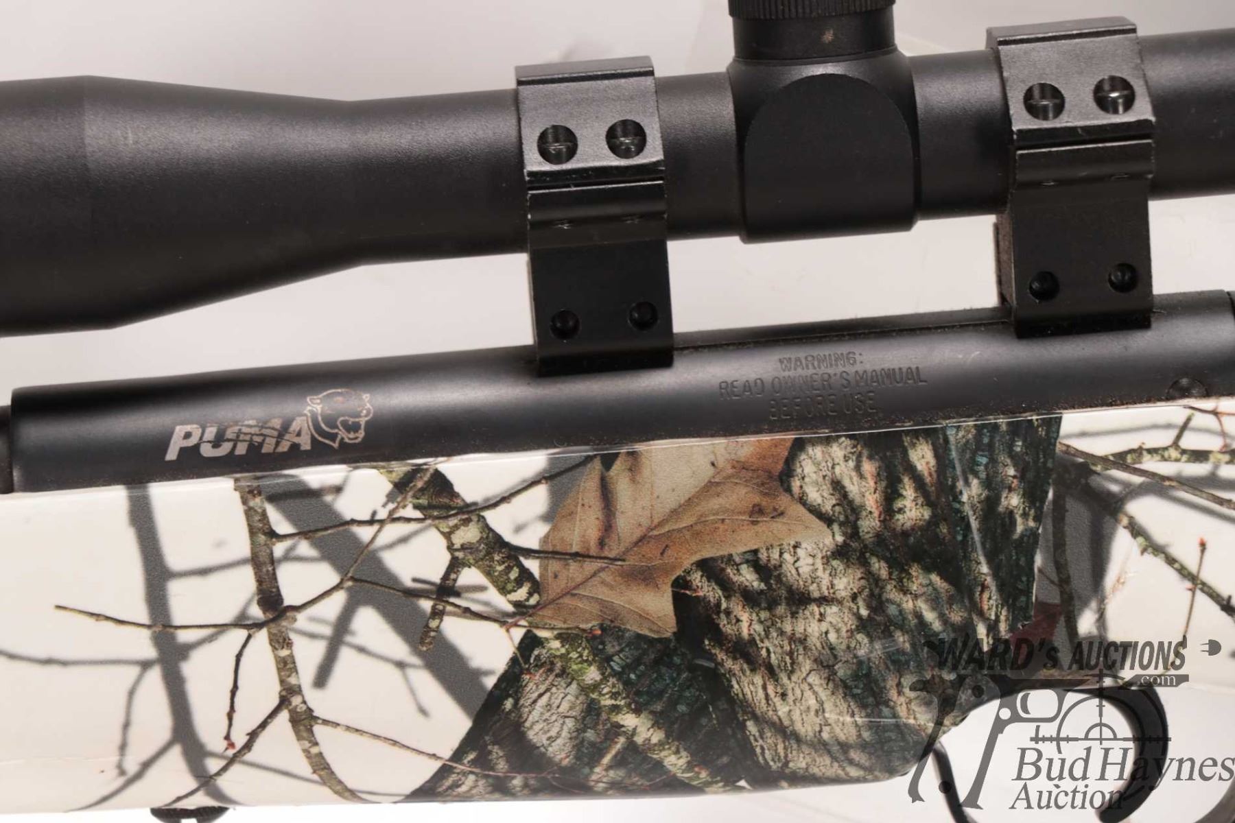 Non-Restricted rifle Mandoza model Puma 3000, 22 LR semi automatic, w/ bbl length 21 1/2" [Satin black finish. Fixed front sight with top fiber optic tube missing. Adjustable rear sight. Fitted with Scorpion Optics 4X32 scope. Tubular magazine. Smooth stock covered in owner applied winter camouflage. Fitted with recoil pad. Mechanically appears to function reasonably well with some isolated surface rust and other use, handling and storage marks.] serial # 14292, PAL required