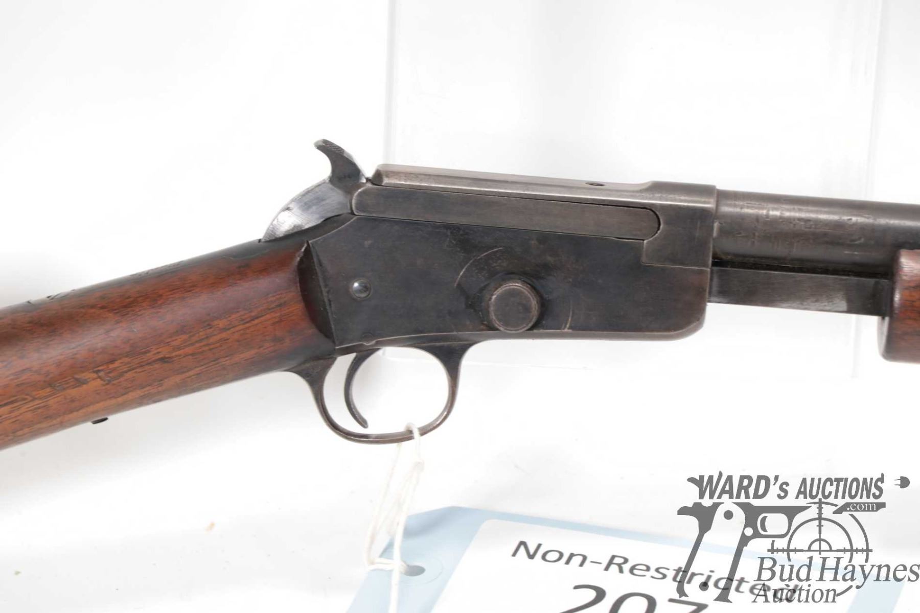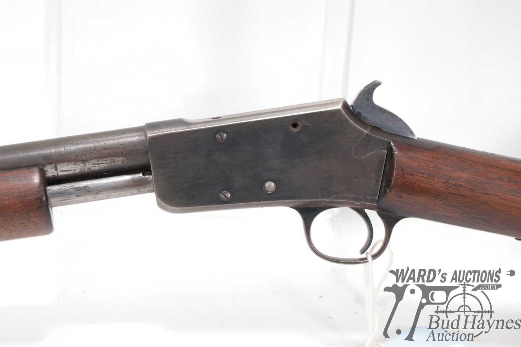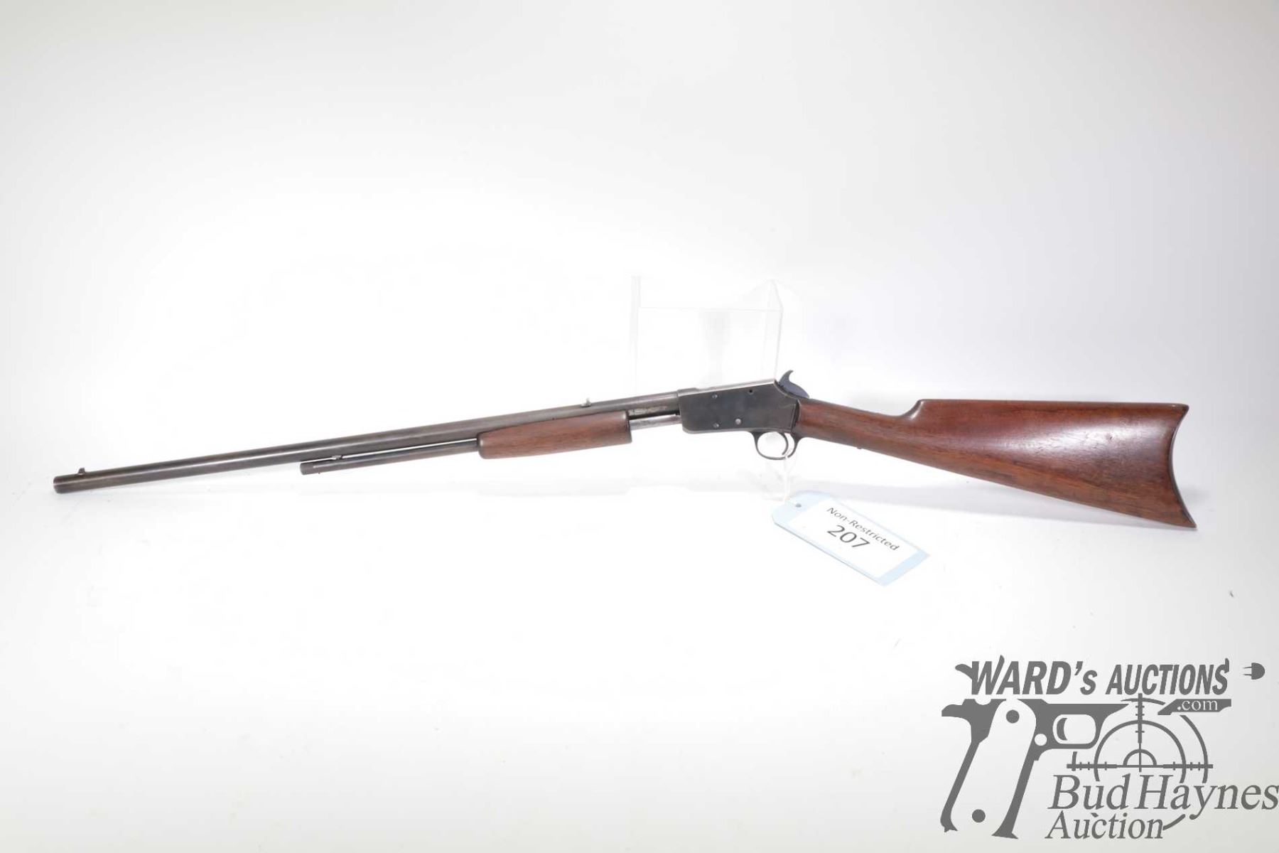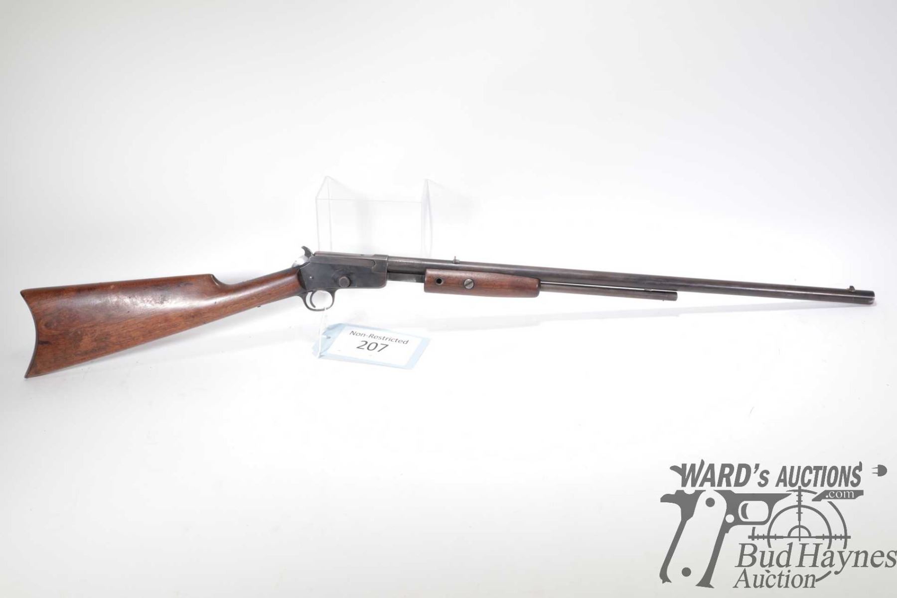 Non-Restricted rifle Marlin model 29, .22 S, L & LR pump action, w/ bbl length 23" [Blued barrel and receiver. Fixed sights. Smooth stock and forend wit curved metal butt plate. One screw missing and non-original screw on right side of forend. Screw missing on top and left side of receiver. Mechanically functions albeit a bit stiff. Bluing worn in use and handling areas, some surface pitting and other use, handling and storage marks.] serial # NIL, PAL required
