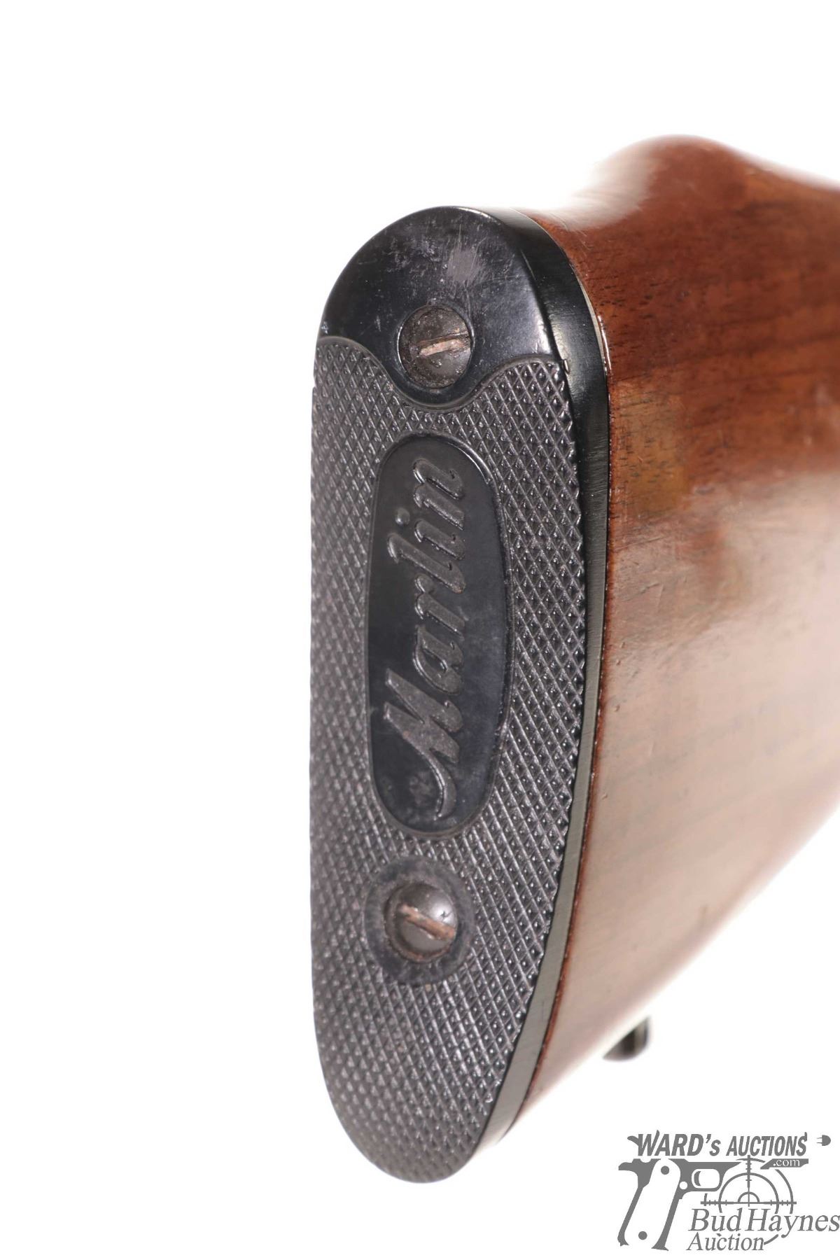 Non-Restricted rifle Marlin model 62 Levermatic, .256 Win Mag lever action, w/ bbl length 24" [Blued barrel and receiver. No fixed sights. Fitted with J.C. Higgins 4X scope. Includes one detachable box magazine. Smooth wooden stock with branded plastic butt plate. Fairly rare collector piece, shooting necked down 357 Magnum cases and issued without a serial number and although factory recalled offered customers to return rifles for serial numbering, this one was not returned. Mechanically appears near excellent with use, handling and storage marks on wood and metal.] serial # NIL, PAL required