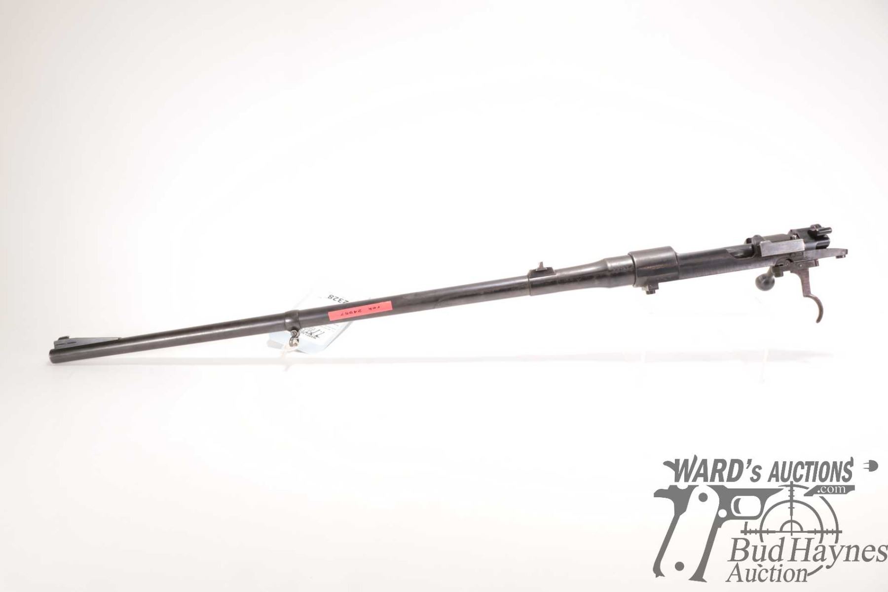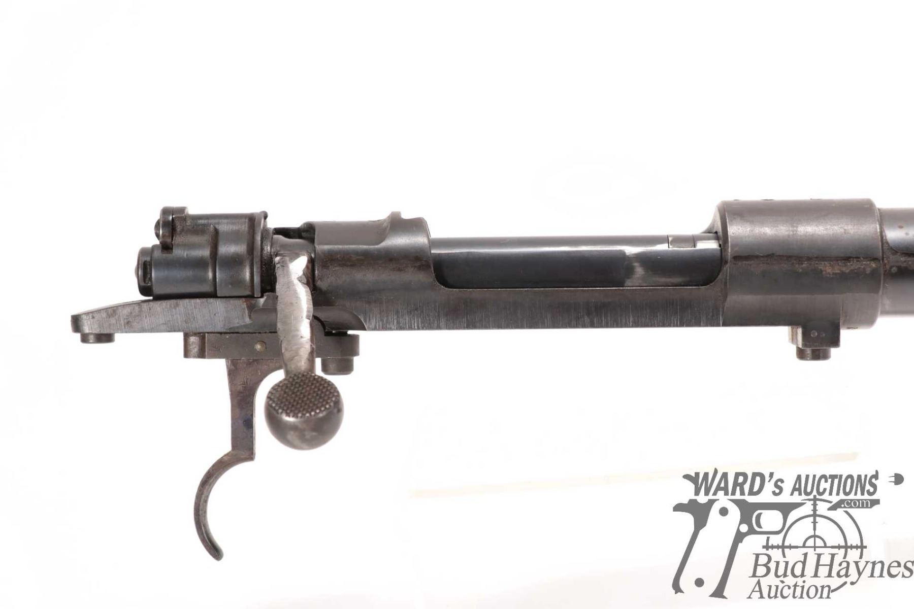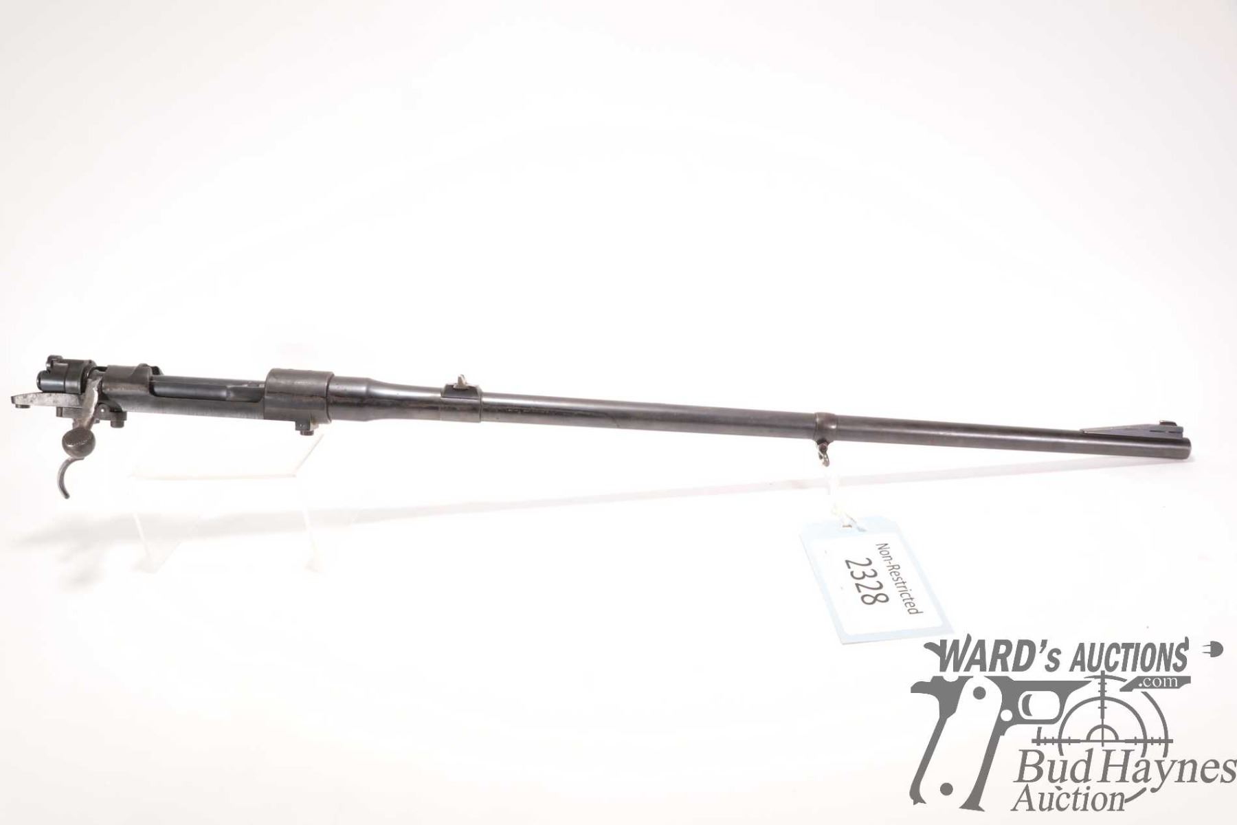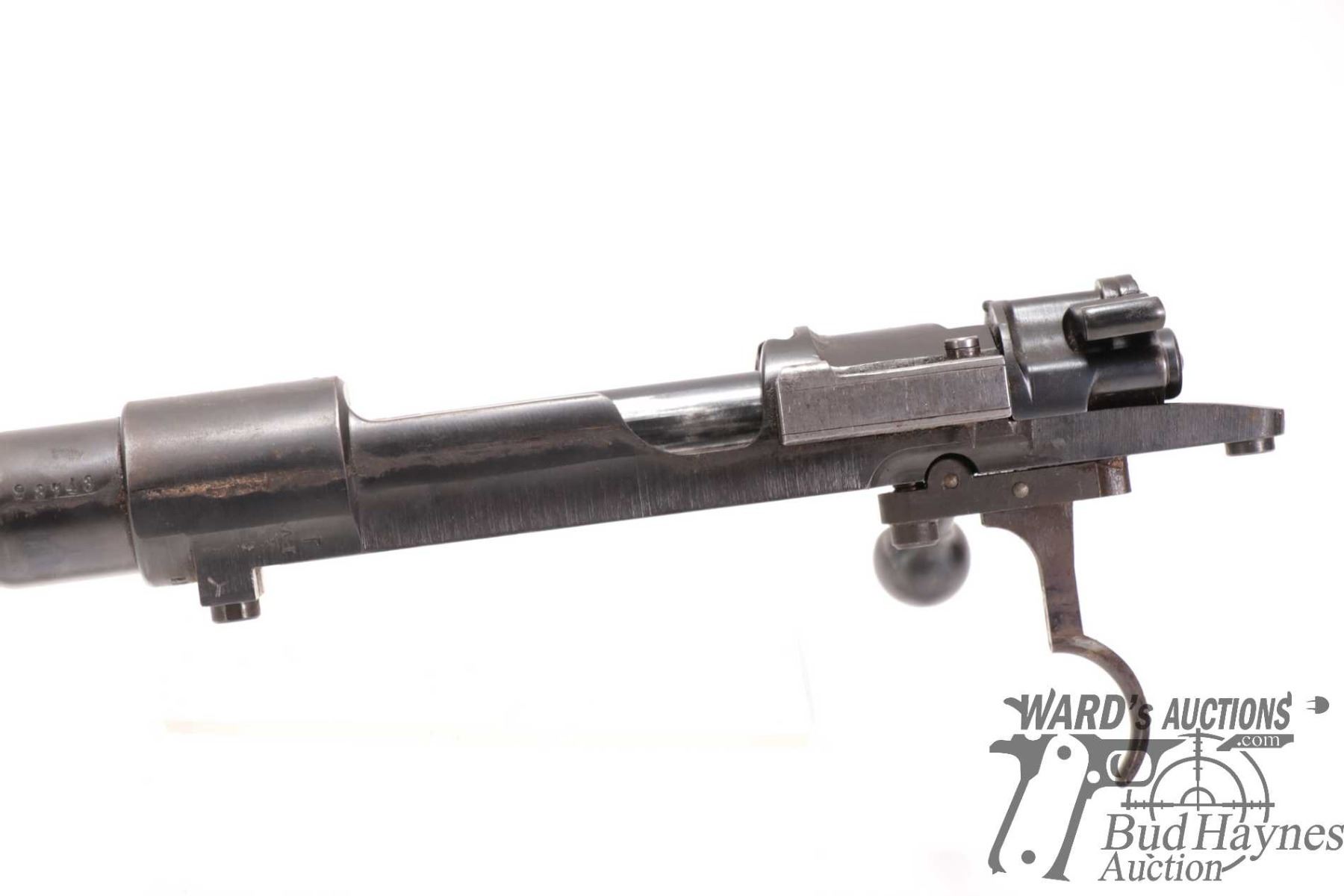 Non-Restricted rifle Mauser model 98, 9.3X57 bolt action, w/ bbl length 24" [Blued barrel and receiver. Fixed front and rear sights. Note: barrel and action only. Does not include stock. Action and trigger appear to function. Holes drilled in receiver for scope mount. Charging handle ground for clearance. Bluing worn in use and handling areas with some rust and pitting.] serial # 23743, PAL required