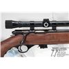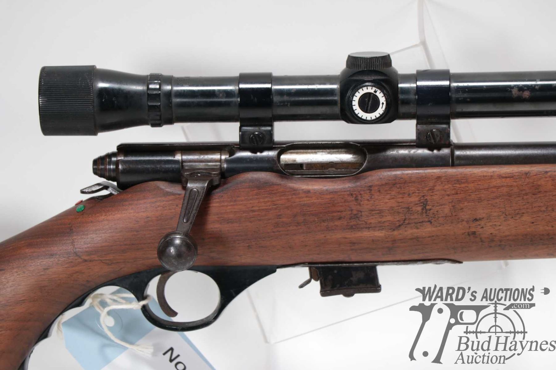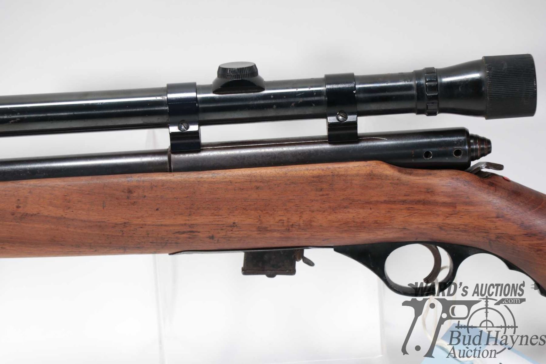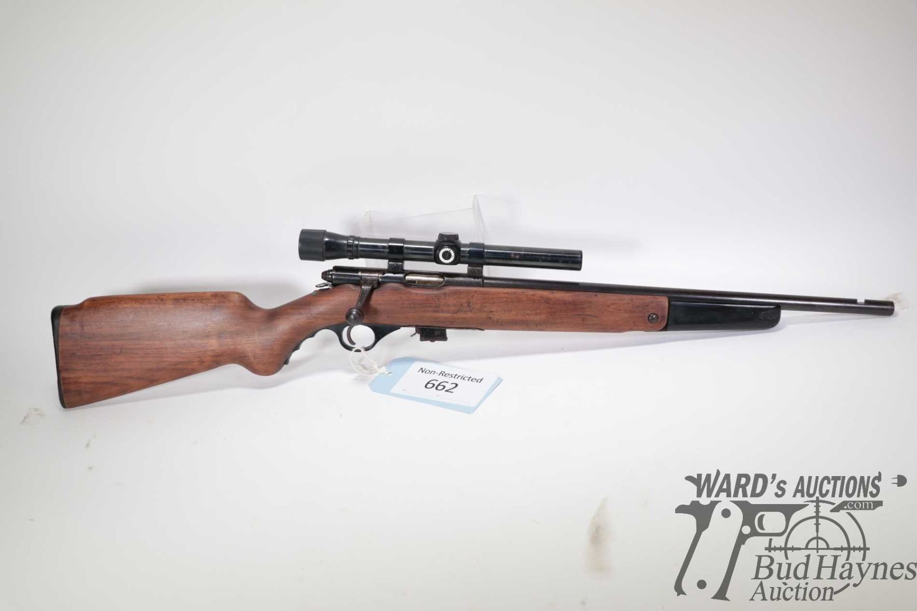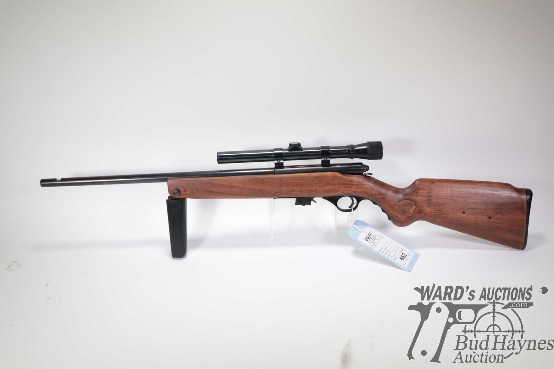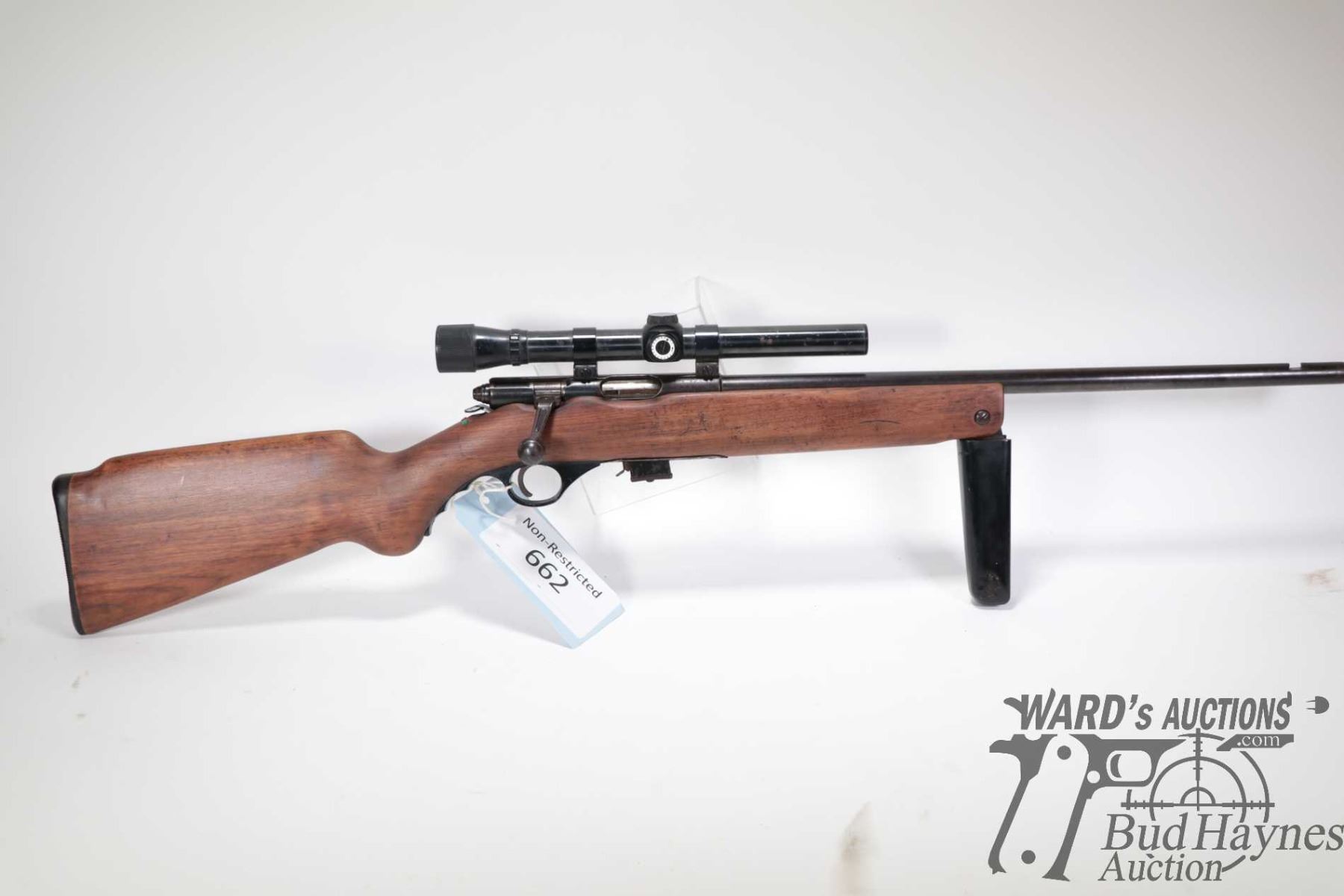 Non-Restricted rifle Mossberg model 142-A, .22 S, LR bolt action, w/ bbl length 18" [Blued barrel and receiver. Fixed sights removed. Fitted with Weaver D4 scope. Smooth wooden stock with plastic butt plate. Integral fold down support hand pistol grip. Includes one detachable magazine. Overall in heavily used condition with surface rust. Large repaired cracks in stock, holes in stock. Factory sling ring mounts missing plus other use, handling and storage marks.] serial # NIL, PAL required