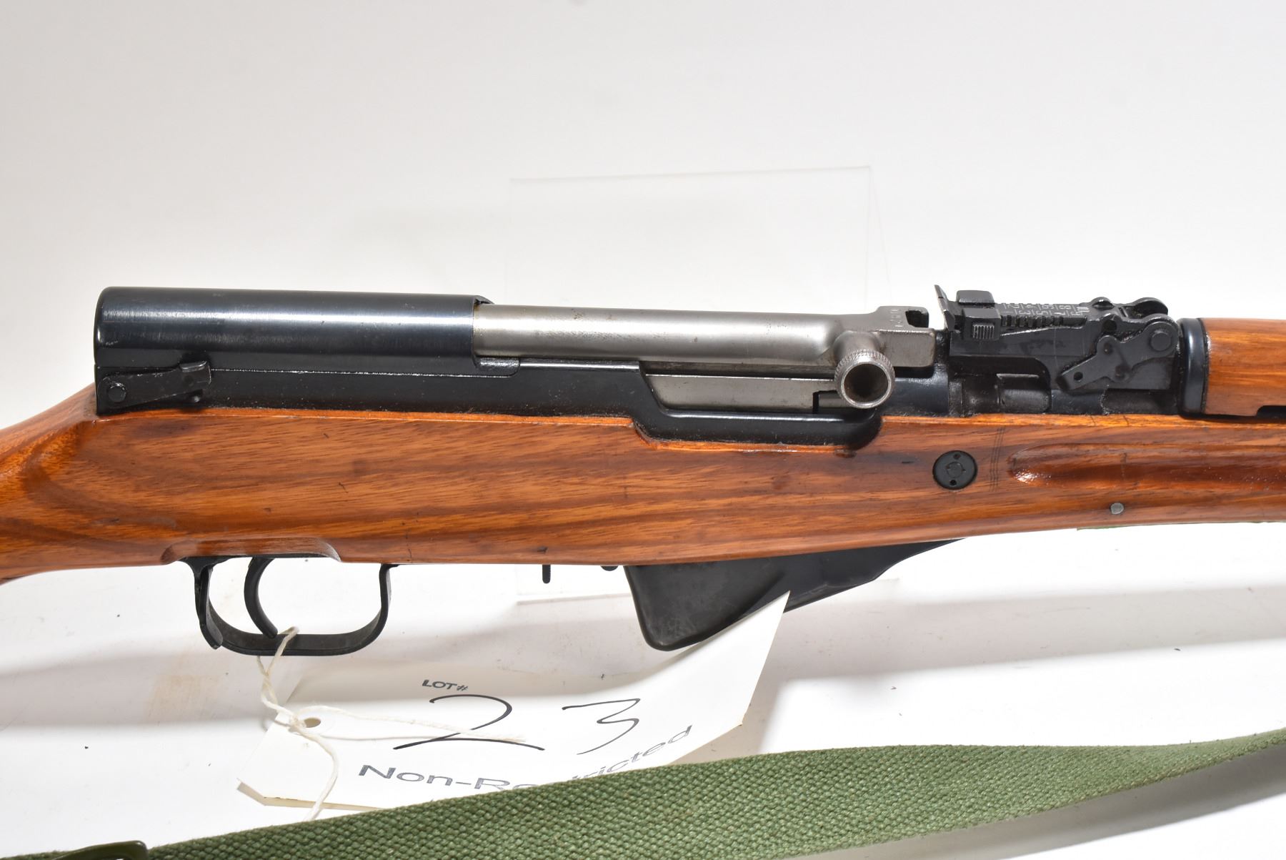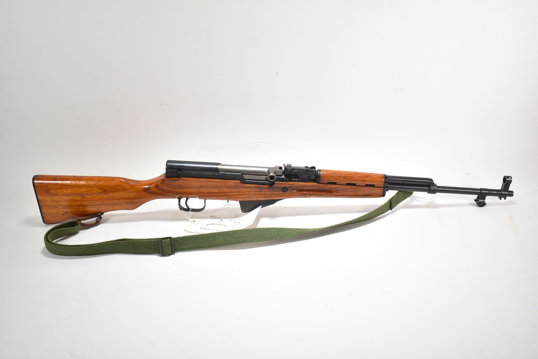 Non-Restricted rifle Norinco model SKS, 3.62X39 five shot semi automatic, w/ bbl length 20 1/2" [Blued barrel and receiver. Fixed front and adjustable rear sights. Smooth wooden stock with matching numbers on bolt and stock. Missing bayonet included green webbed strap. In expected surplus condition with use, handling and storage marks.] serial # 25001920, PAL required