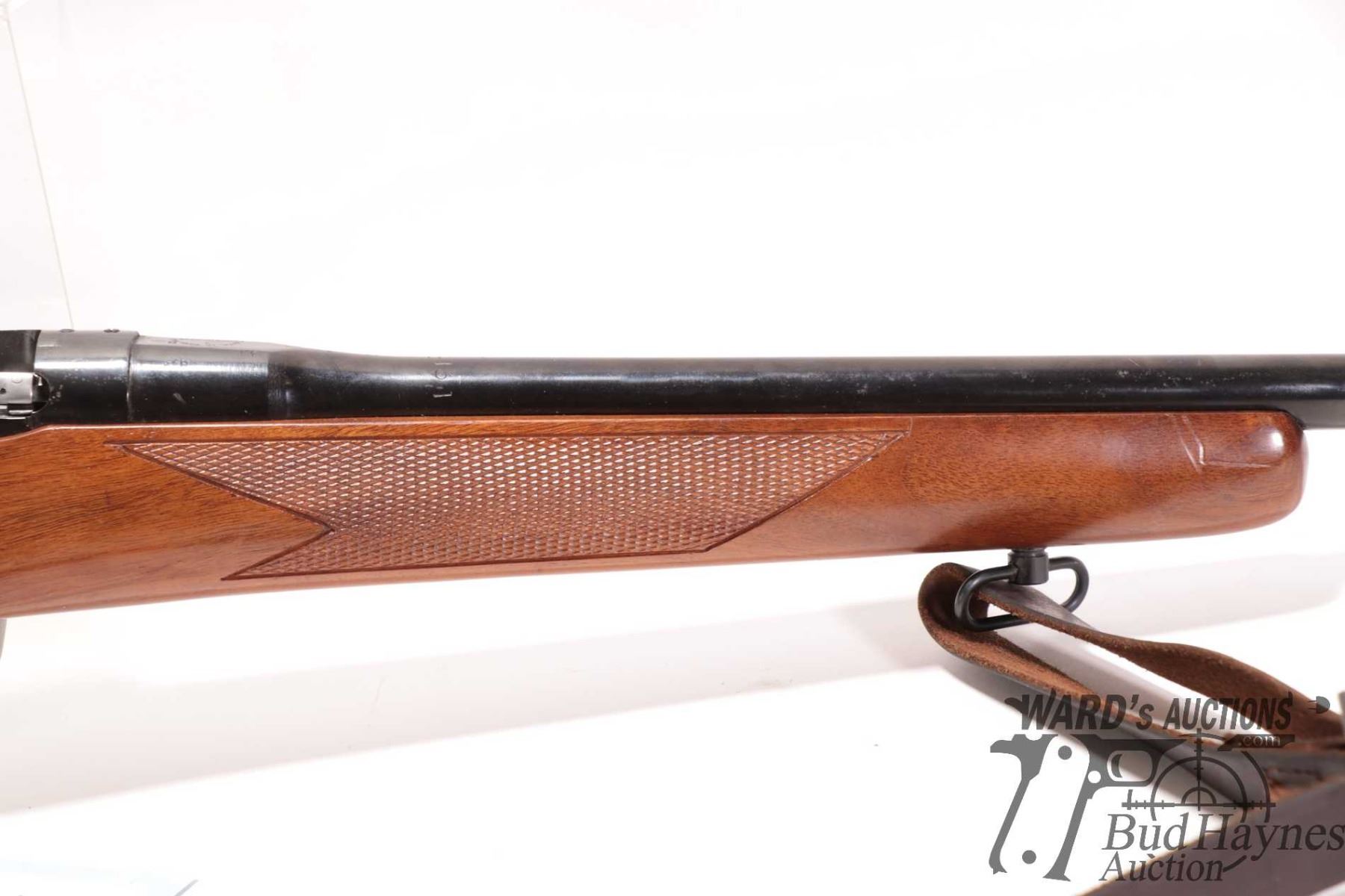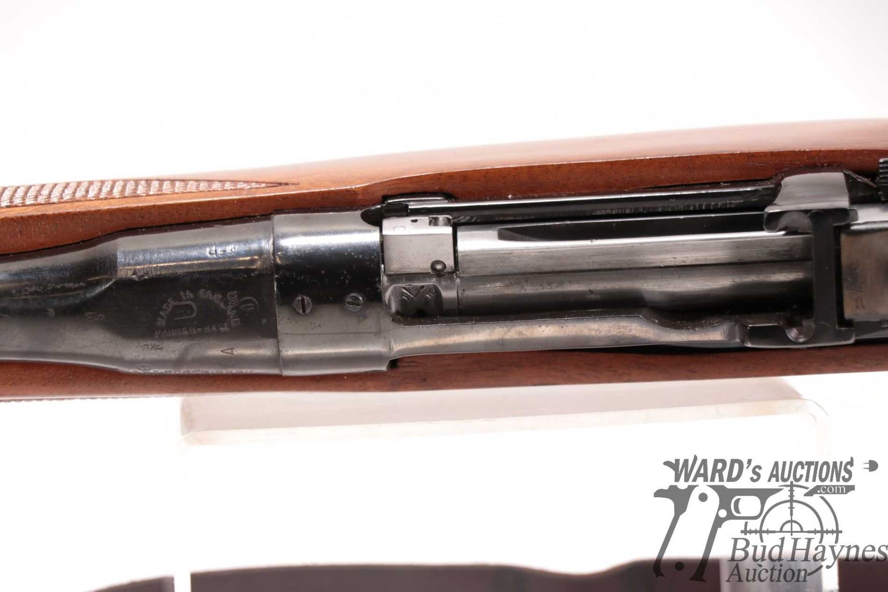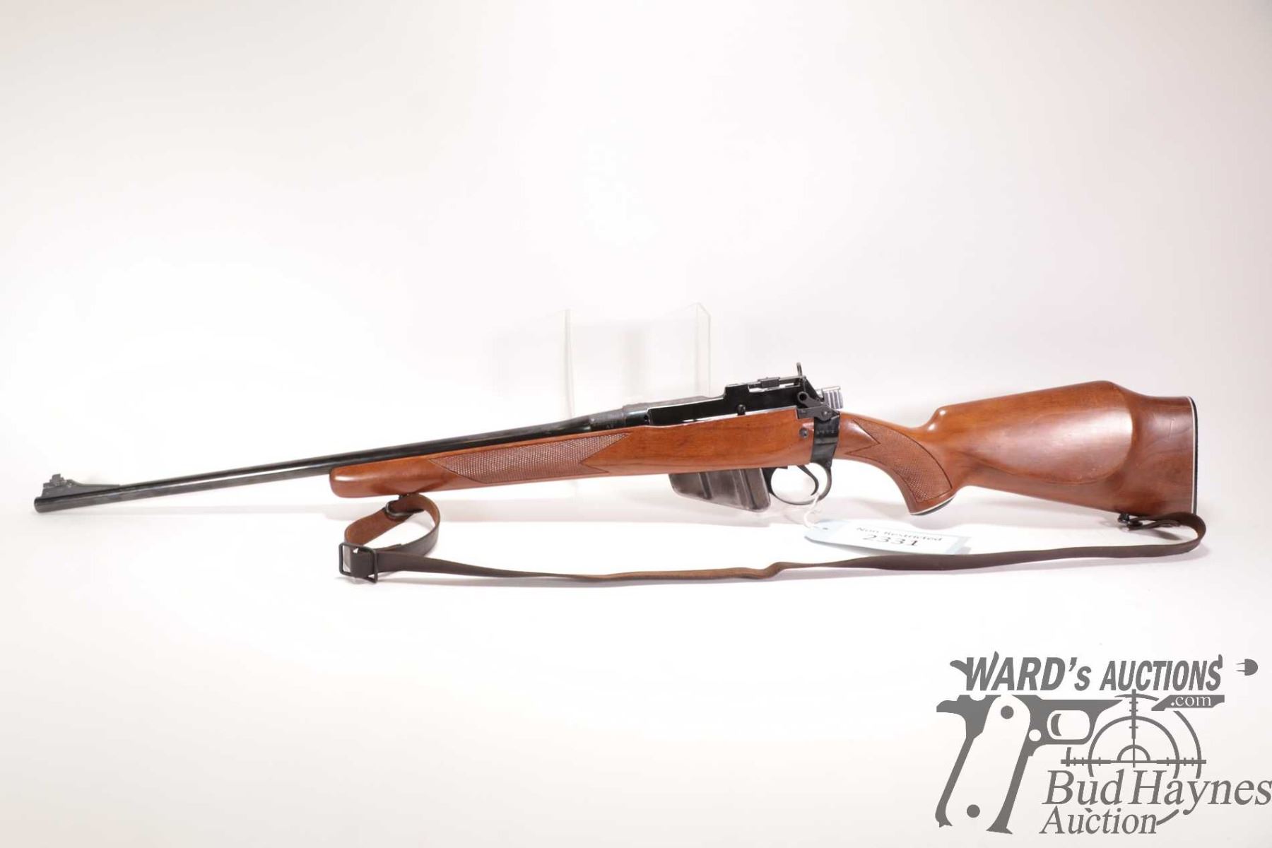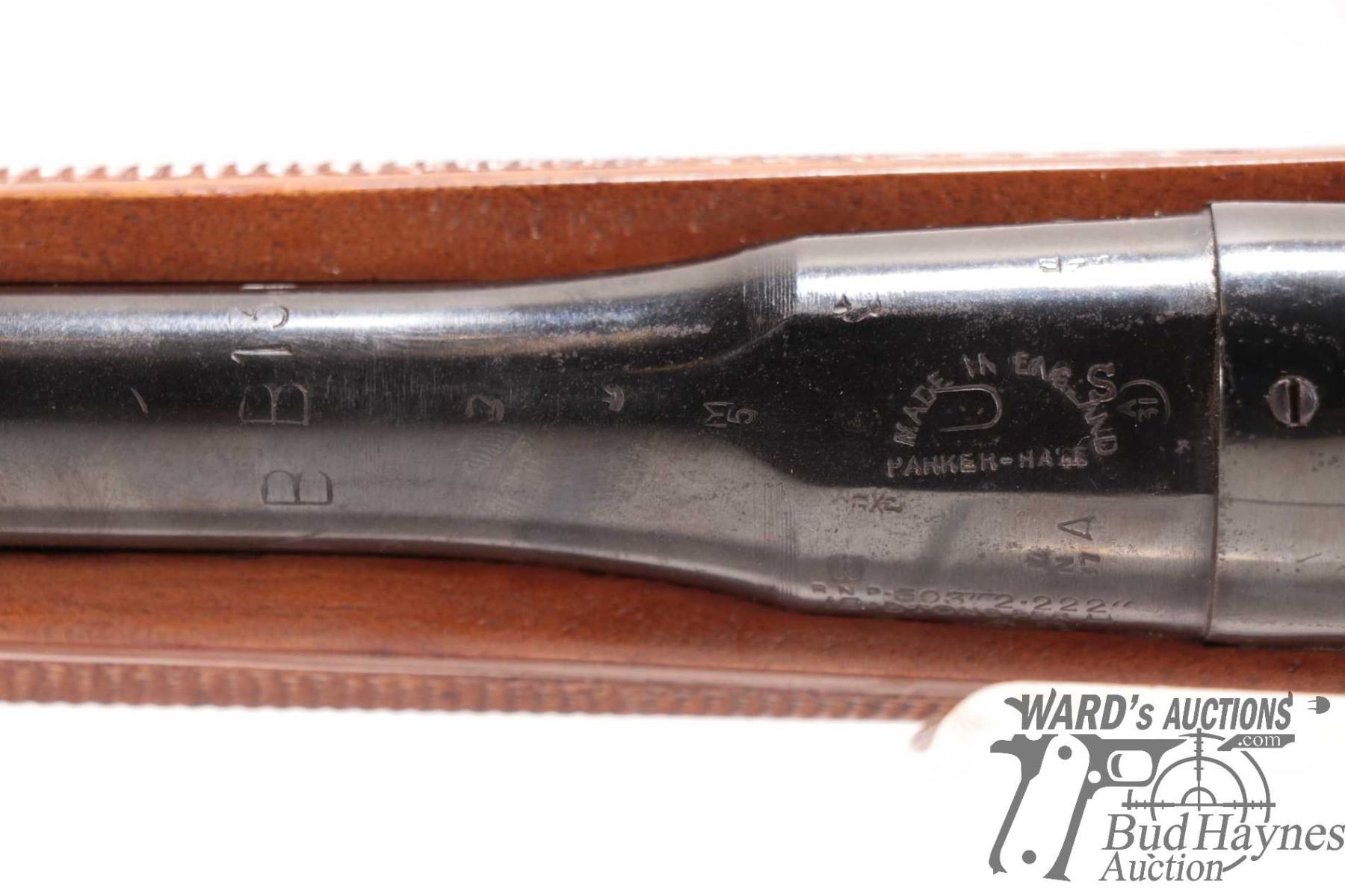 Non-Restricted rifle Parker Hale/ Enfield model No. 4, .303 British Ten shot bolt action, w/ bbl length 21 1/2" [Blued barrel and receiver. Fixed front and adjustable sights. Includes one detachable box magazine and leather sling. Sporter style stock with Parker Hale branded butt plate. Matching serial number on receiver and bolt. Top of barrel marked "MADE IN ENGLAND, PARKER HALE". Mechanically appears near excellent, likely had little use. Overall only minor use, handling and storage marks.] serial # B570, PAL required