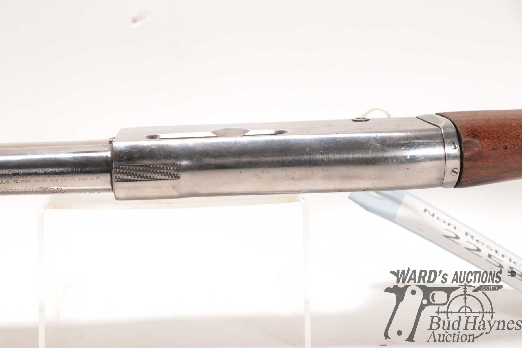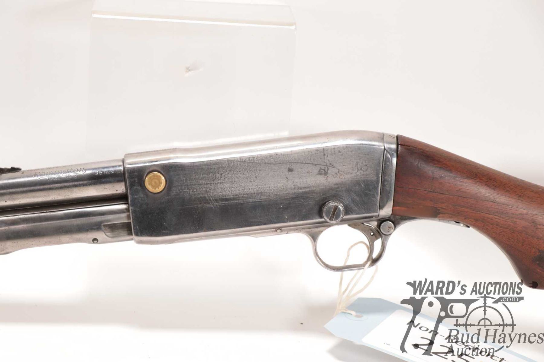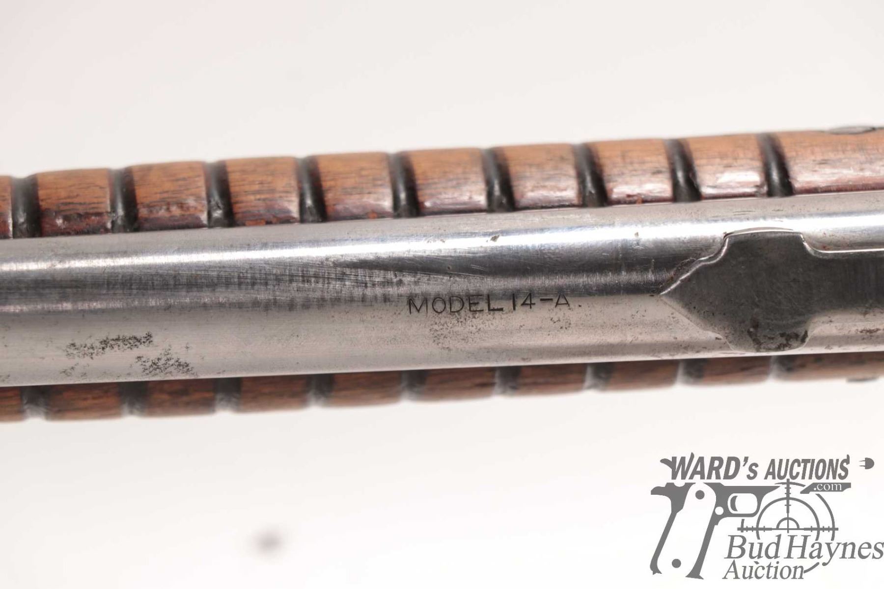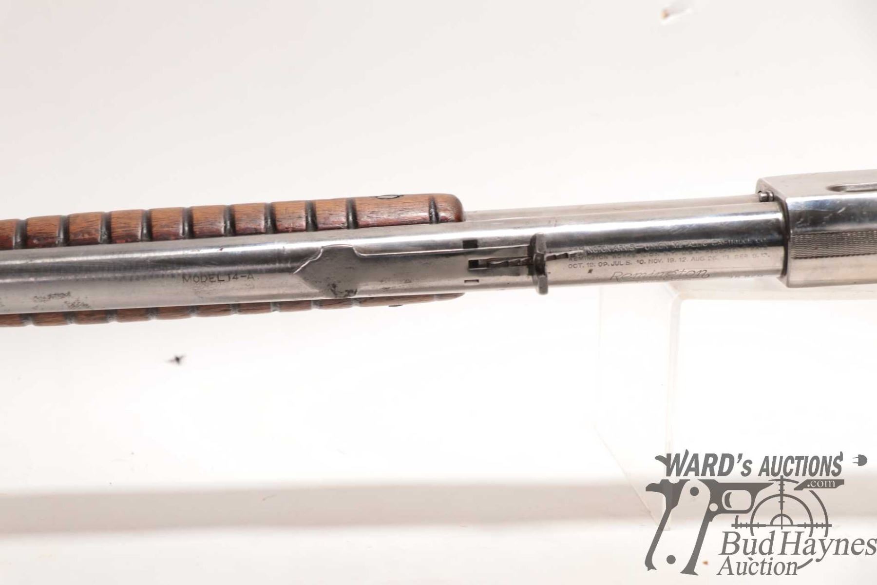 Non-Restricted rifle Remington model 14A, 35 Rem pump action, w/ bbl length 22" [Bluing stripped off barrel and receiver. Fixed front and adjustable rear sights. Tubular magazine. Smooth wooden stock with metal butt plate. Mechanically appears to function reasonably well. Mechanical polishing of metal has reduced definition on stampings. Some surface rust and pitting. Large repaired crack on stock and other use, handling and storage marks.] serial # C77482, PAL required