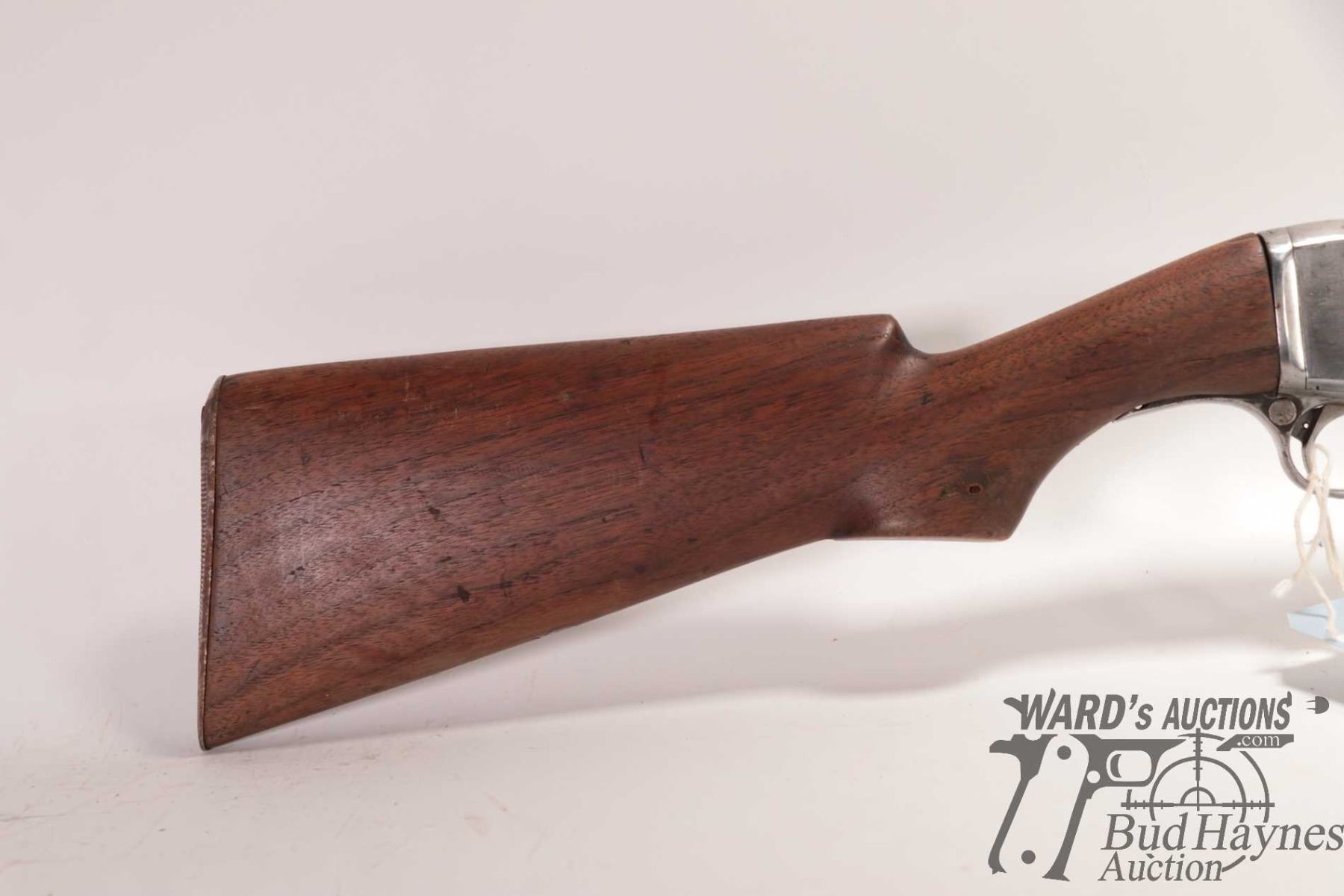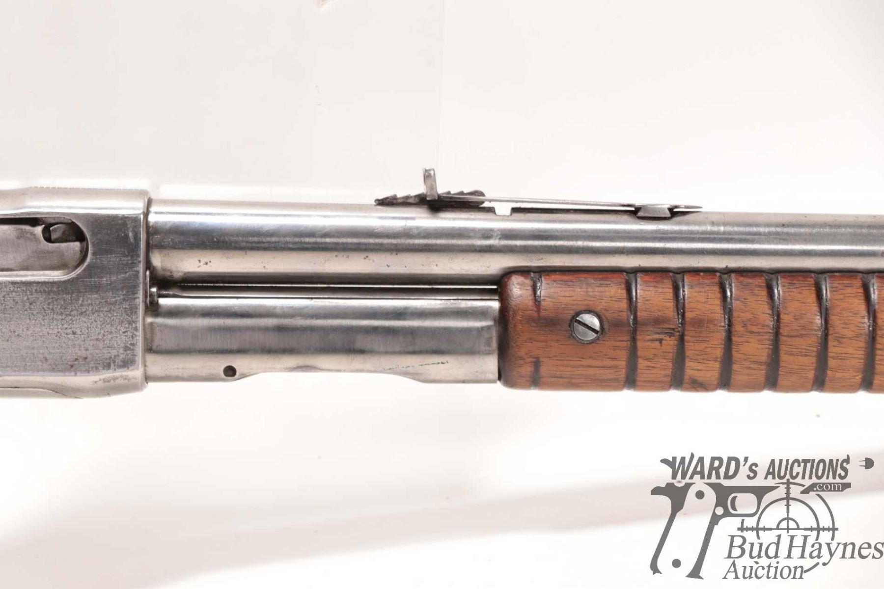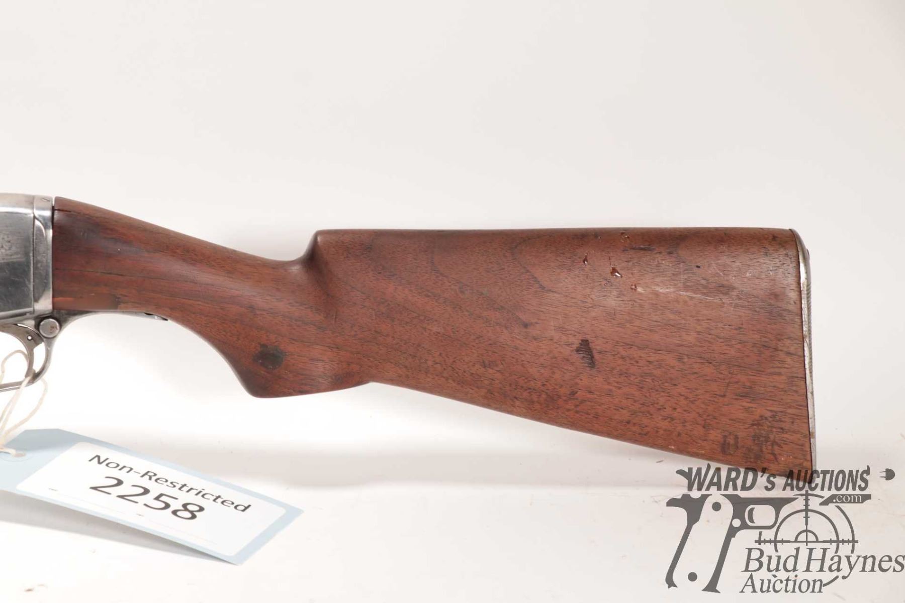 Non-Restricted rifle Remington model 14A, 35 Rem pump action, w/ bbl length 22" [Bluing stripped off barrel and receiver. Fixed front and adjustable rear sights. Tubular magazine. Smooth wooden stock with metal butt plate. Mechanically appears to function reasonably well. Mechanical polishing of metal has reduced definition on stampings. Some surface rust and pitting. Large repaired crack on stock and other use, handling and storage marks.] serial # C77482, PAL required