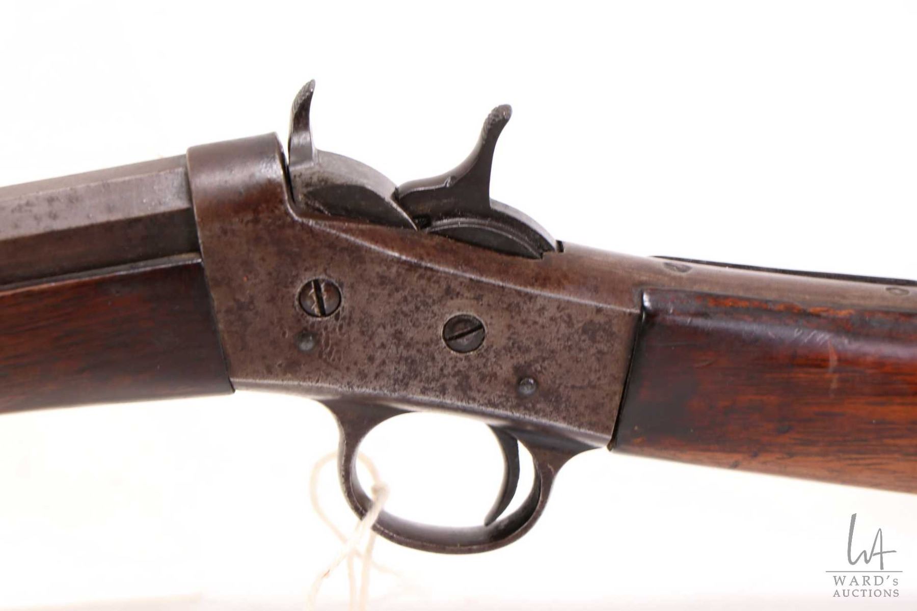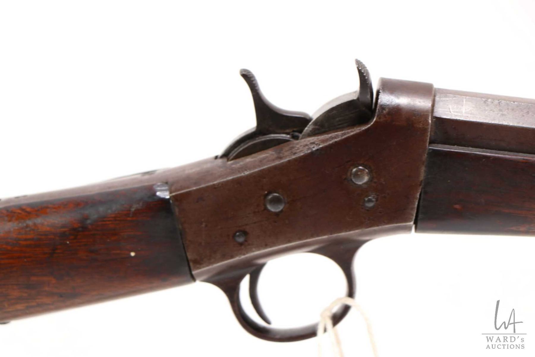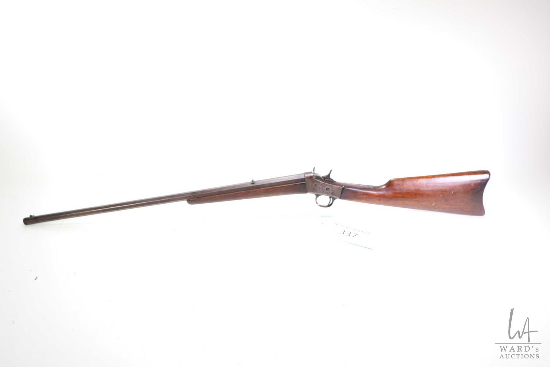 Non-Restricted rifle Remington model #4, 32 Rimfire Single Shot rolling block, w/ bbl length 24" [Blued octagonal barrel turning brown grey. Fixed front and rear sights. Smooth straight stock with metal butt plate. Slight surface pitting and rust on metal parts. Action and trigger function reasonably smoothly. Appears to be nice original patina with use, handing and storage marks to wood and metal.] serial # 122832, PAL required