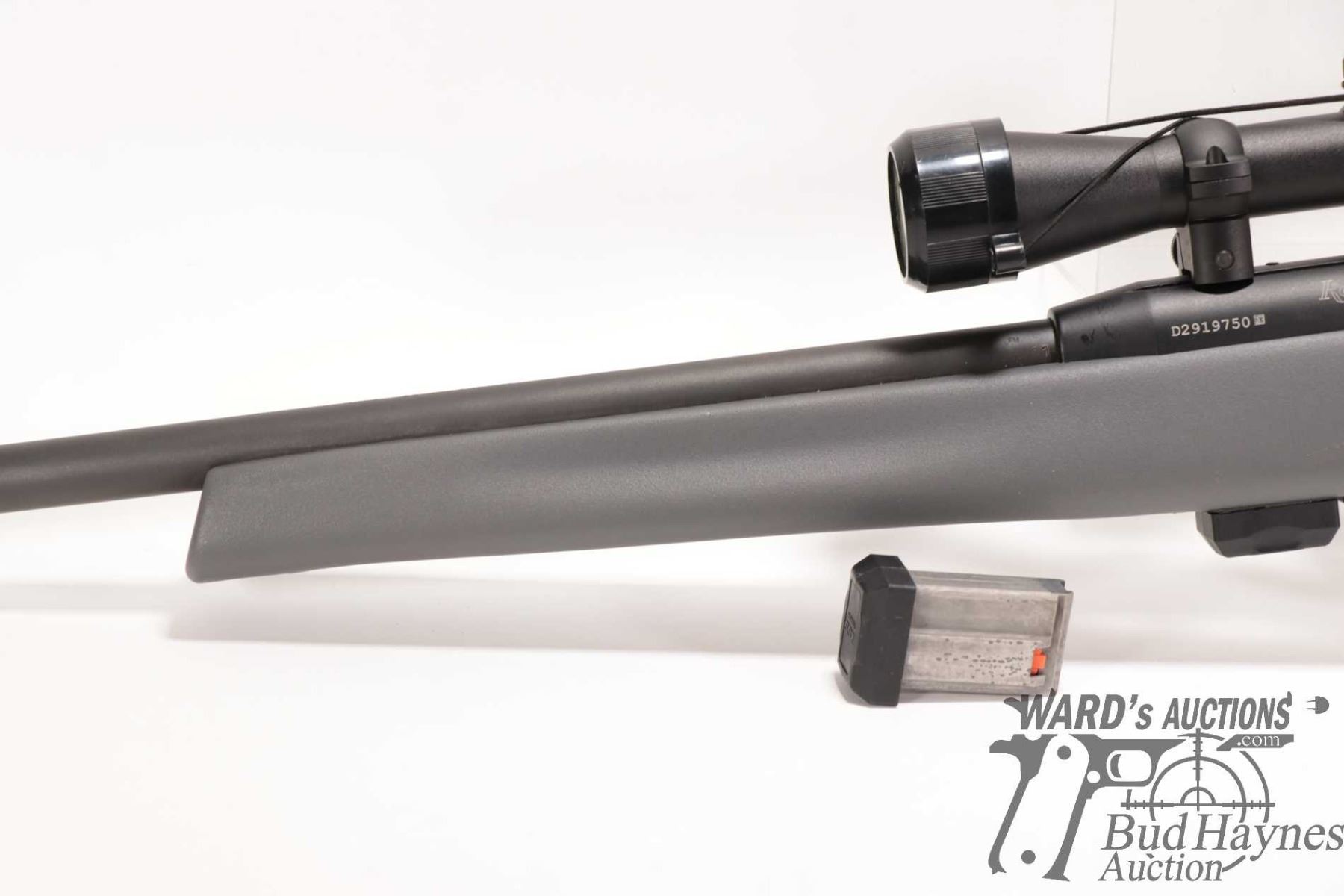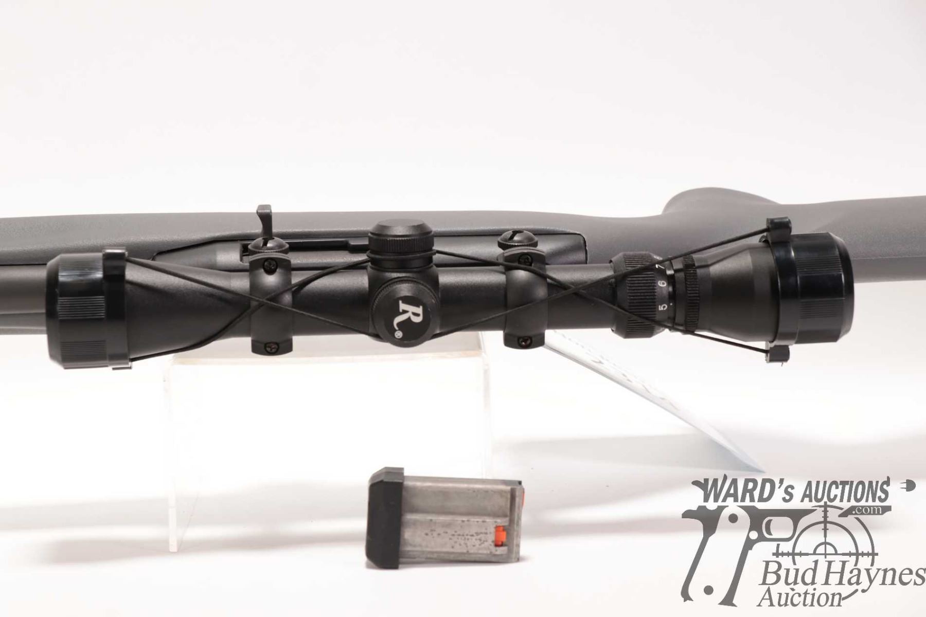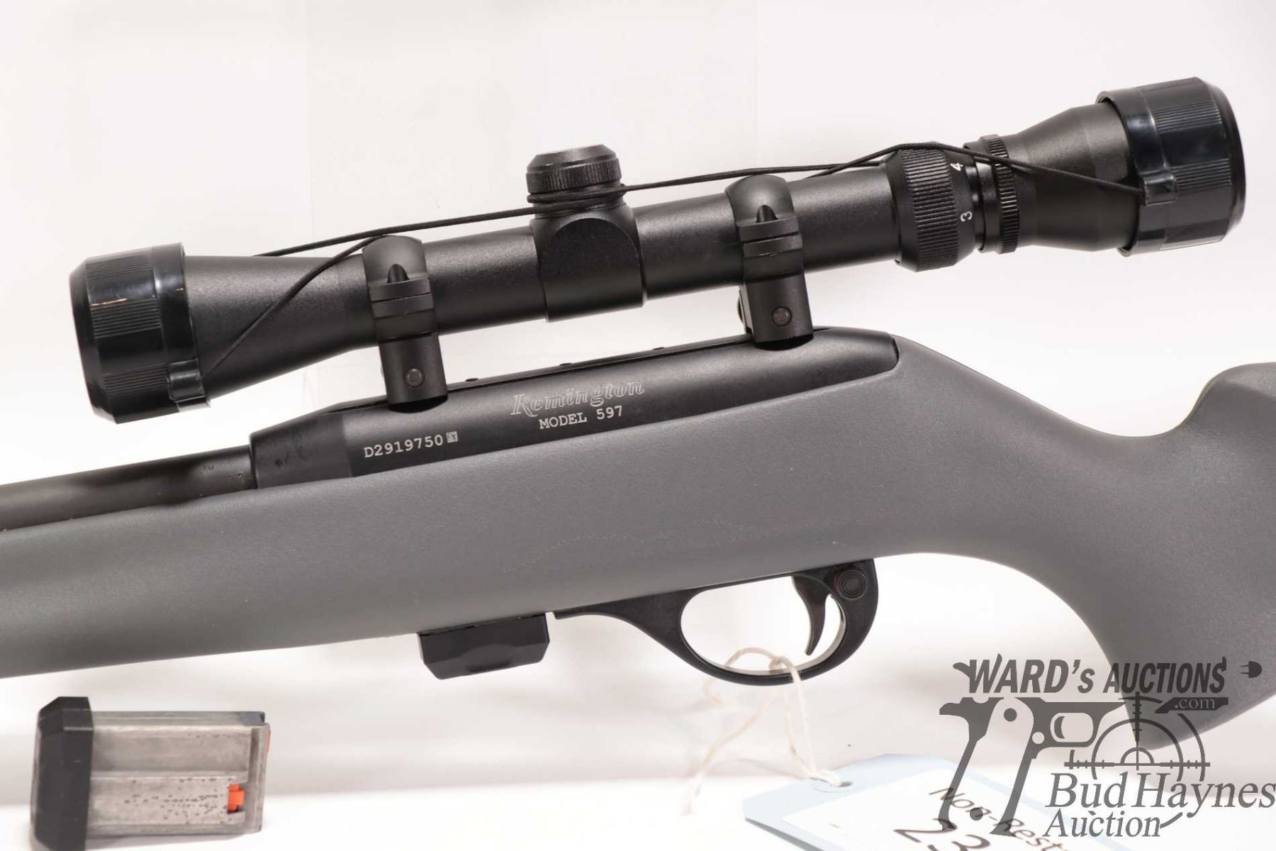 Non-Restricted rifle Remington model 597, .22 LR semi automatic, w/ bbl length 20" [Satin black finish on barrel and alloy receiver. No fixed sights. Fitted with Remington branded 3-9X32 scope. Includes two detachable box magazines. Grey synthetic stock with plastic butt plate. Mechanically and aesthetically appear near excellent with only minor use, handling and storage marks.] serial # D2919750, PAL required