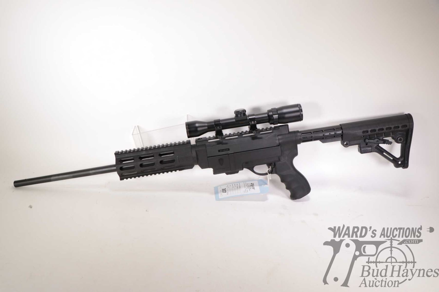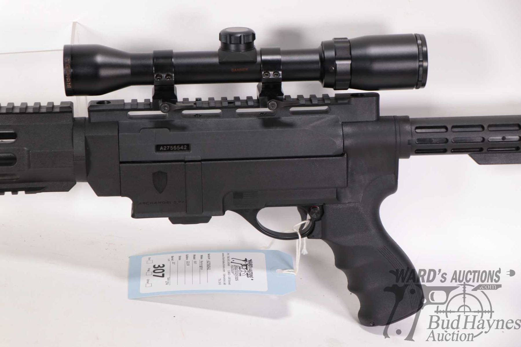 Non-Restricted rifle Remington model 597, 22 LR ten shot semi automatic, w/ bbl length 20" [Black finish with Archangel 5.97 tactical conversion including extending stock, pistol grip, forend with rail top and bottom and flat top rail. No fixed sights. Fitted with Bushnell Banner scope and includes one detachable magazine. Appears to have had very little use with only minor use, handling and storage marks.] serial # A2756542, PAL required