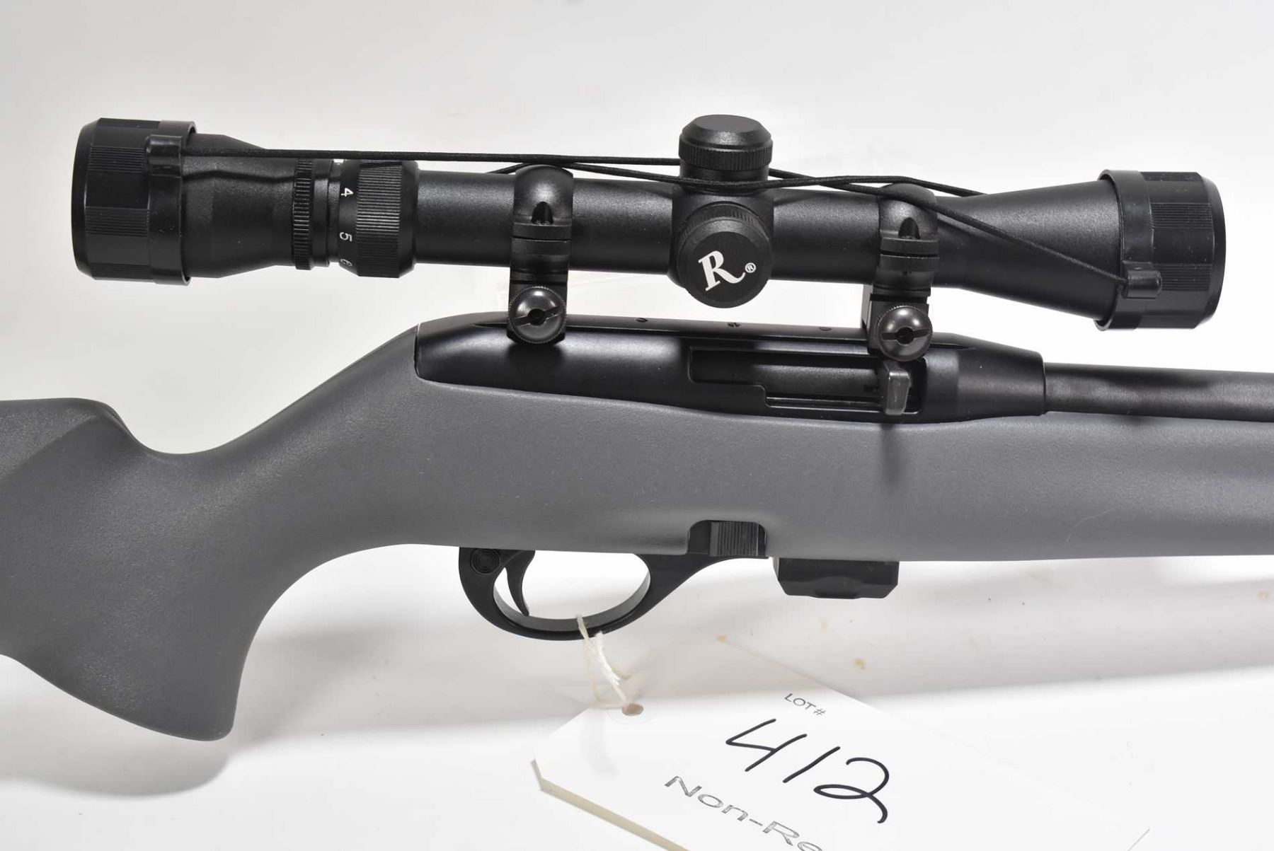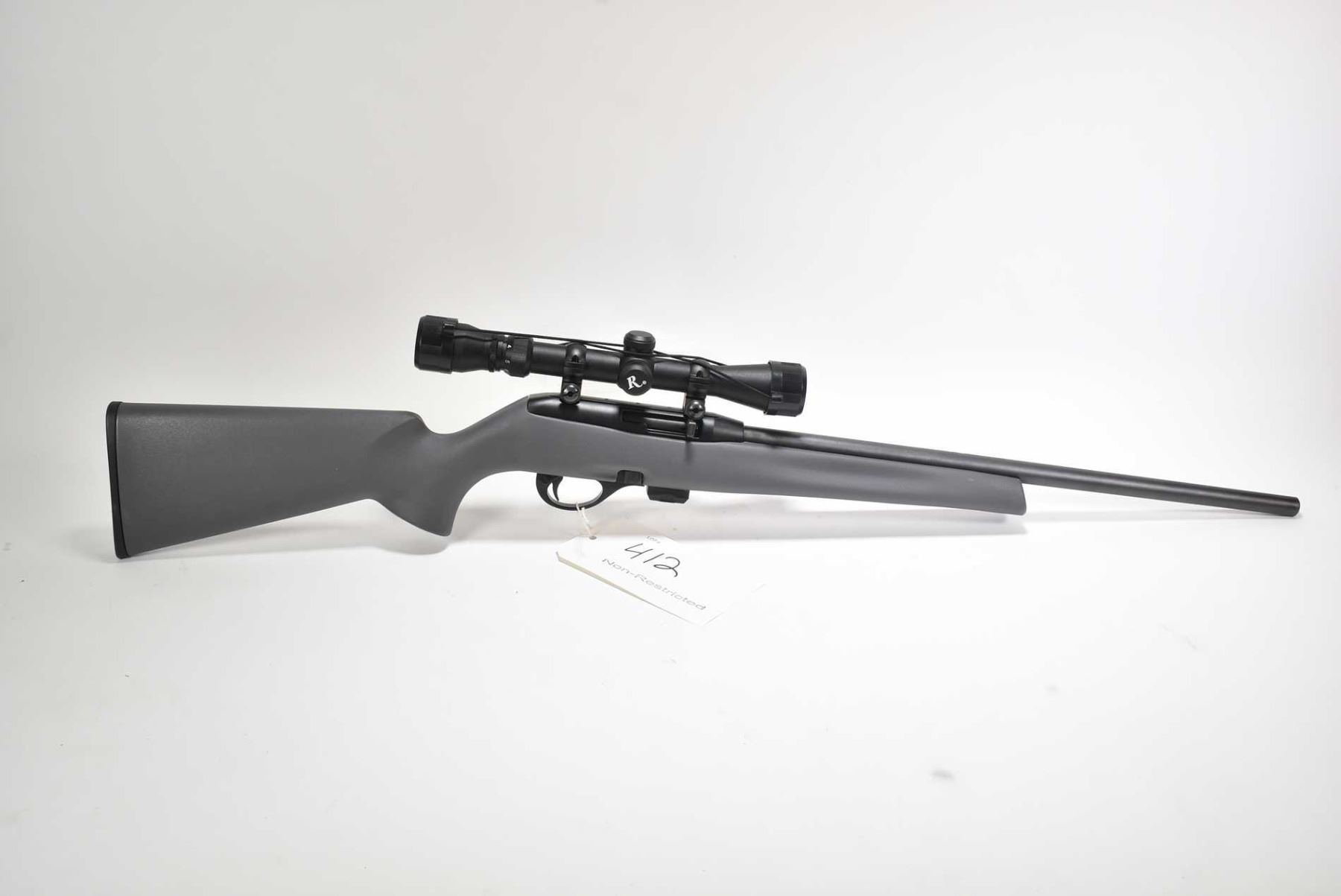 Non-Restricted rifle Remington model 597, .22 LR ten shot semi automatic, w/ bbl length 20" [Blued barrel and receiver. Synthetic gray stock with branded hard plastic butt plate. Fitted with Remington 3-9X32 scope. Appears to have had light use. Nicks and marks to stock and metal. Storage, use and handling marks] serial # D2949389, PAL required