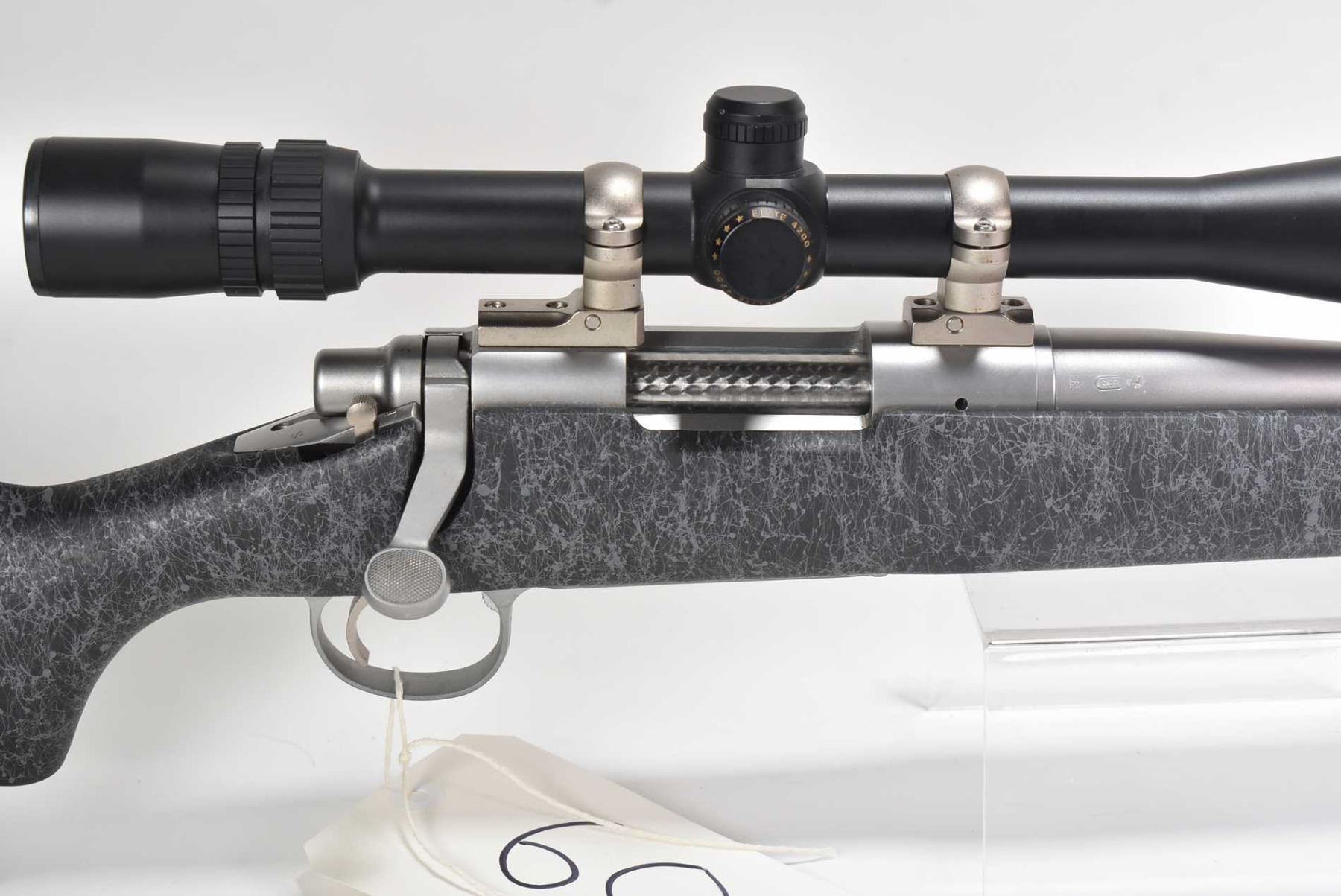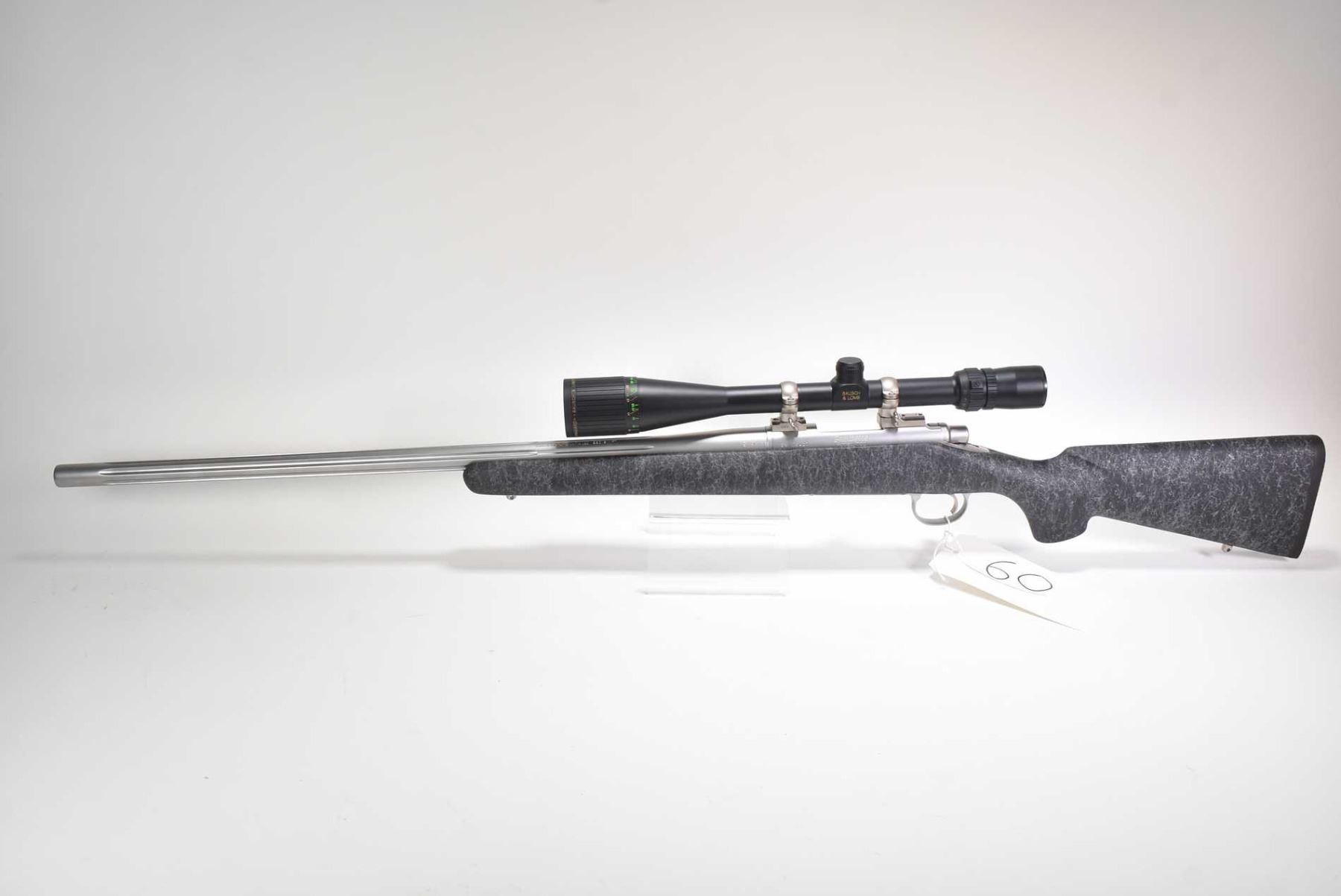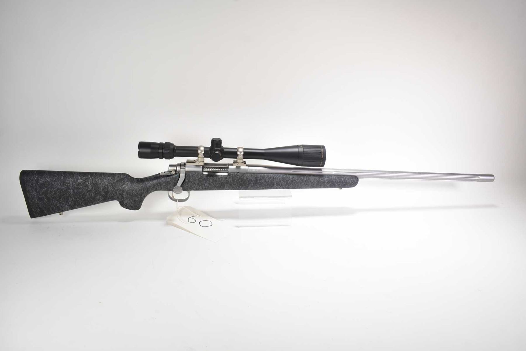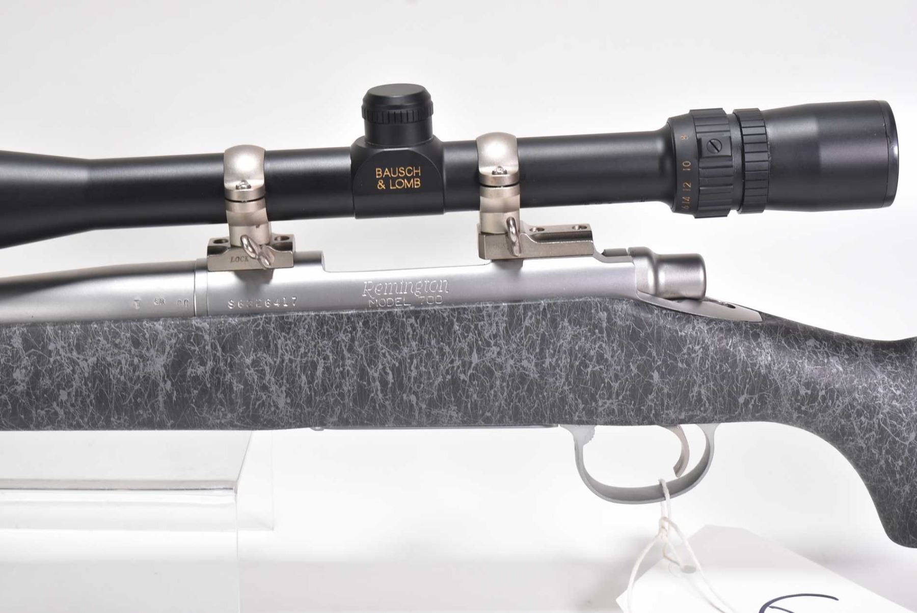 Non-Restricted rifle Remington model 700, 220 Swift bolt action, w/ bbl length 26" [Heavy stainless fluted barrel, stainless receiver. Fitted with Bausch & Lomb 6-24X40 scope. Synthetic black and grey web stock with rubber butt plate. Action is smooth. Has had light use with marks and nicks to metal and stock. Handling, use and storage marks] serial # S6326417, PAL required