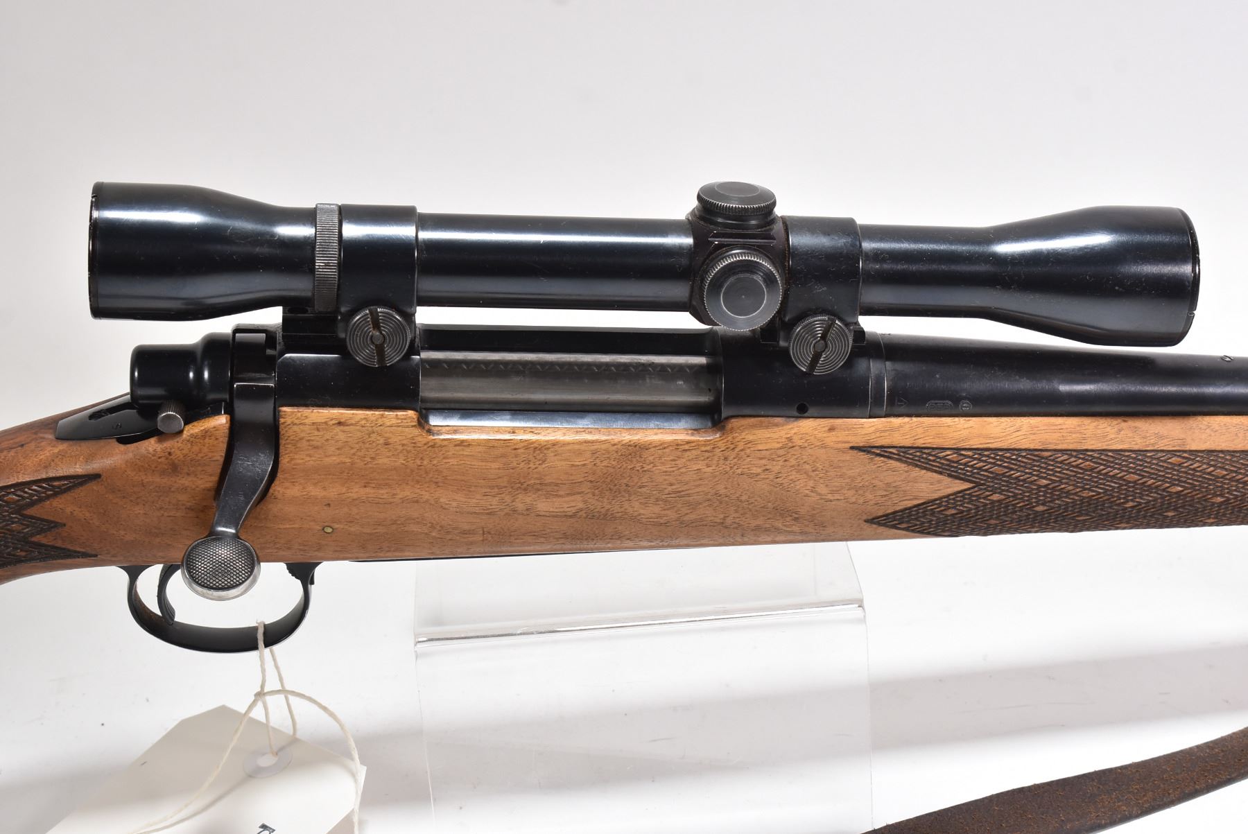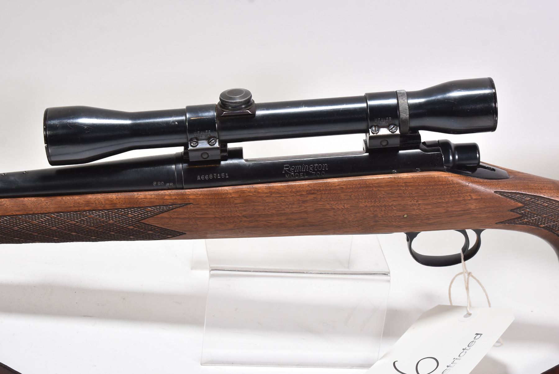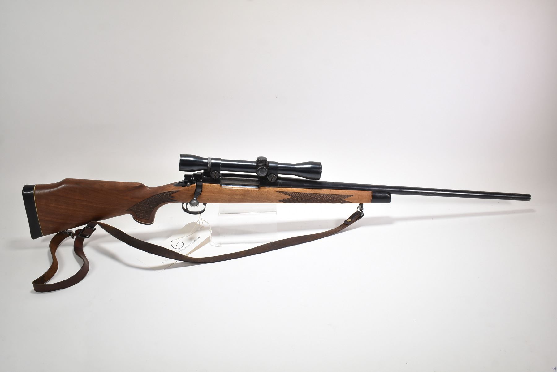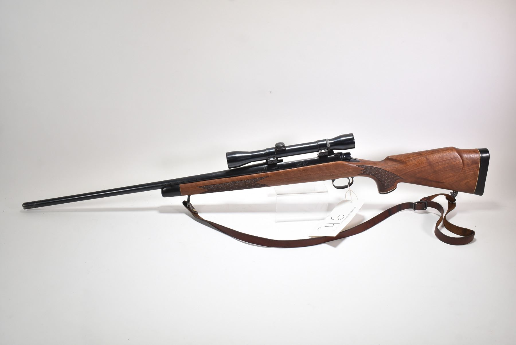 Non-Restricted rifle Remington model 700, 300 Win Mag bolt action, w/ bbl length 24" [Blued barrel and receiver. Fixed front and adjustable rear sights, detached and included in baggy, mounted with a unknown scope. Checkered wooden stock and foregrip with rubber butt plate. Sling rings with leather sling. Bluing turning grey on end of barrel. In used condition with nicks, scratches and marks to wood and metal.] serial # A6687151, PAL required