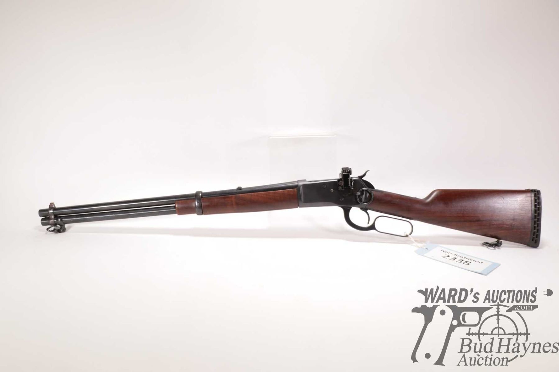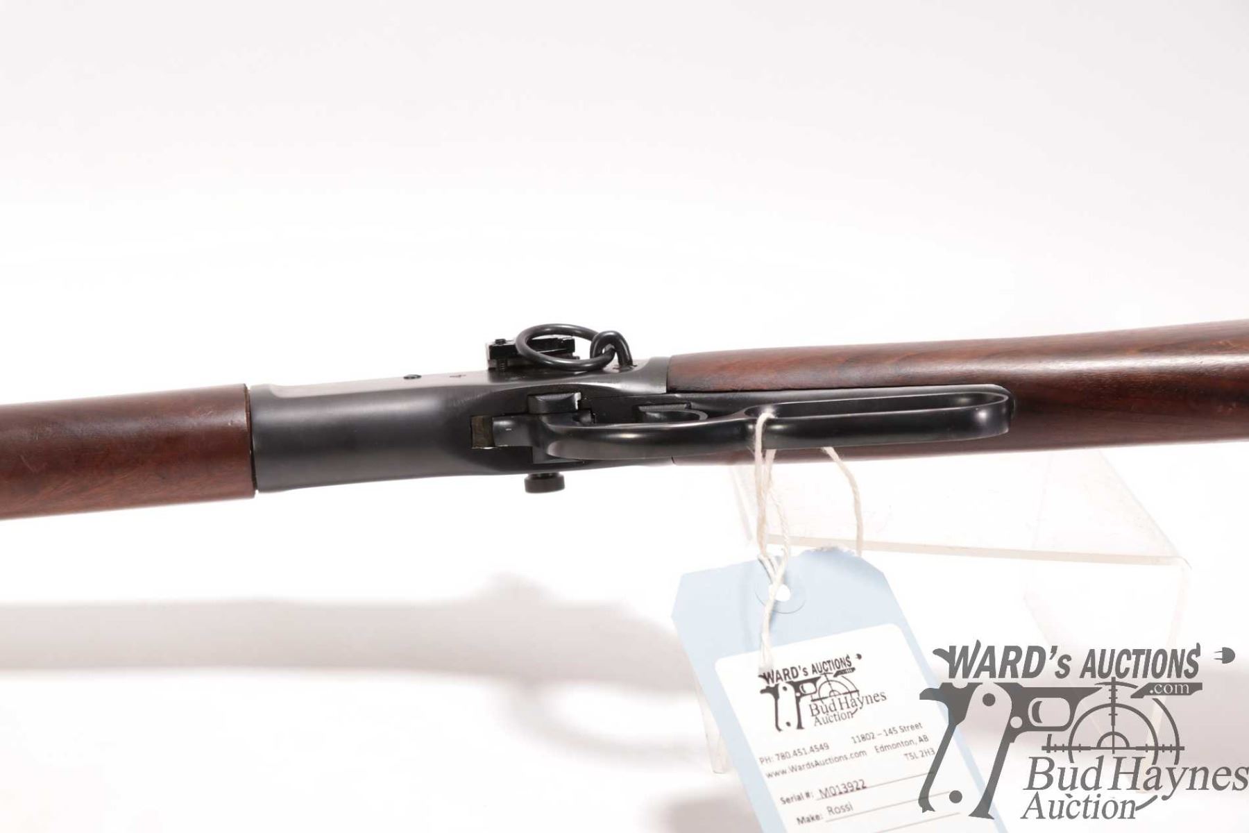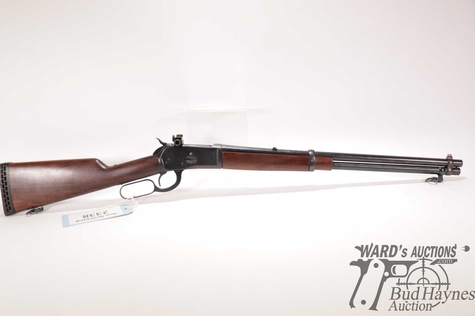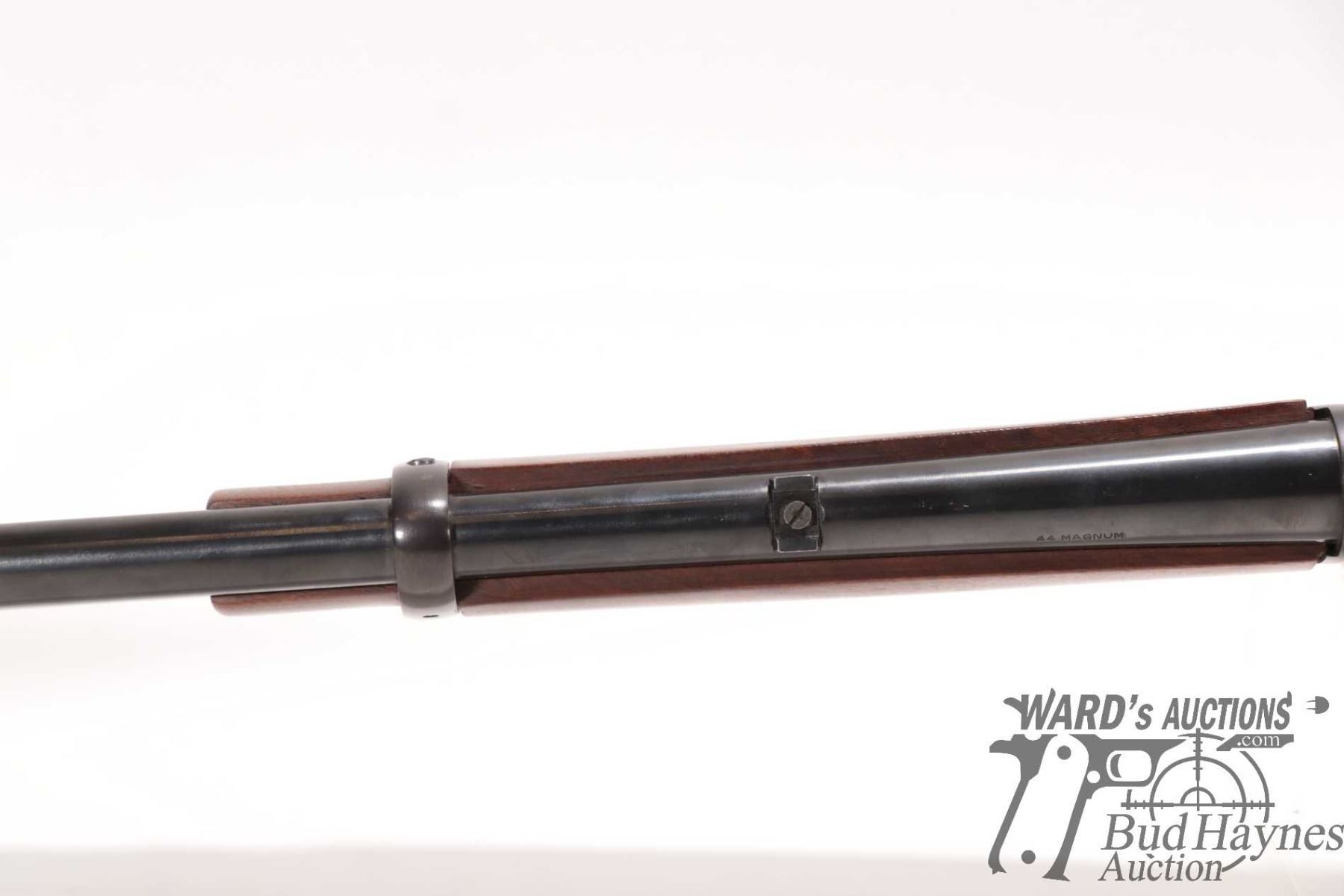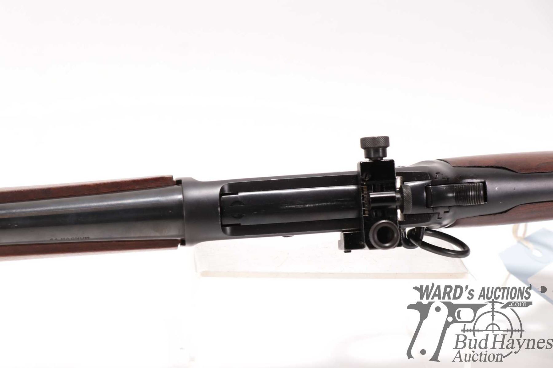 Non-Restricted rifle Rossi 44 Magnum lever action, w/ bbl length 20" [Blued barrel, receiver and full length tube. Fixed front sight. Original rear sight removed and fitted with adjustable peep sight. Smooth wooden stock with Uncle Mike's branded recoil pad. Fitted with sling mounts attached to stock and magazine tube. Mechanically appears to function reasonably well. Bluing worn in use and handling areas plus tooling marks on screws etc. plus other use, handling and storage marks.] serial # M013922, PAL required