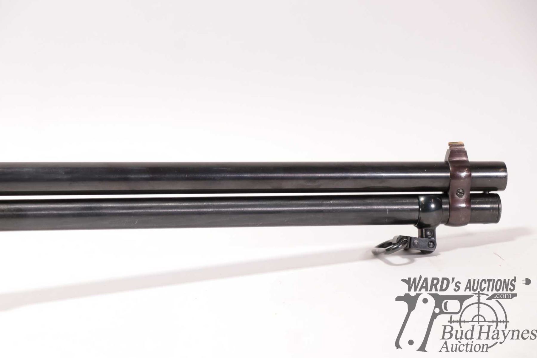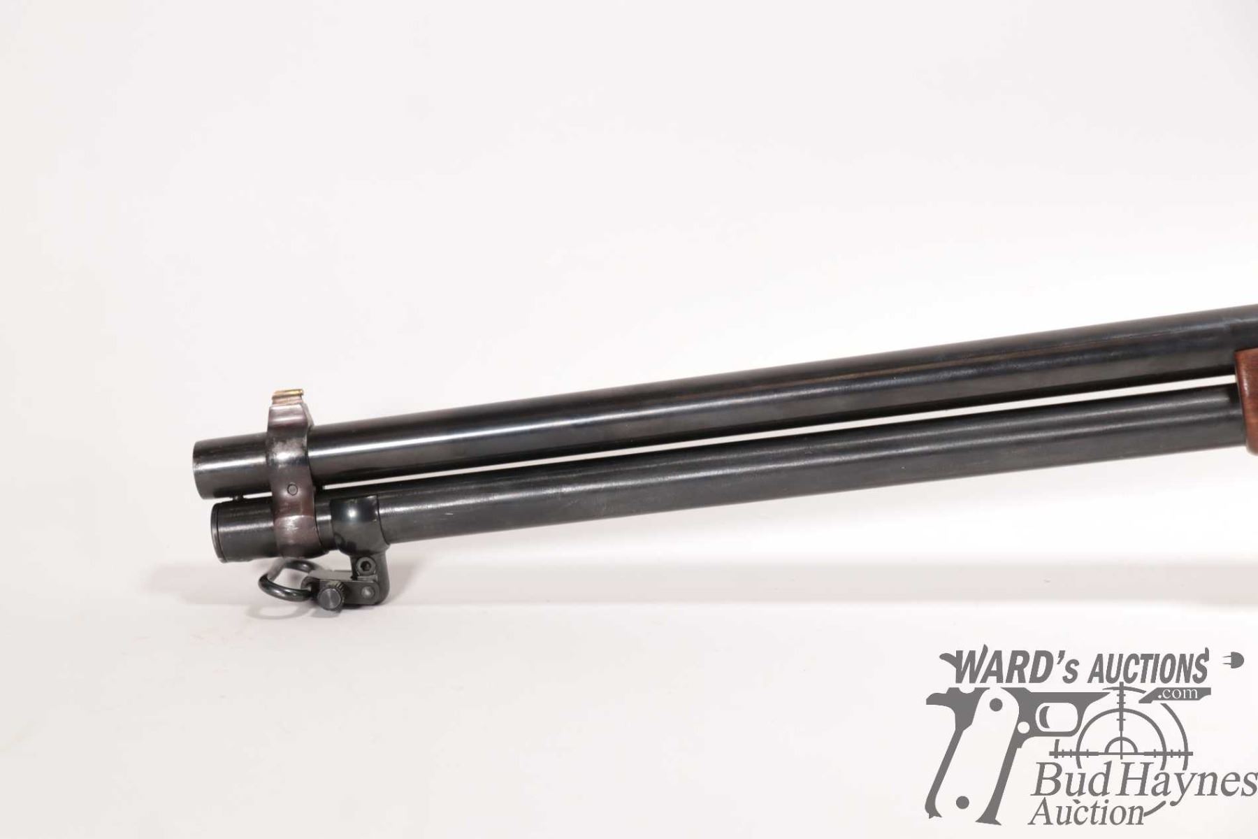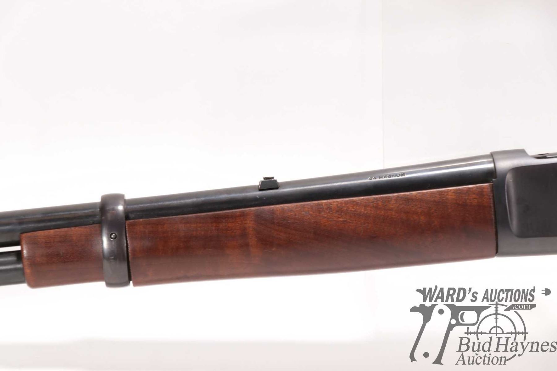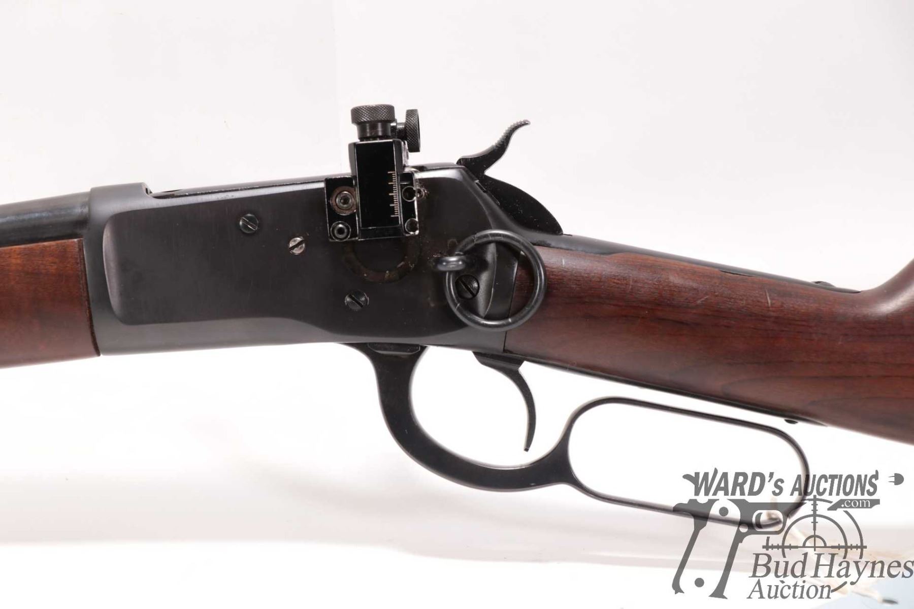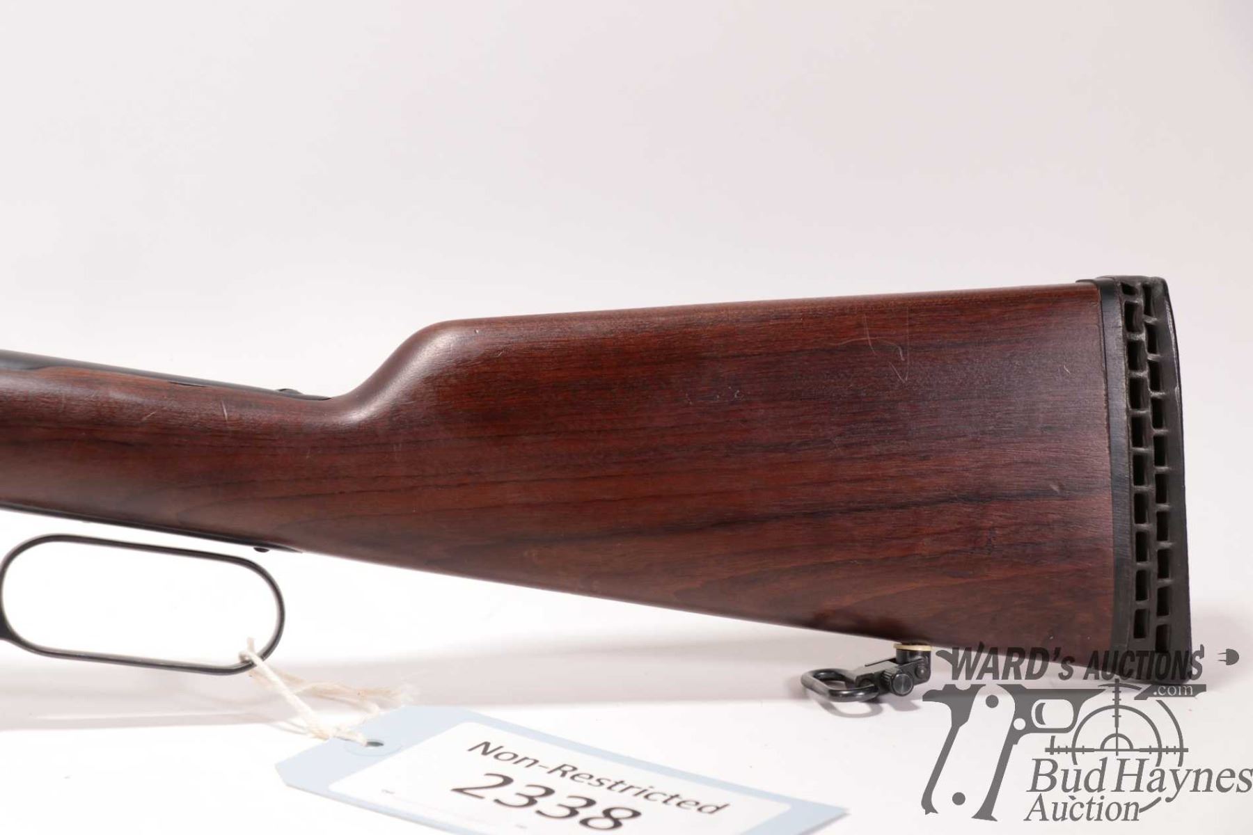 Non-Restricted rifle Rossi 44 Magnum lever action, w/ bbl length 20" [Blued barrel, receiver and full length tube. Fixed front sight. Original rear sight removed and fitted with adjustable peep sight. Smooth wooden stock with Uncle Mike's branded recoil pad. Fitted with sling mounts attached to stock and magazine tube. Mechanically appears to function reasonably well. Bluing worn in use and handling areas plus tooling marks on screws etc. plus other use, handling and storage marks.] serial # M013922, PAL required