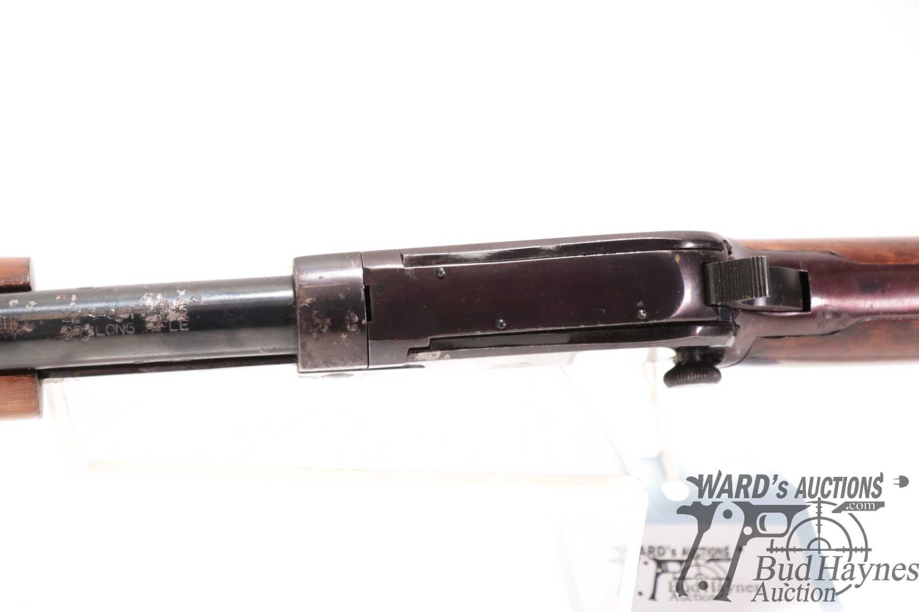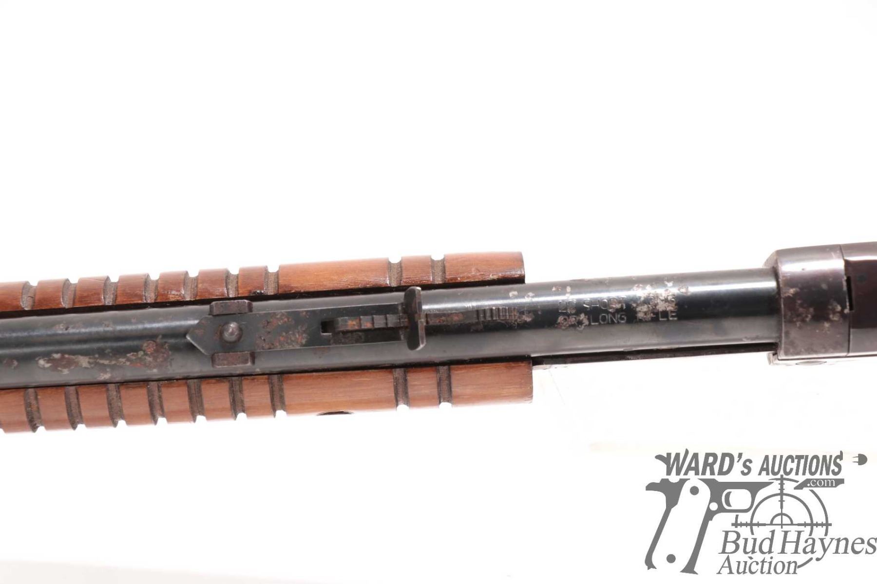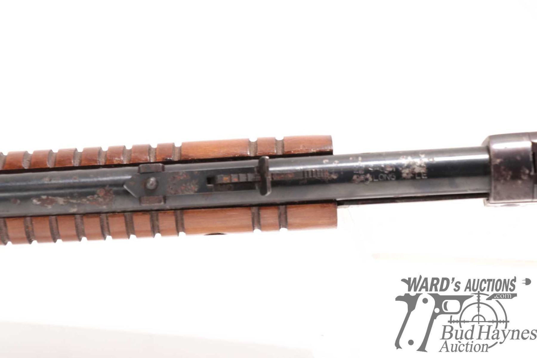 Non-Restricted rifle Rossi model Trombone, 22 S, L & LR pump action, w/ bbl length 23" [Blued barrel and receiver. Fixed front and adjustable rear sights. Tubular magazine. Smooth wooden stock with branded plastic butt plate. Mechanically appears to function well. Bluing worn in use and handling areas and some areas of heavy rust plus other use, handling and storage marks.] serial # G268559, PAL required