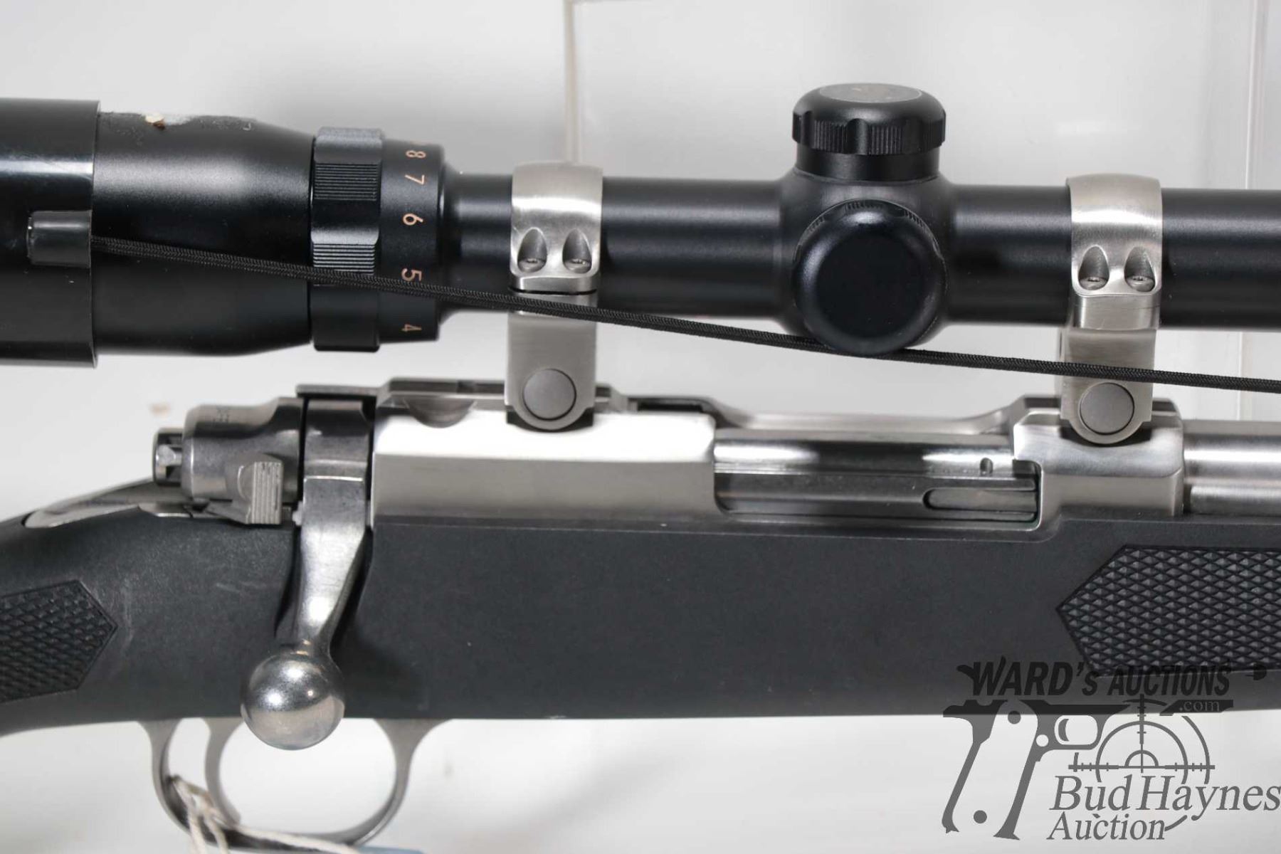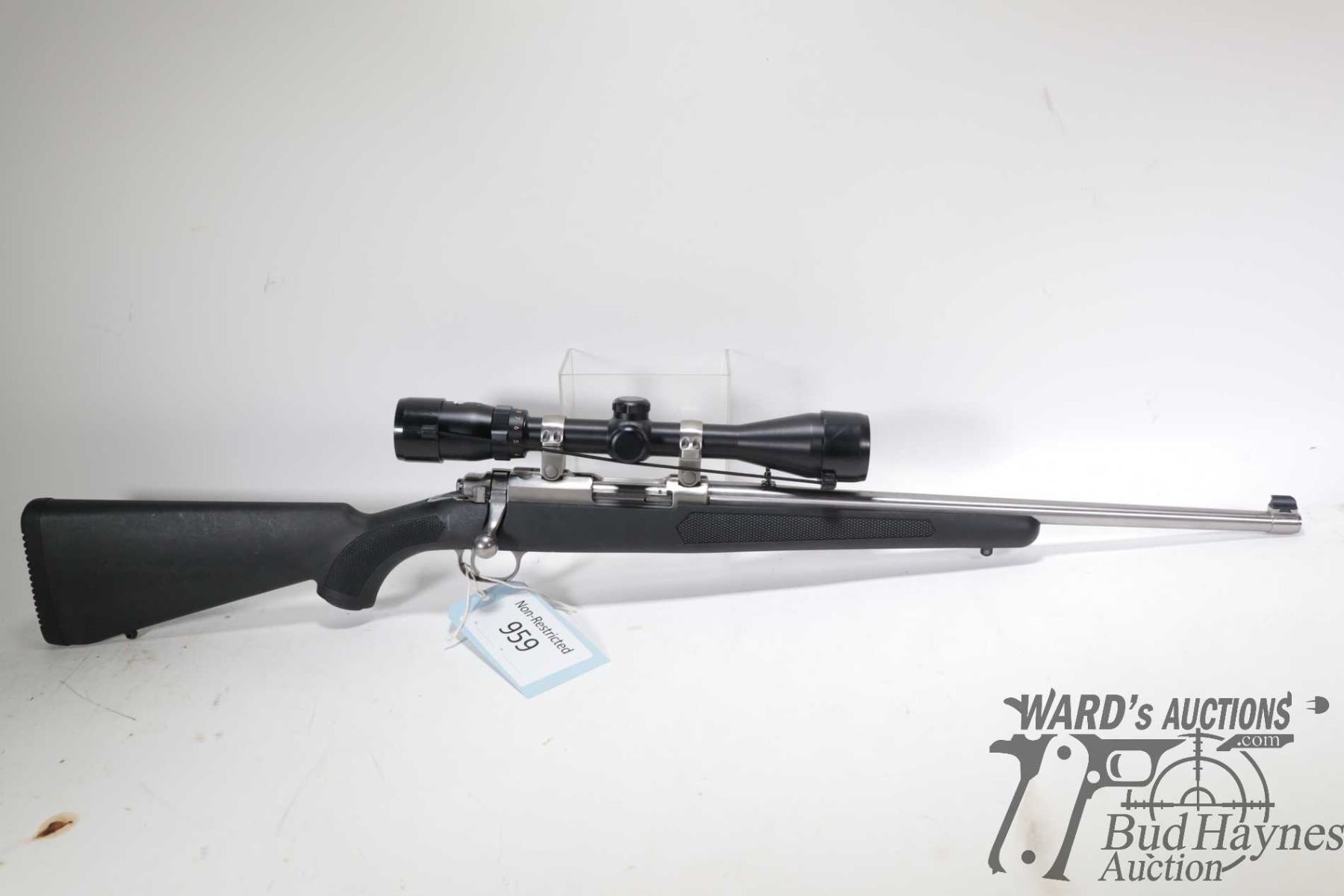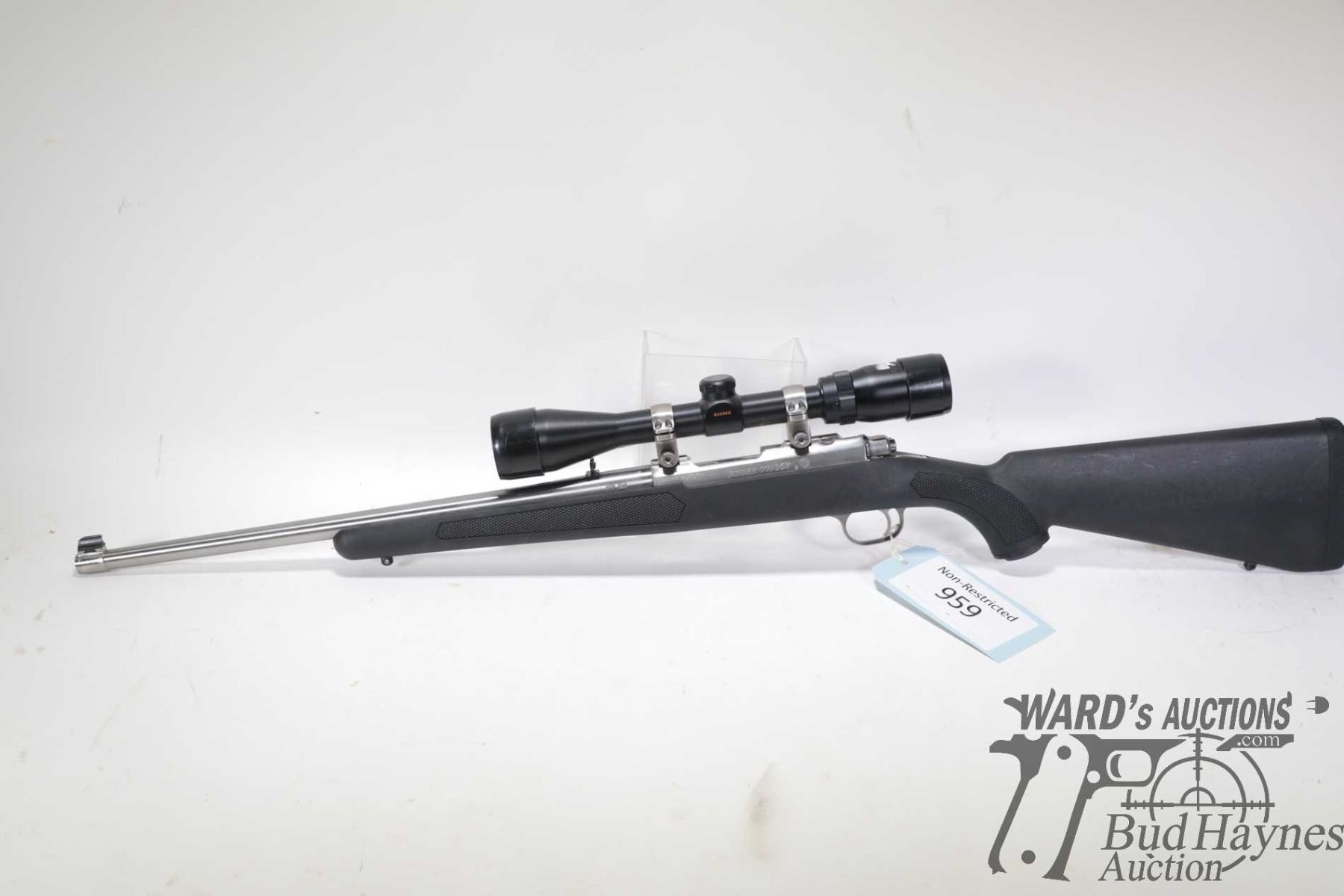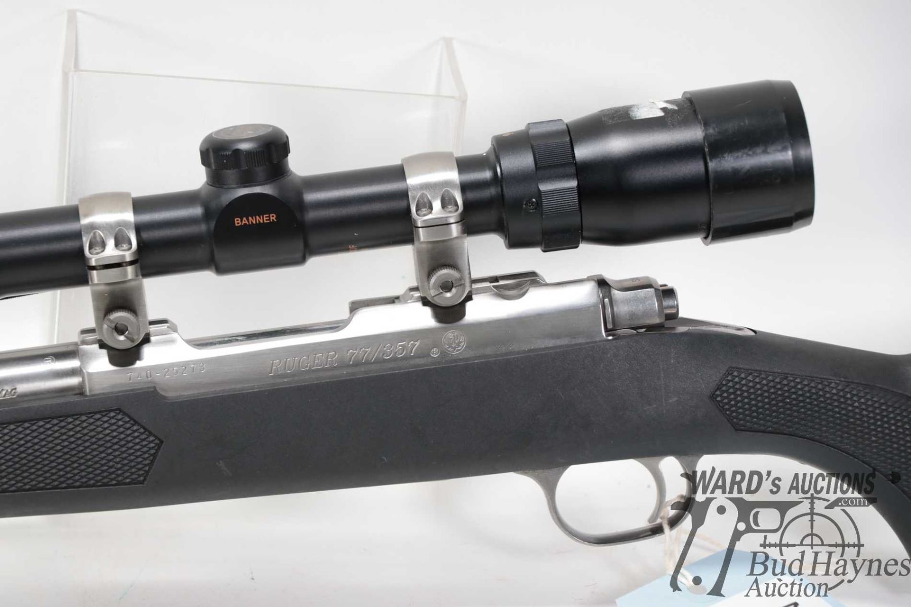 Non-Restricted rifle Ruger model 77/357, .357 Mag bolt action, w/ bbl length 18 1/2" [Stainless barrel and receiver. Fixed front and adjustable rear sights. Fitted with Bushnell Banner 3X-9X, 40 scope. Black polymer stock with recoil pad. No magazine included. Mechanically and aesthetically appear near excellent. Had only light use with only minor use, handling and storage marks.] serial # 74025273, PAL required