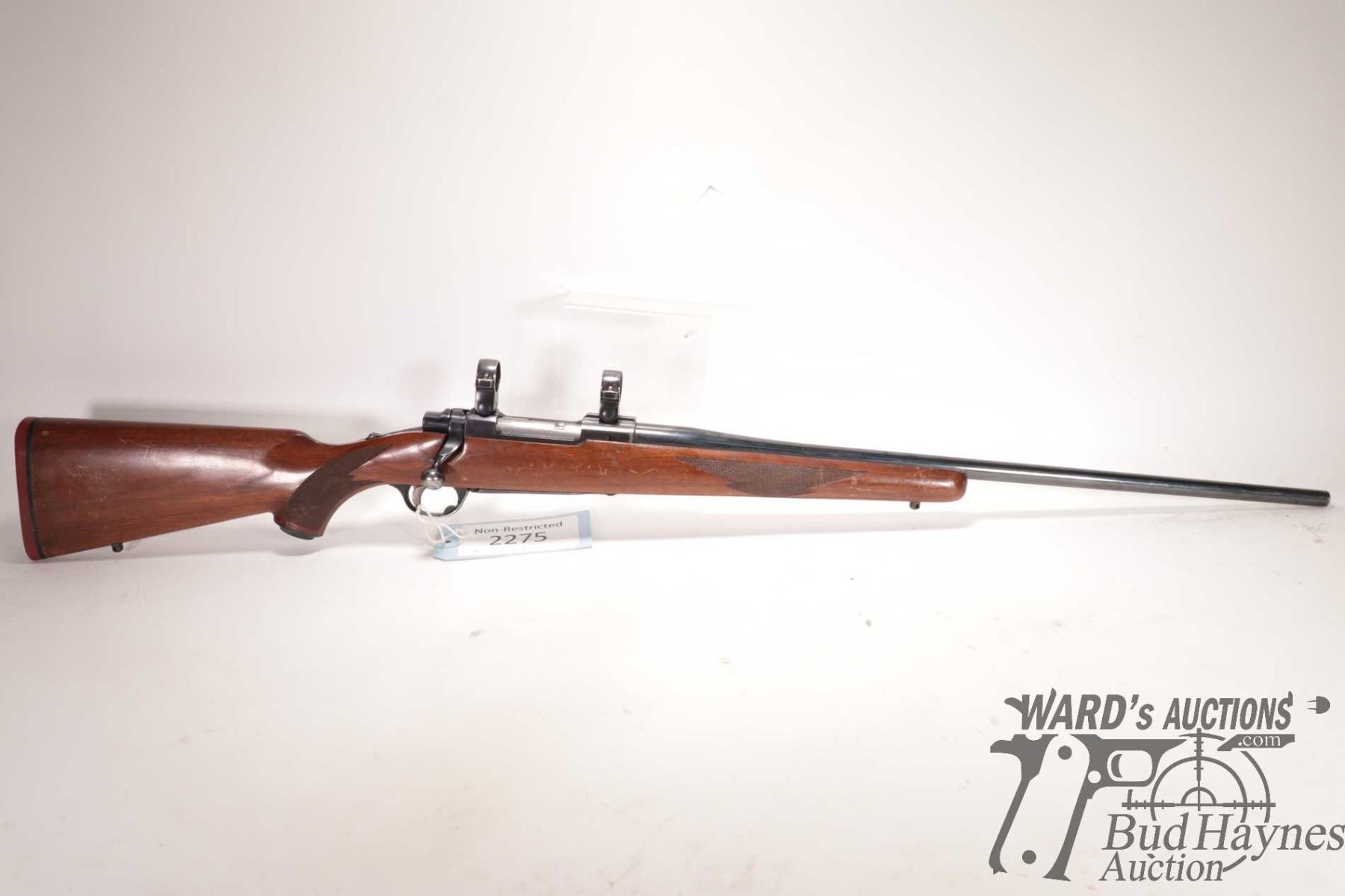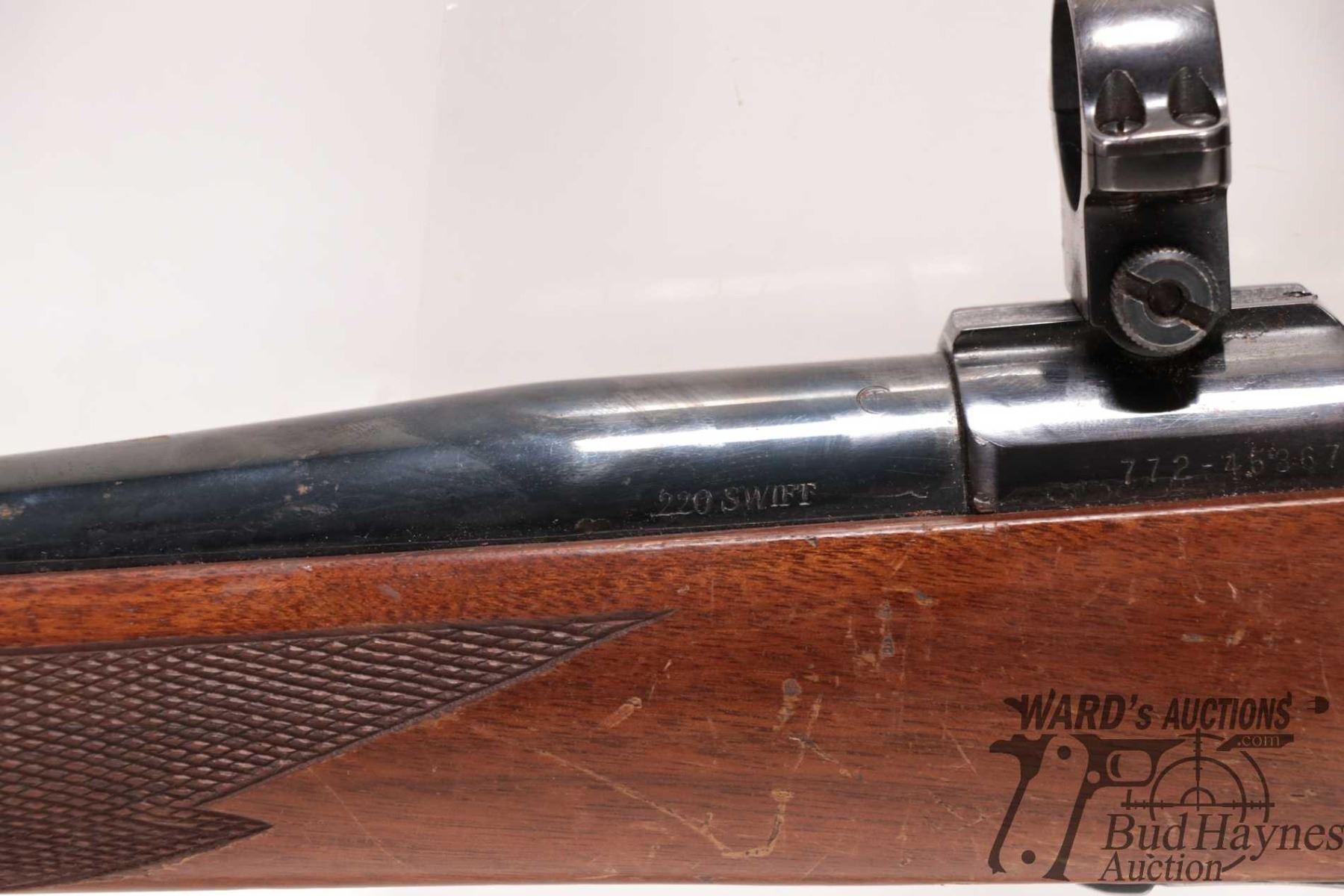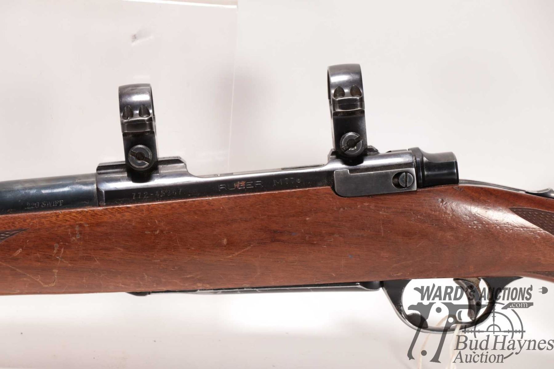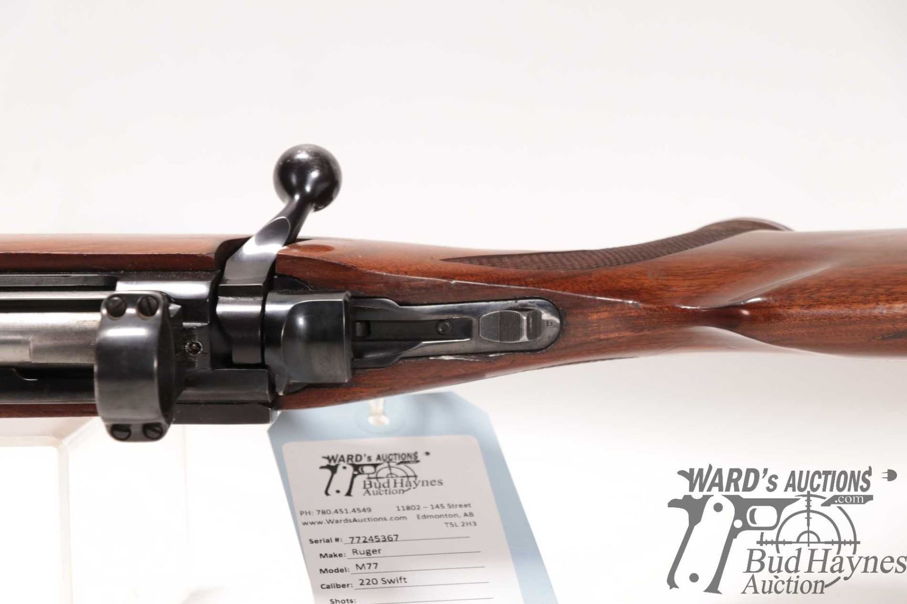 Non-Restricted rifle Ruger model M77, 220 Swift bolt action, w/ bbl length 24" [Blued barrel and receiver. No fixed sights. Fitted with 1" rings. Internal box magazine. Hardwood stock. Mechanically appears to function well. Bluing worn in use and handling areas. Receiver drilled and tapped for non Ruger scope mount. Some surface rust and pitting on metal. Nicks, dings and gouges and other use, handling and storage marks.] serial # 77245367, PAL required