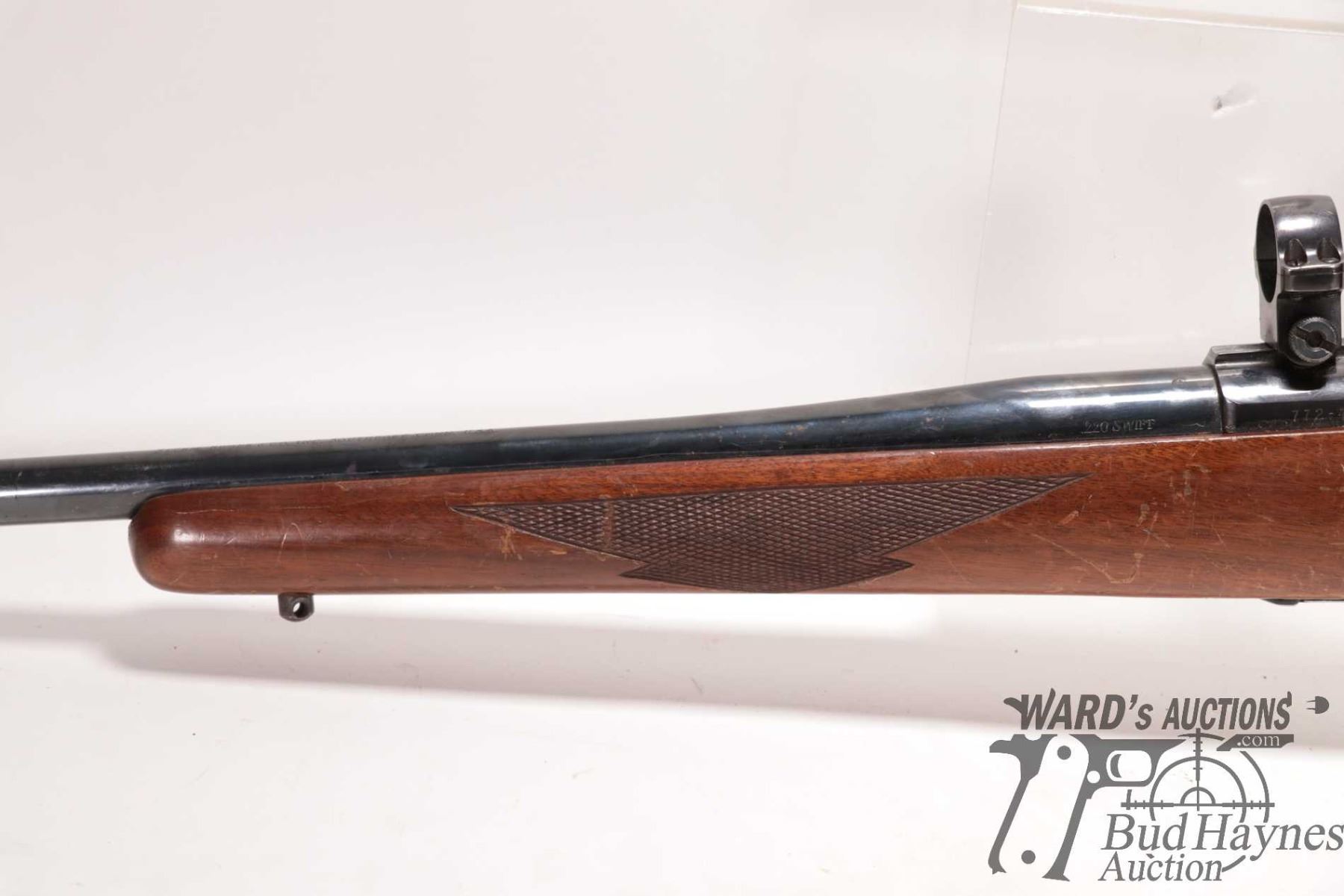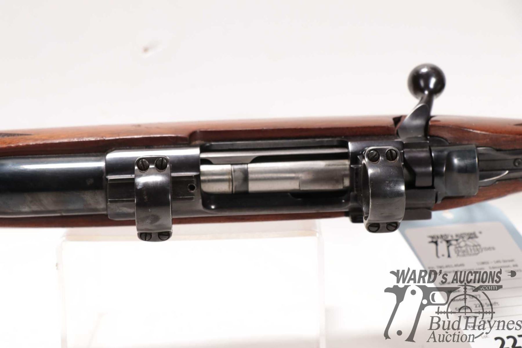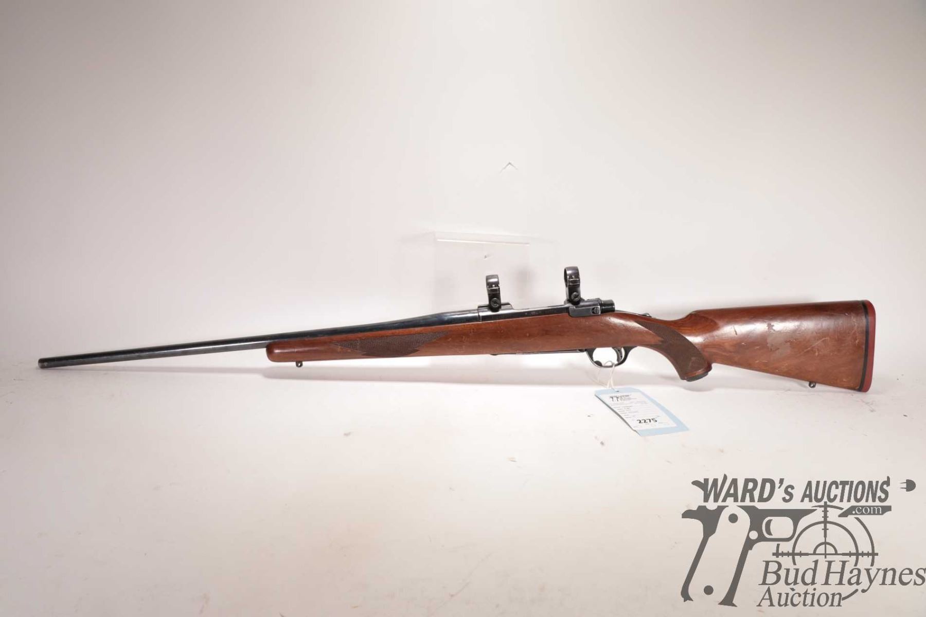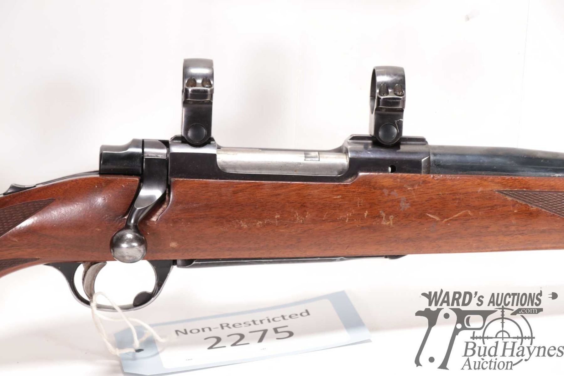 Non-Restricted rifle Ruger model M77, 220 Swift bolt action, w/ bbl length 24" [Blued barrel and receiver. No fixed sights. Fitted with 1" rings. Internal box magazine. Hardwood stock. Mechanically appears to function well. Bluing worn in use and handling areas. Receiver drilled and tapped for non Ruger scope mount. Some surface rust and pitting on metal. Nicks, dings and gouges and other use, handling and storage marks.] serial # 77245367, PAL required