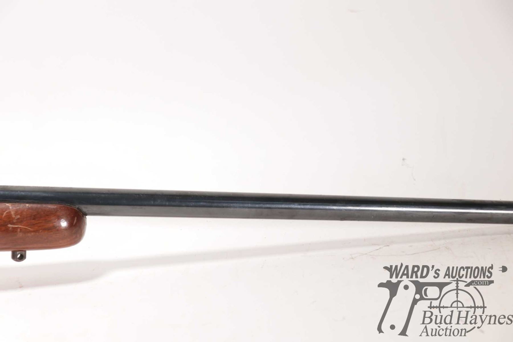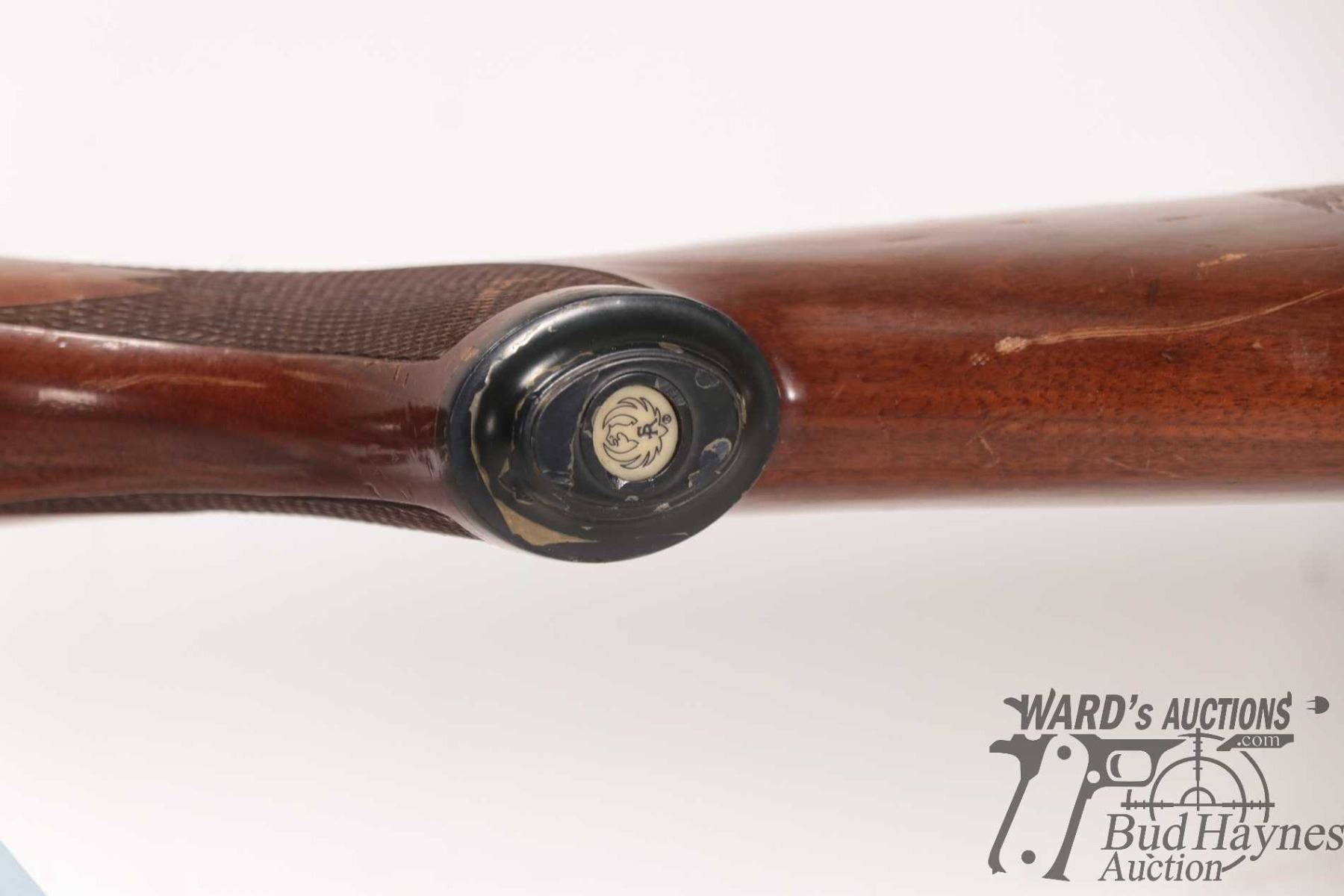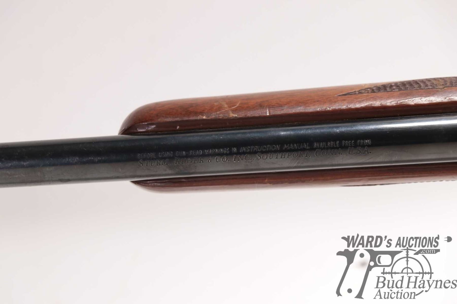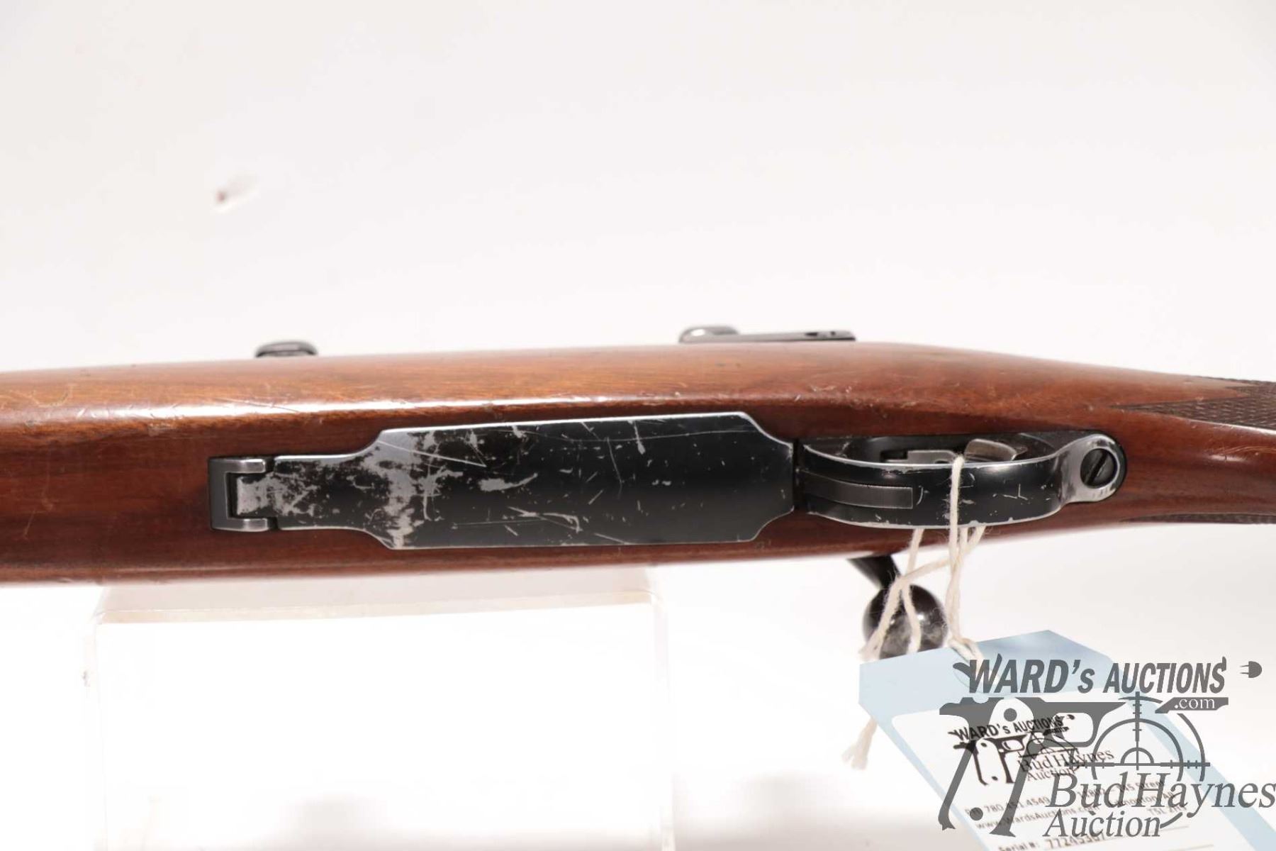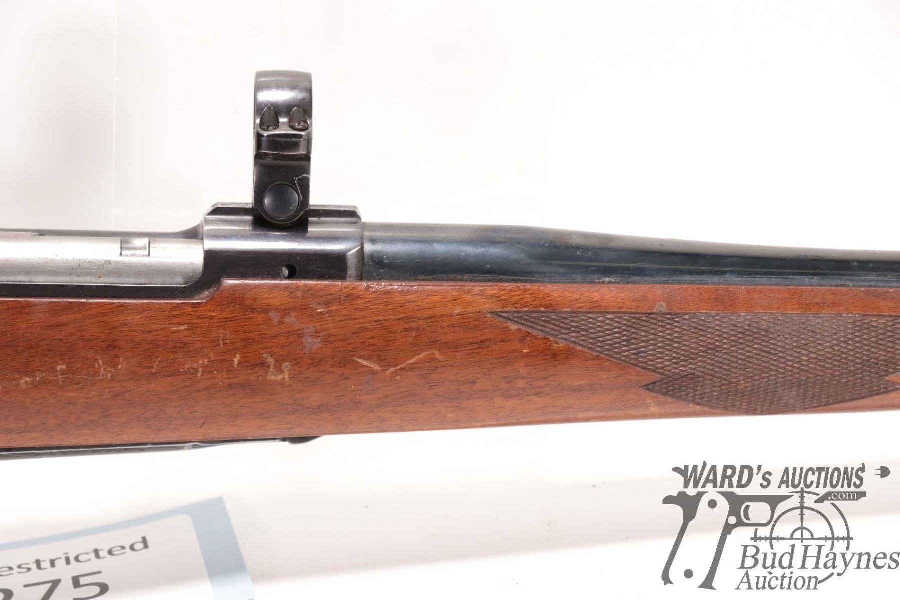 Non-Restricted rifle Ruger model M77, 220 Swift bolt action, w/ bbl length 24" [Blued barrel and receiver. No fixed sights. Fitted with 1" rings. Internal box magazine. Hardwood stock. Mechanically appears to function well. Bluing worn in use and handling areas. Receiver drilled and tapped for non Ruger scope mount. Some surface rust and pitting on metal. Nicks, dings and gouges and other use, handling and storage marks.] serial # 77245367, PAL required