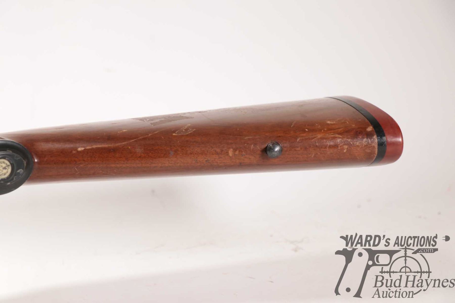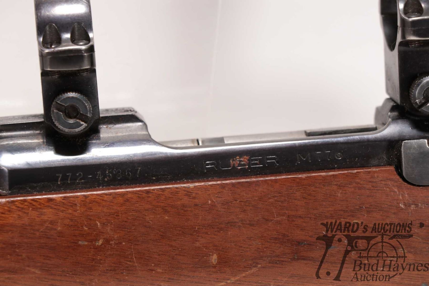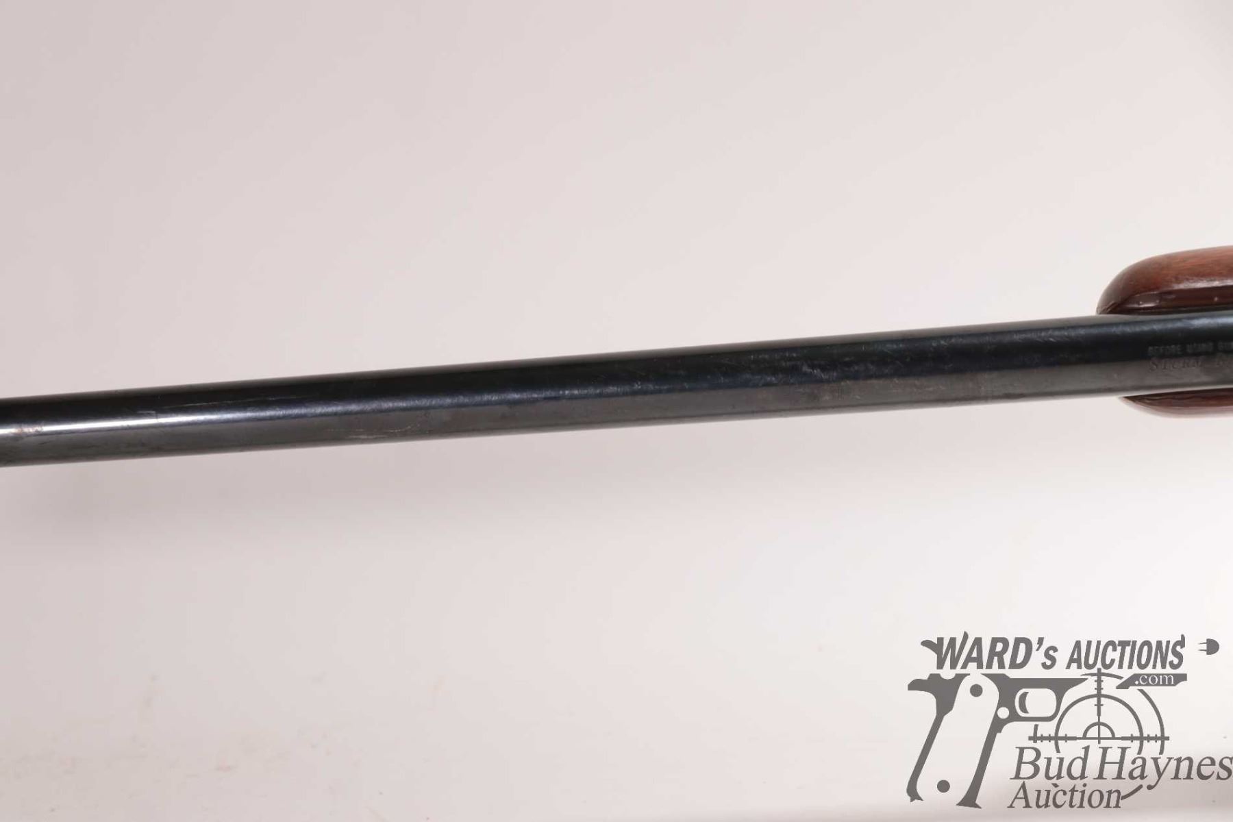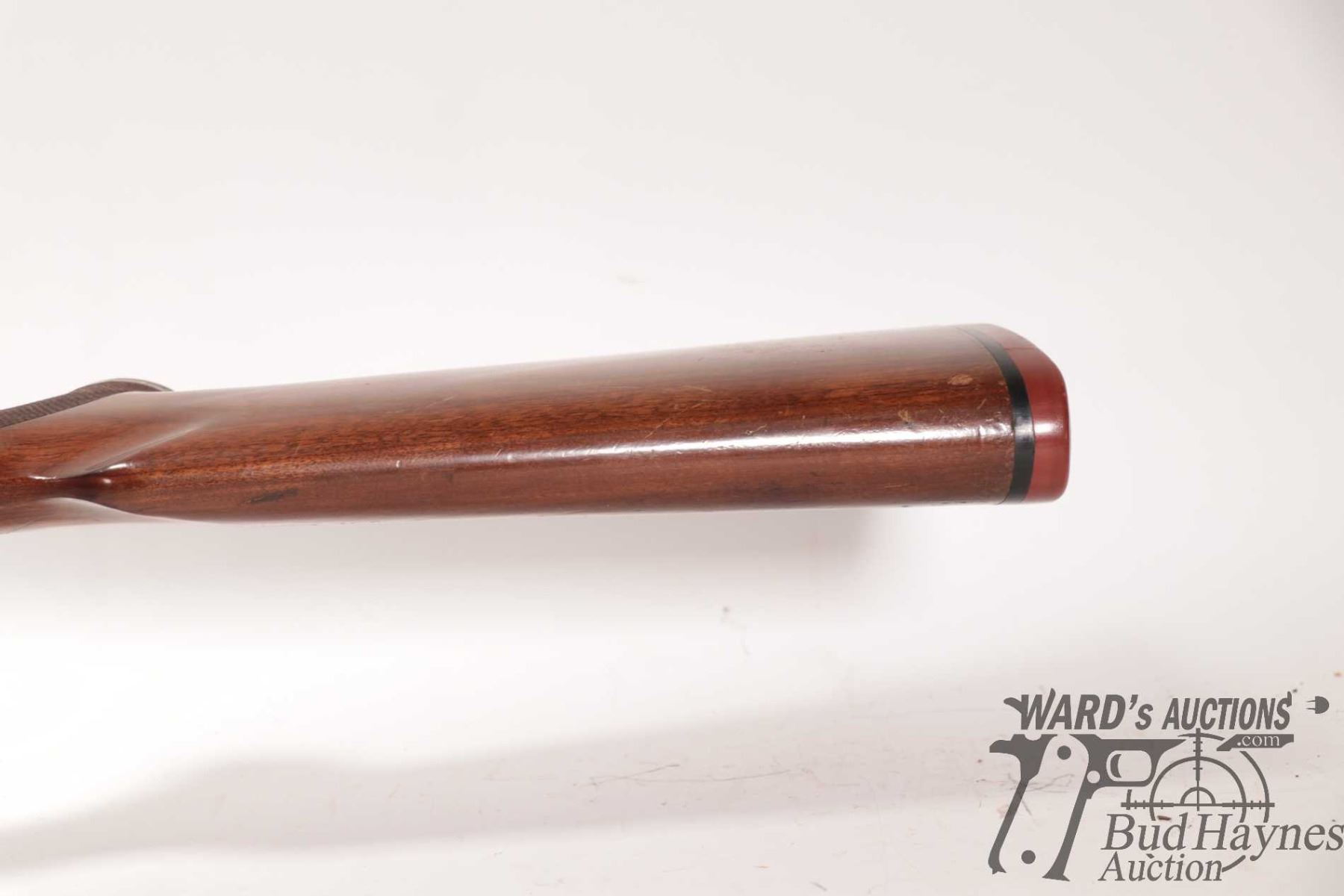 Non-Restricted rifle Ruger model M77, 220 Swift bolt action, w/ bbl length 24" [Blued barrel and receiver. No fixed sights. Fitted with 1" rings. Internal box magazine. Hardwood stock. Mechanically appears to function well. Bluing worn in use and handling areas. Receiver drilled and tapped for non Ruger scope mount. Some surface rust and pitting on metal. Nicks, dings and gouges and other use, handling and storage marks.] serial # 77245367, PAL required