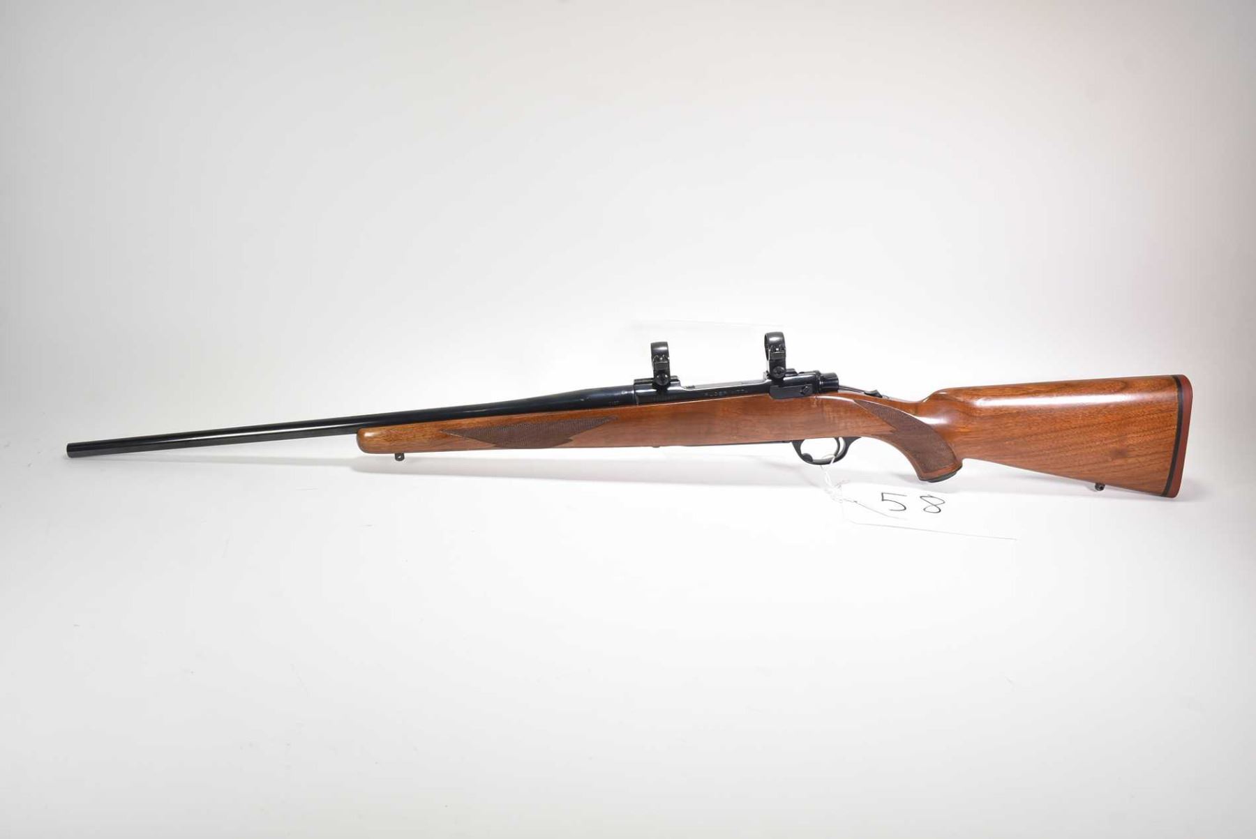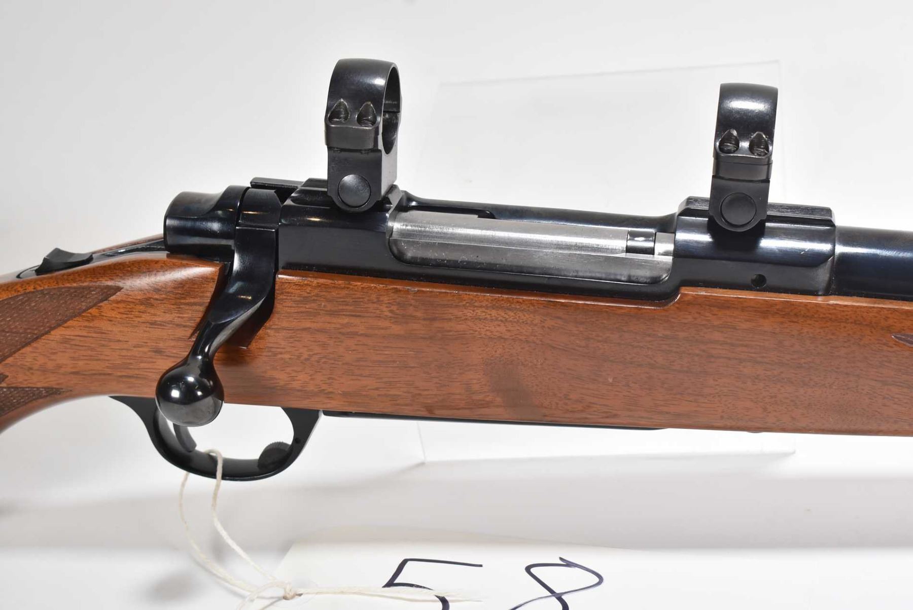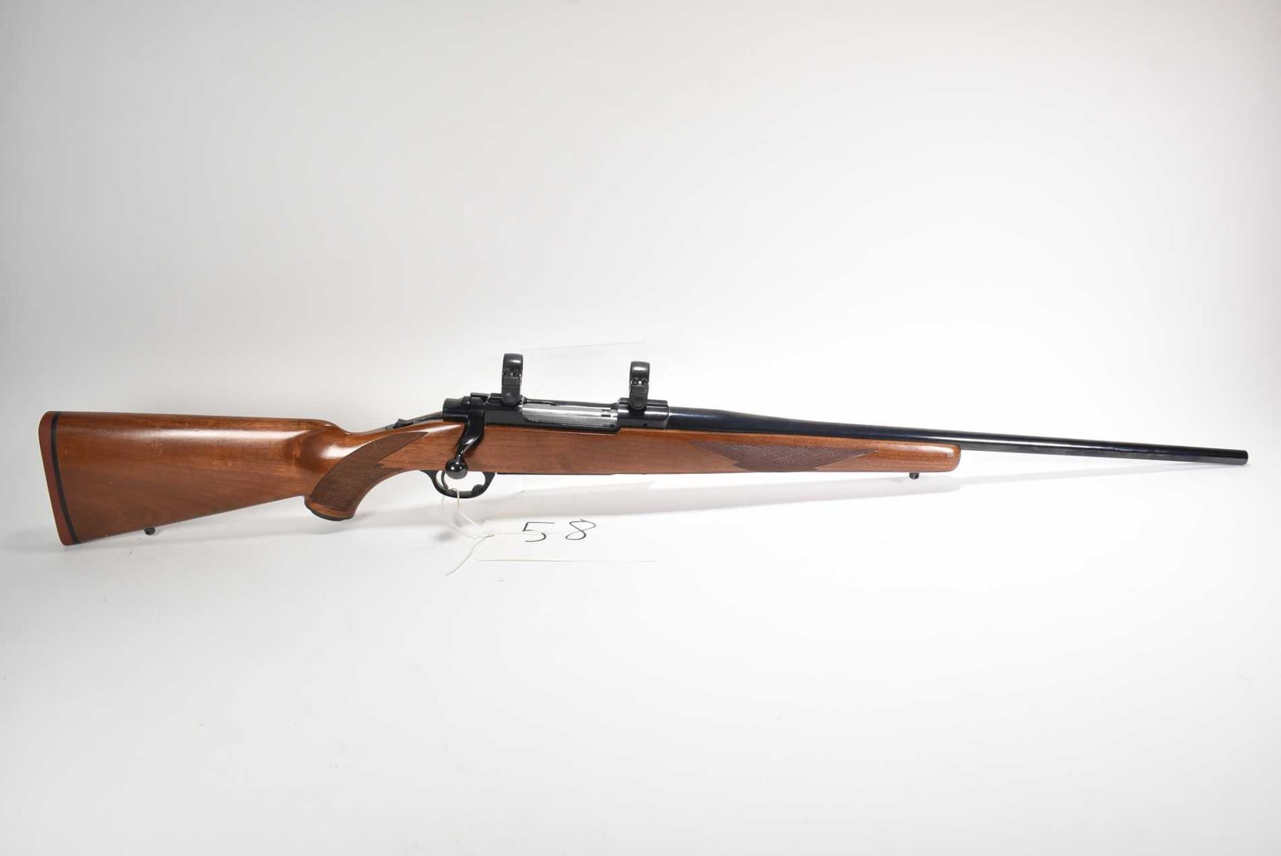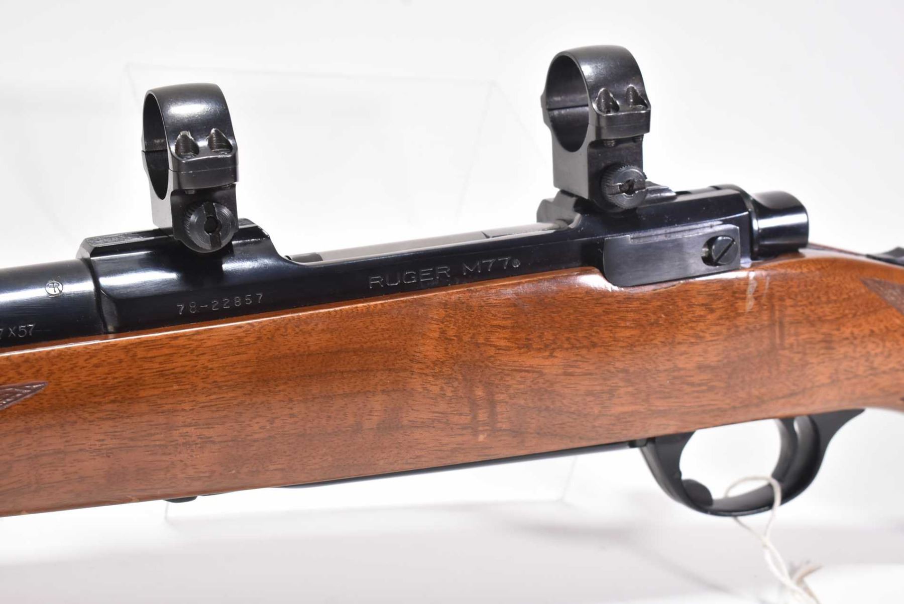 Non-Restricted rifle Ruger model M77, 7X57 Mauser bolt action, w/ bbl length 22" [Blued barrel and receiver. No fixed sights. Fitted with scope rings. Smooth wooden stock with checkered fore grip and pistol grip and rubber butt plate. Action feels smooth, nicks and marks to wood and metal. Storage, use and handling marks] serial # 7822857, PAL required