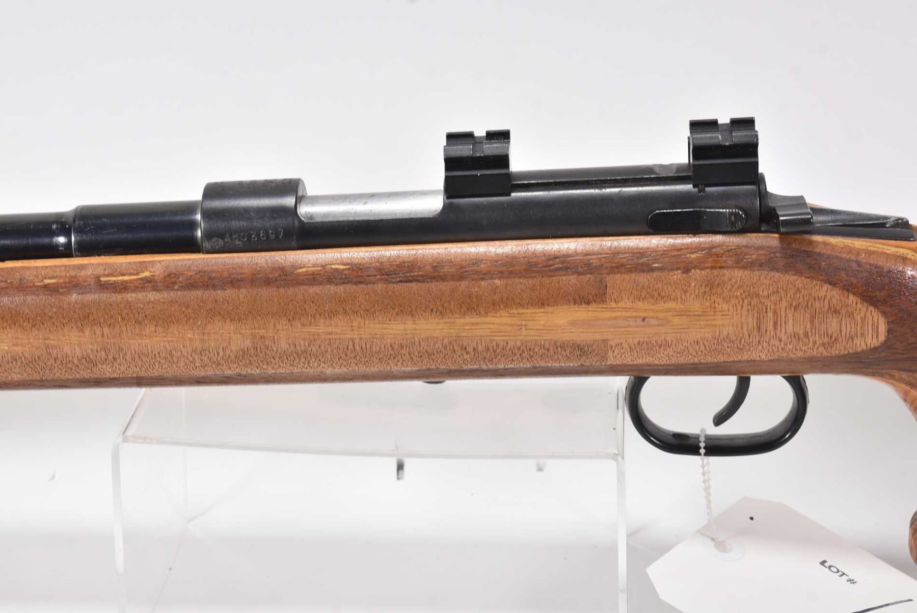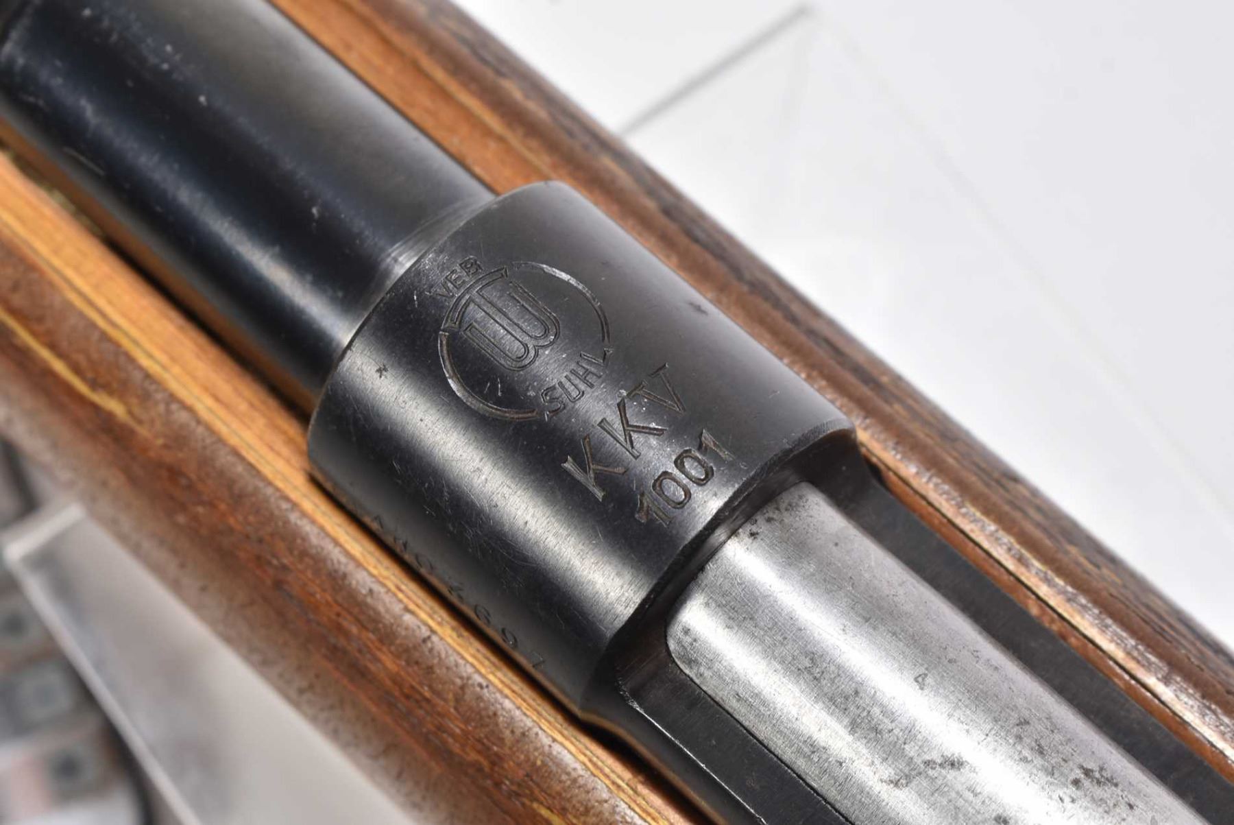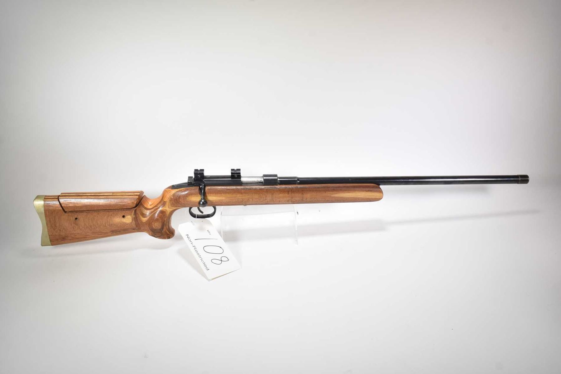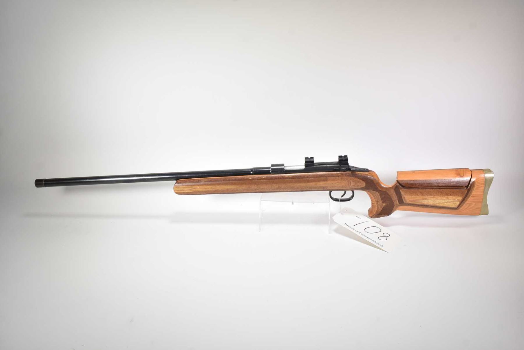 Non-Restricted rifle Suhl model KKv 1001, .22 LR 10 shot bolt action, w/ bbl length 24" [Blued barrel and receiver, no fixed sights. Fitted with scope bases. Shop made target stock with adjustable cheek rise, metal butt plate. Includes one KKV marked removable magazine. Action feels smooth, storage use and handling marks on wood and metal.] serial # 03697, PAL required