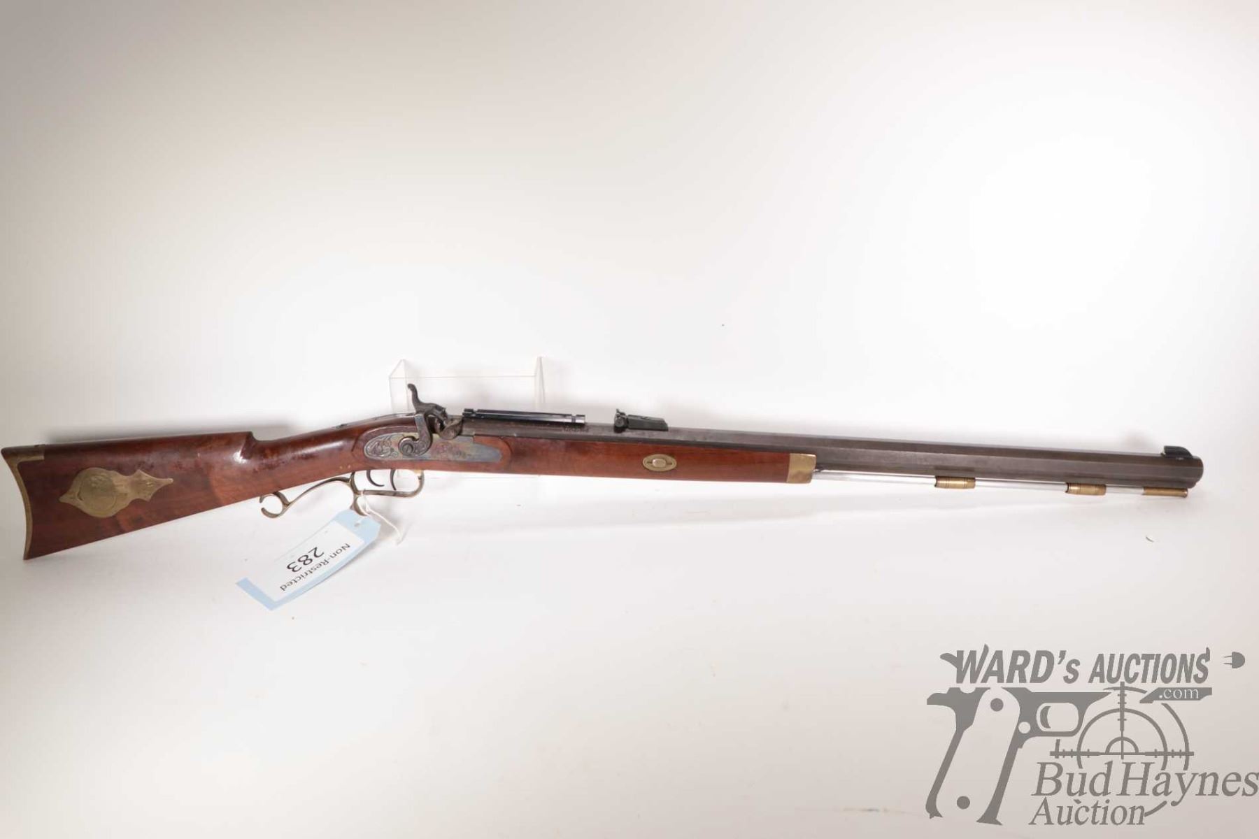 Non-Restricted rifle Thompson/Center Arms model Hawken Repro., .54 cal Single Shot muzzle loader, w/ bbl length 28" [Blued octagonal barrel turned gray. Fixed front and adjustable rear sights. Fitted with scope base. Half length smooth wooden stock. Curved brass butt plate. Fixed cheek riser. Some surface rust around nipple and rear of barrel. Includes ramrod. Fitted with set trigger. Mechanically appears to function reasonably well. Other use, handling and storage marks on wood and metal.] serial # K237460, PAL required