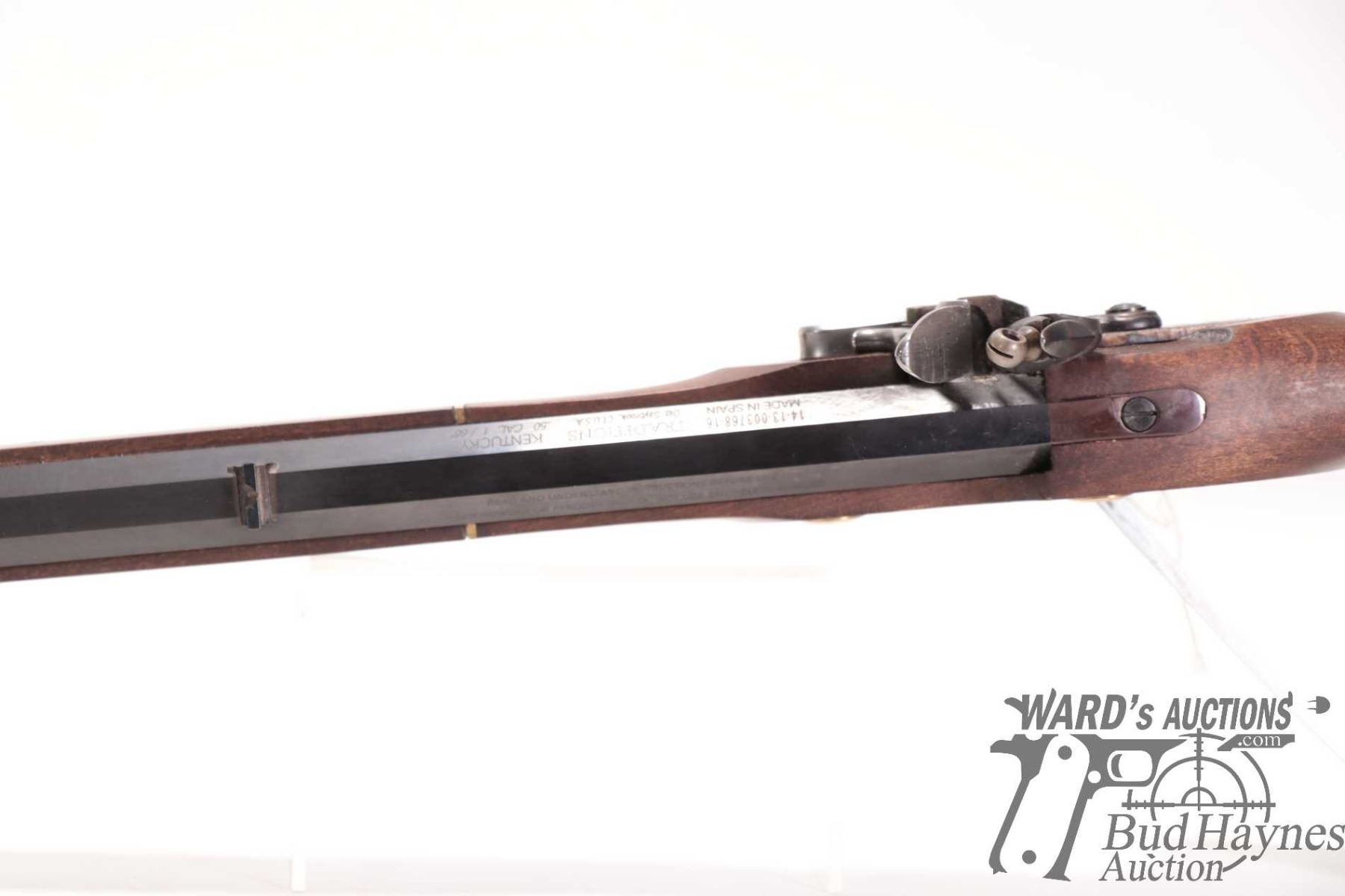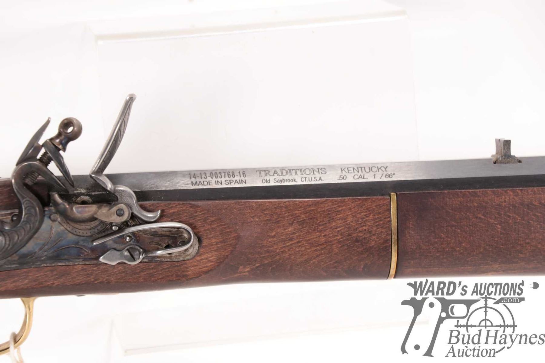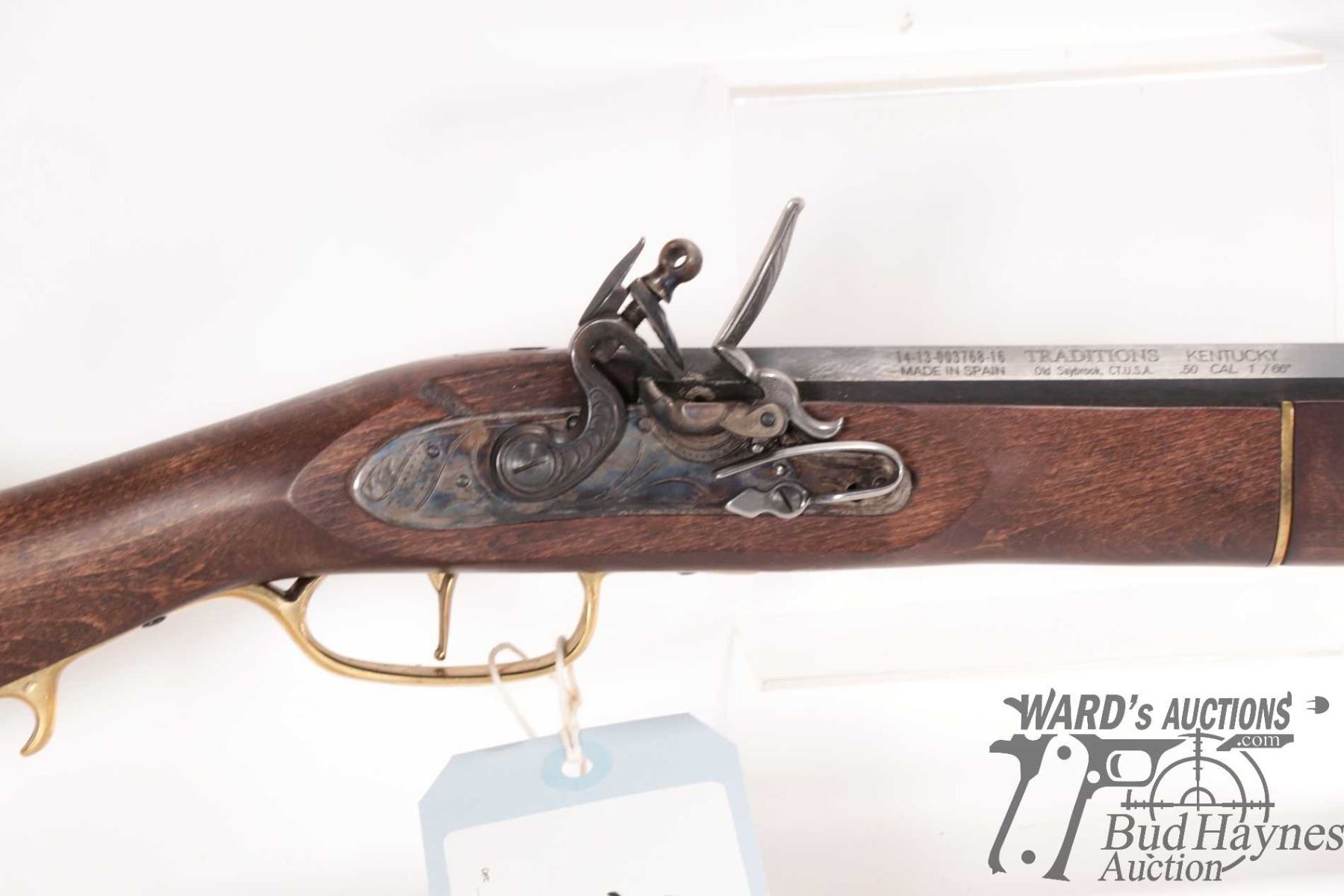 Non-Restricted rifle Traditions model Kentucky, 50 cal flintlock Single shot muzzle loading, w/ bbl length 33" [Blued octagonal barrel. Fixed front and rear sights. Full length wooden stock with brass butt plate, trigger guard and other accents. Includes manual. Mechanically and aesthetically appear near excellent with only minor use, handling and storage marks.] serial # 141300376816, PAL required