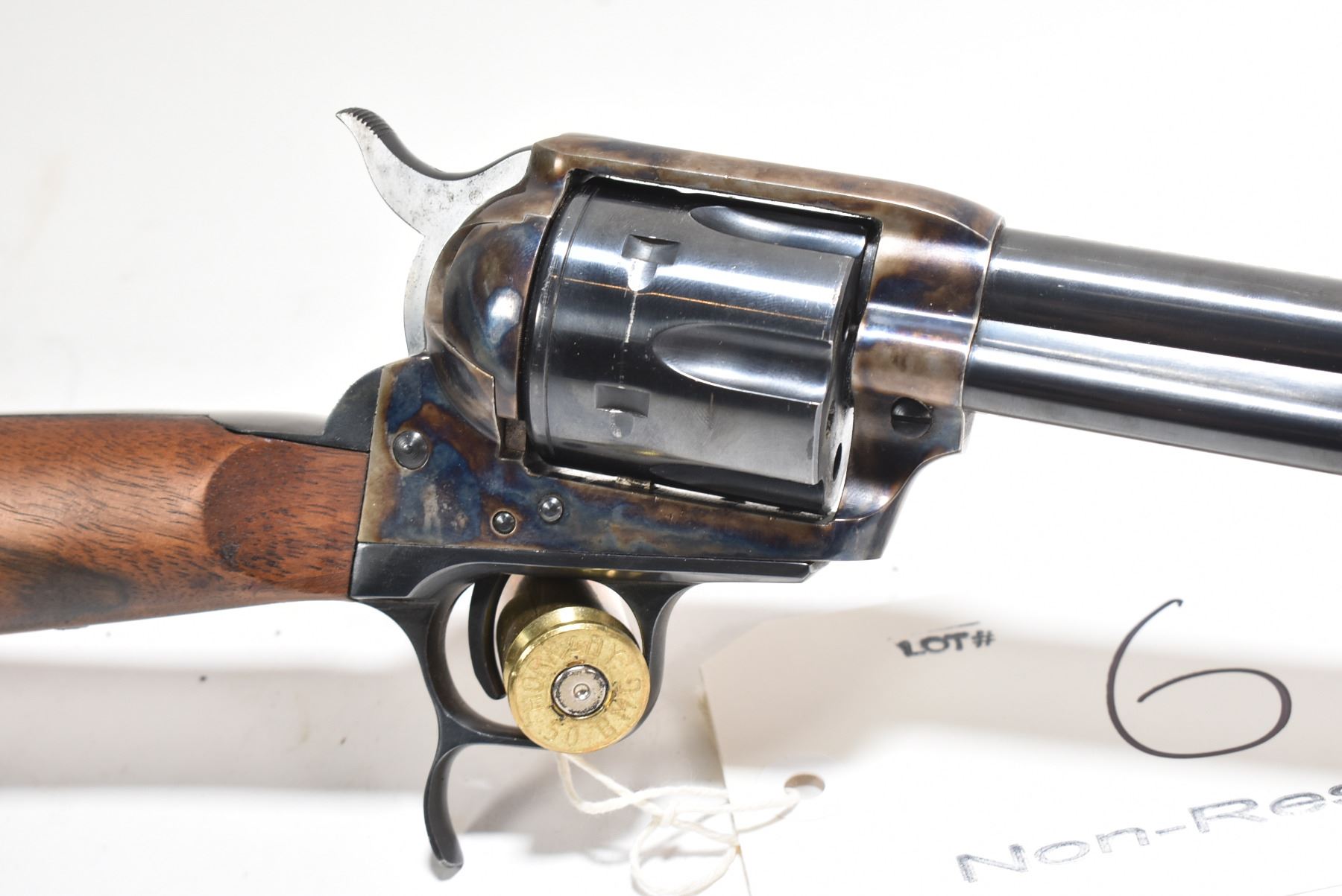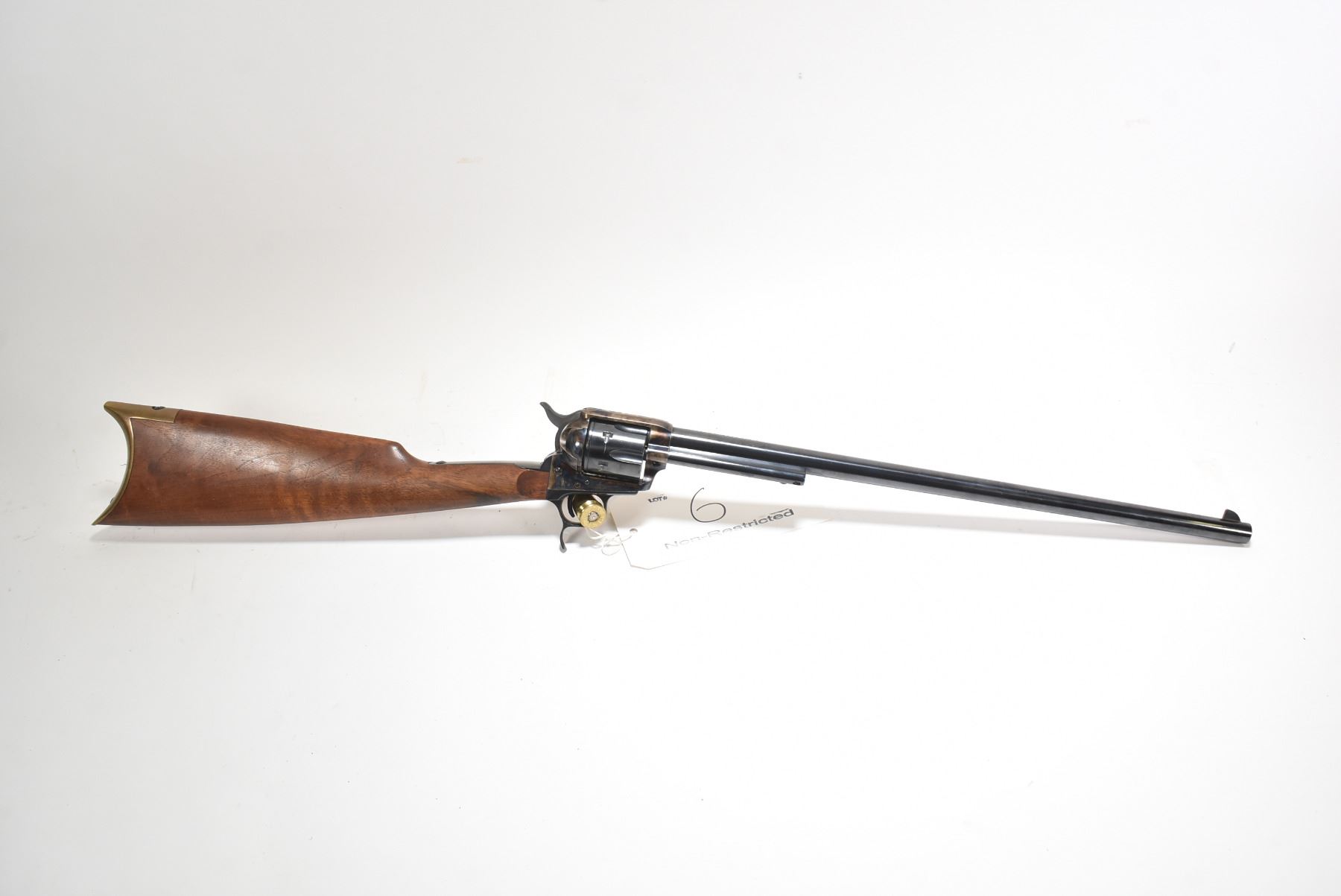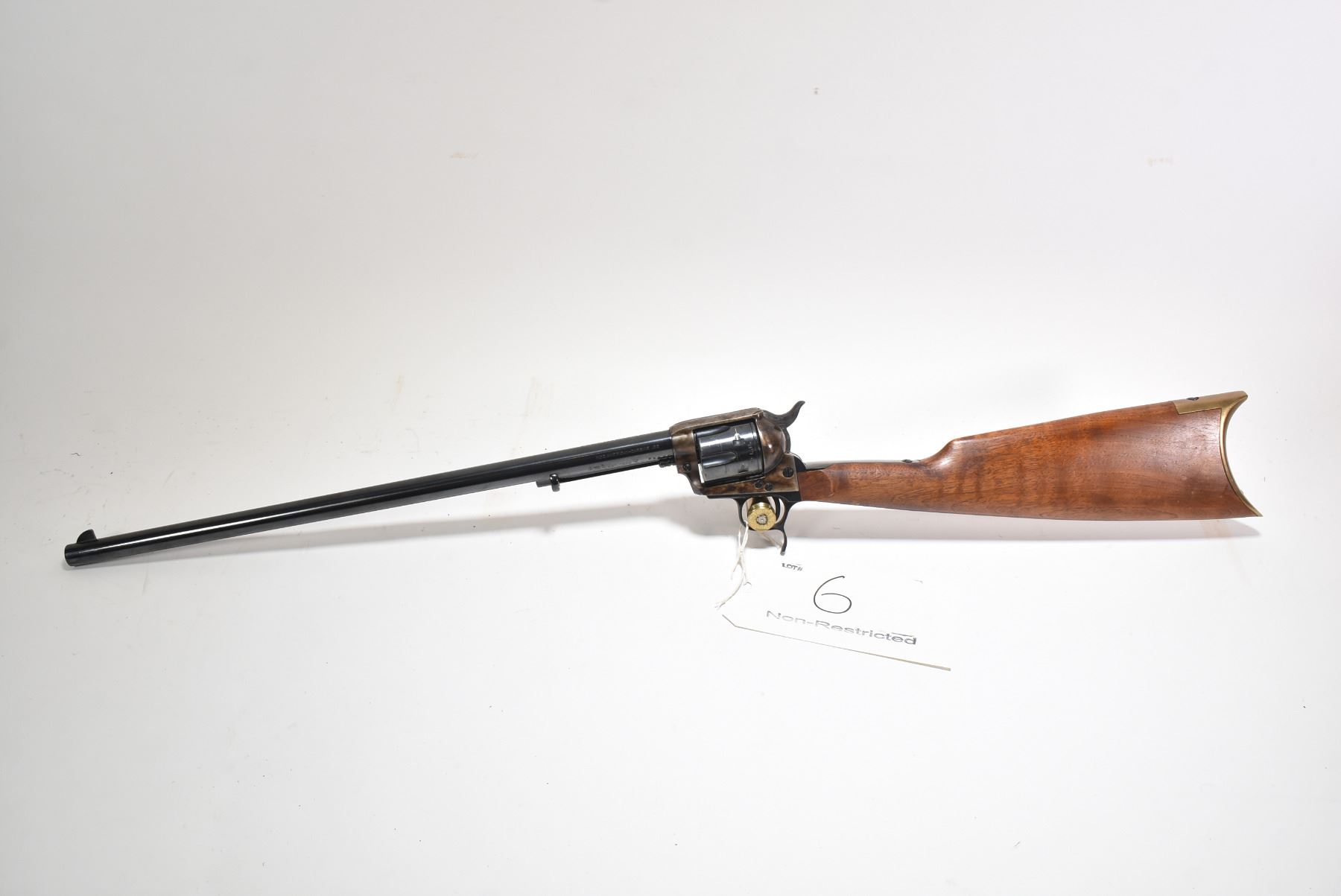 Non-Restricted rifle Uberti model 1873 Cattleman Carbine, .22 LR six shot single action revolver, w/ bbl length 18" [Blued barrel and cylinder, case hardened receiver. Fixed sights. Wooden stock with brass butt plate. Slight cylinder ring, Appears to have had very little use with only minor storage and handling marks.] serial # 59690, PAL required