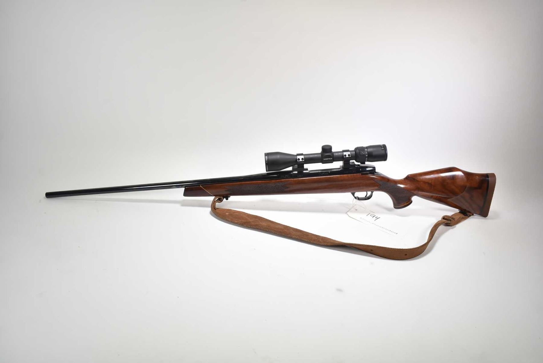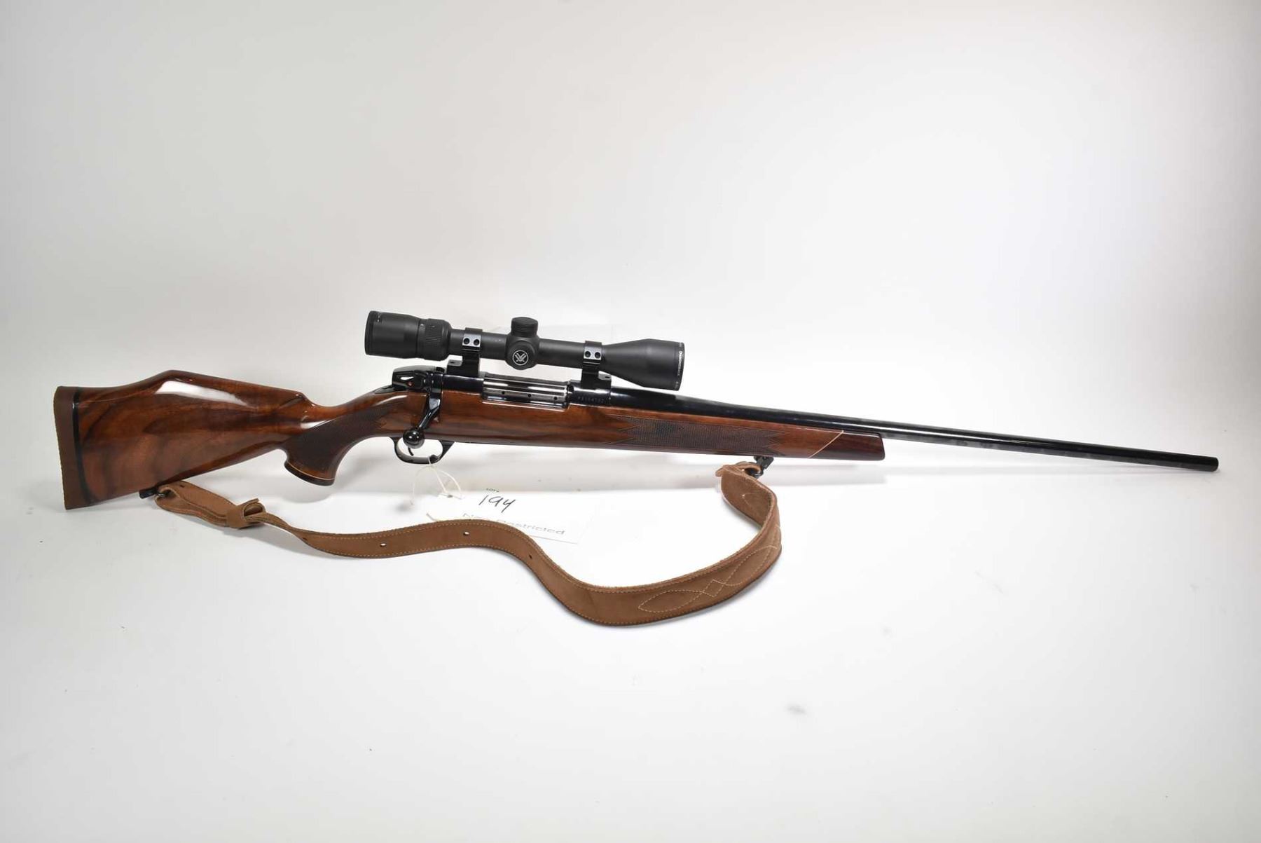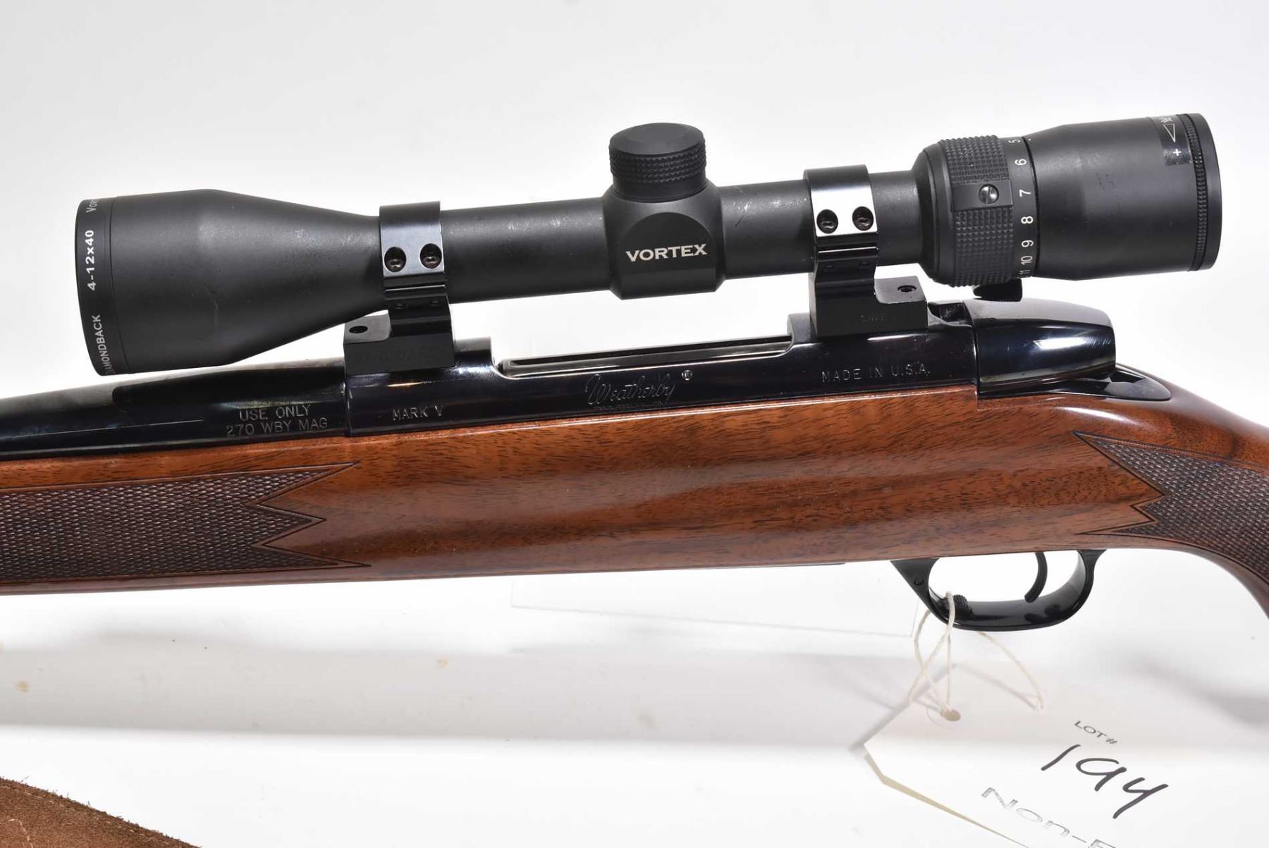 Non-Restricted rifle Weatherby model Mk V, 270 WBY mag three shot bolt action, w/ bbl length 26 1/2" [Blued barrel and receiver. Fitted with Vortex 4-12X40 Diamond Back scope. High gloss laminated wooden stock with checkered pistol grip and forend. Branded rubber butt plate. Includes leather sling with rings. Overall light used condition with nicks and marks to wood and metal. Storage, used and handling marks] serial # PB 034762, PAL required