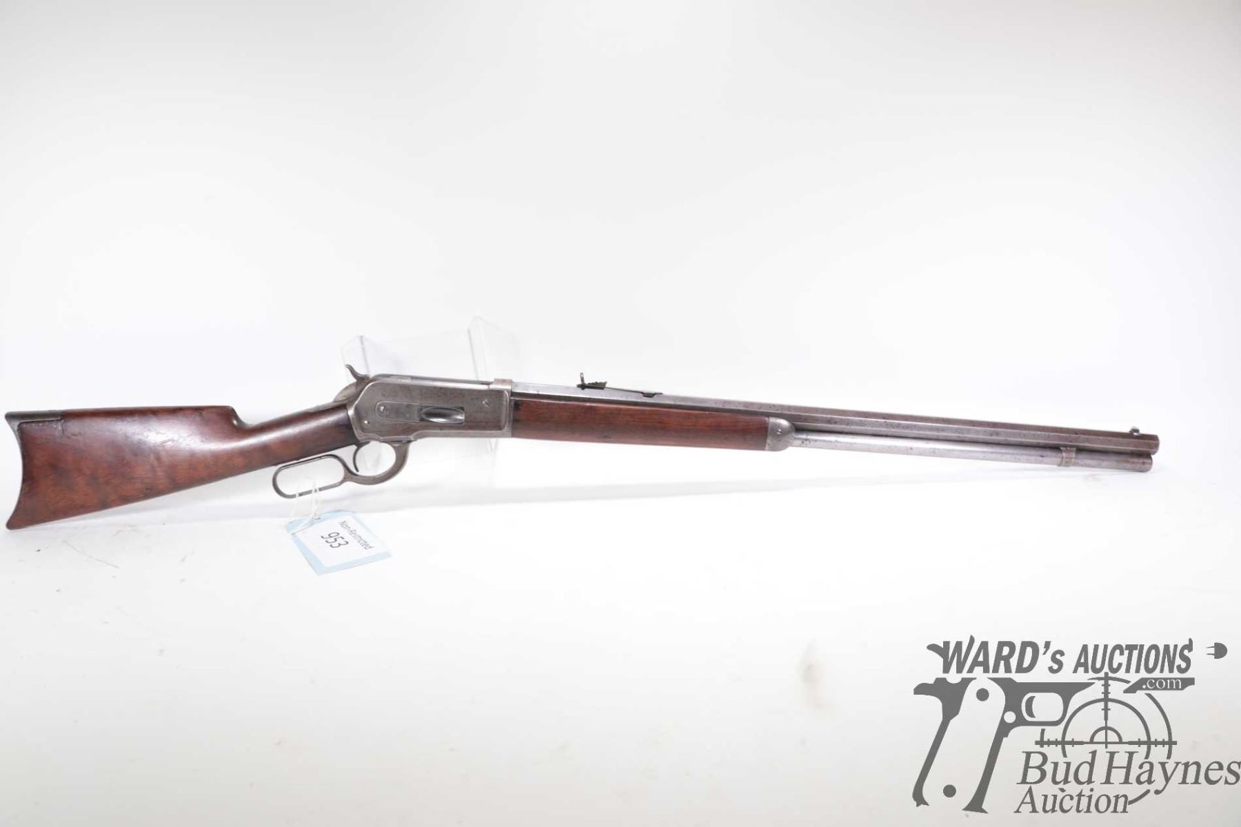 Non-Restricted rifle Winchester model 1886, 40-82 WCF lever action, w/ bbl length 26" [Blued octagonal barrel, receiver and full length tube. Fixed front and elevation adjustable rear sights. Smooth straight wooden stock with curved metal butt plate. Action functions reasonably well, albeit a bit stiff. repairs Most bluing is worn. Some surface rust and pitting. Small cracks to stock and forend. Nicks and dings and other use, handling and storage marks.] serial # 72590, PAL required
